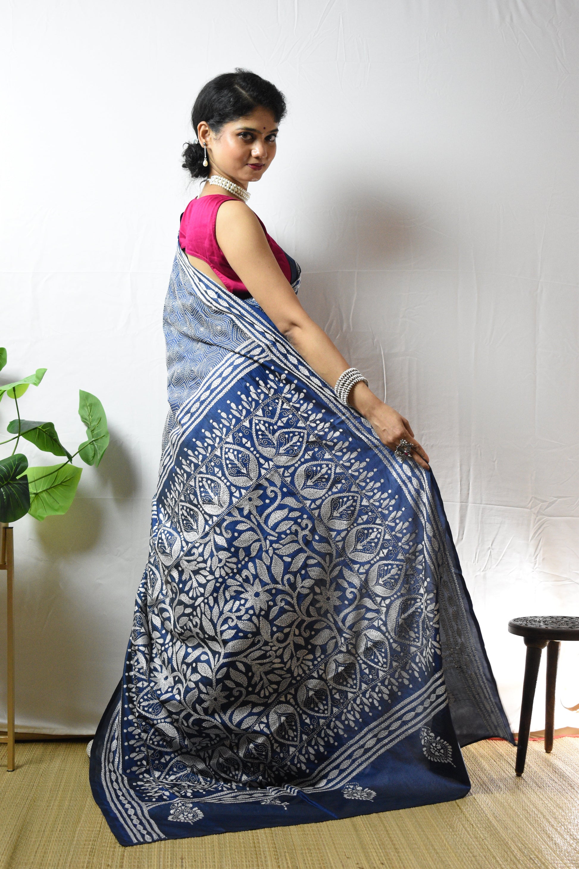 Discover the intricate beauty of our hand-embroidered Prussian Blue Geometrical Hand Embroidered Kantha Silk Saree. Each piece is individually crafted by our talented women artisans using traditional kantha stitching and delicate kantha embroidery, turning fine silk into a one-of-a-kind artwork. The Prussian palette is lifted with white threadwork along the border and pallu, elegant, timeless, and unmistakably handmade. A saree not just to wear, but to treasure, as art, as memory, as legacy.