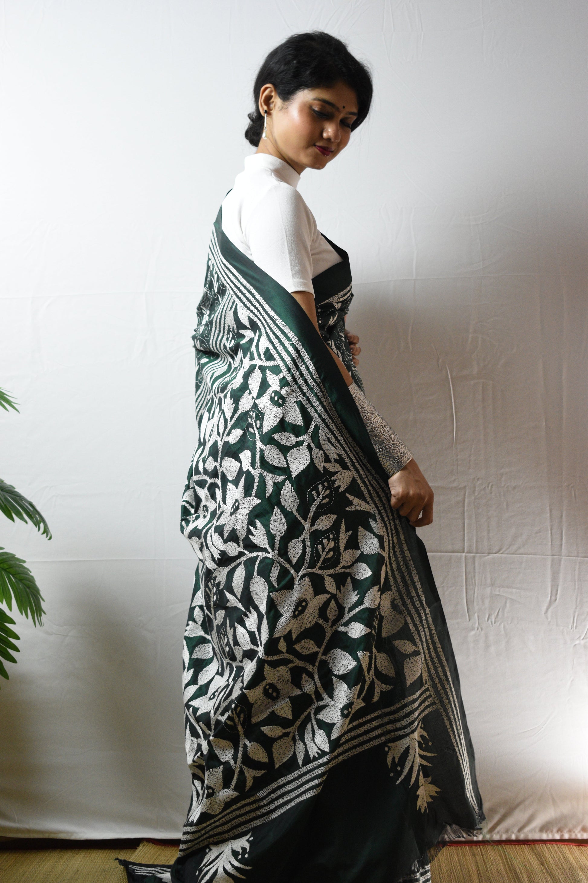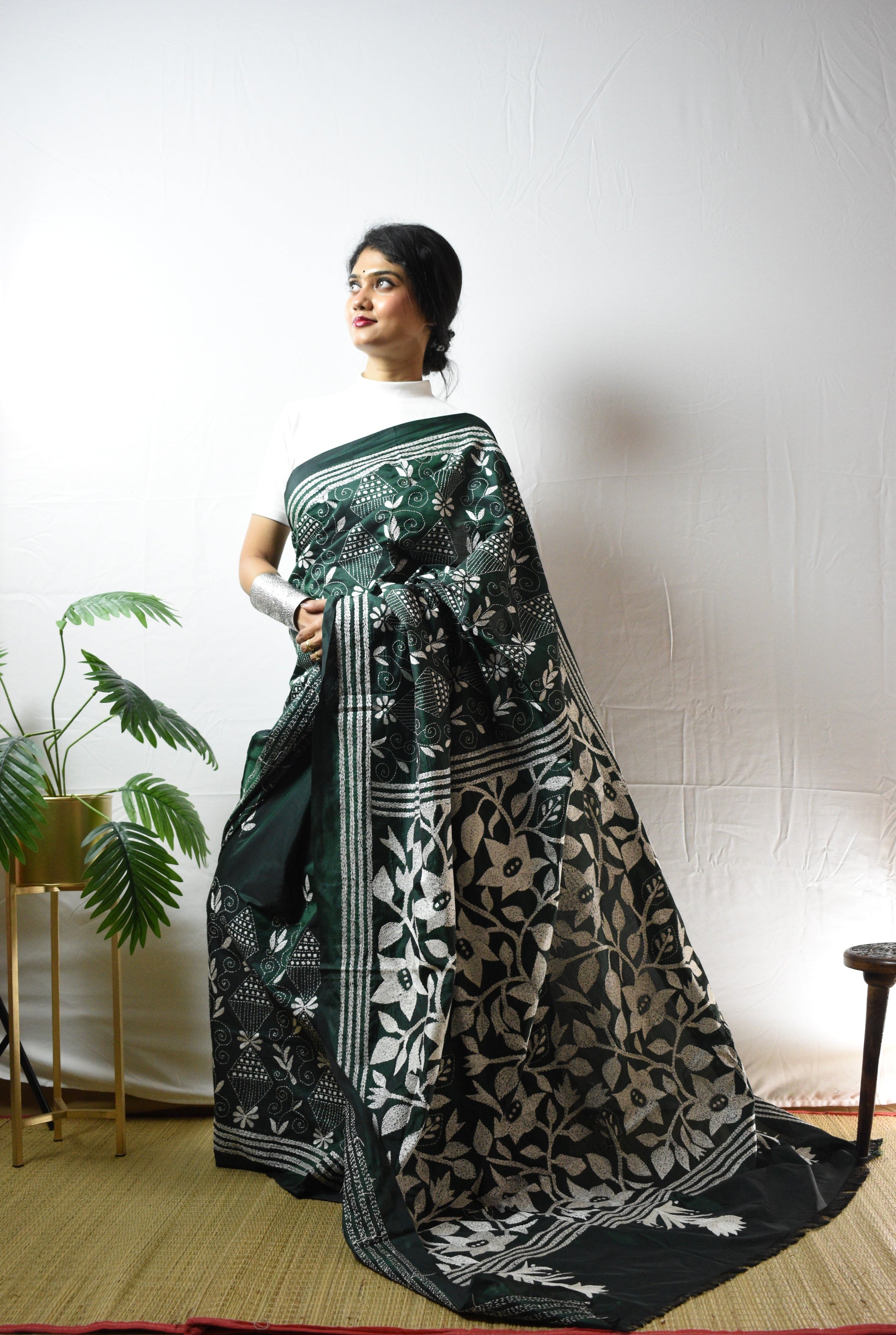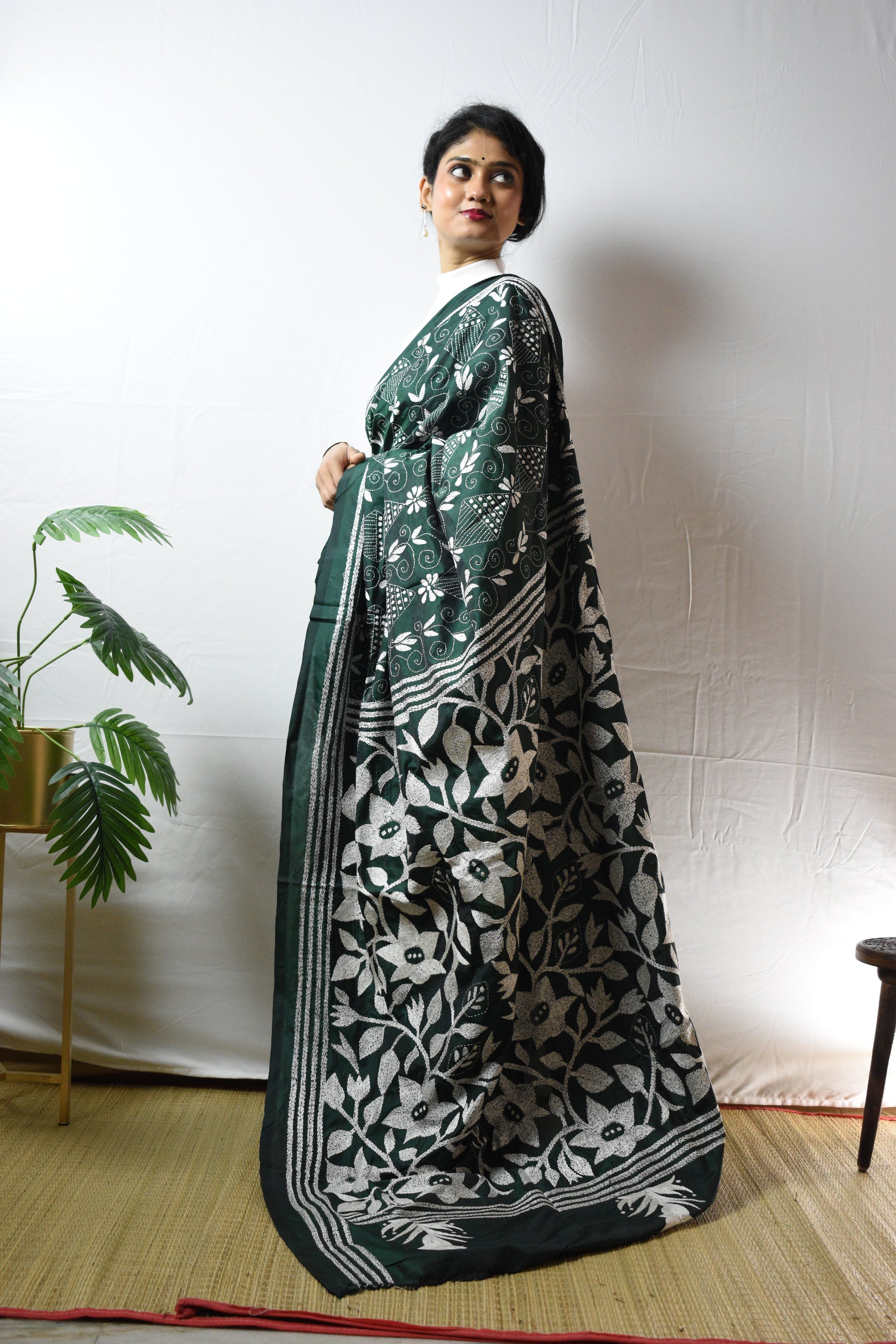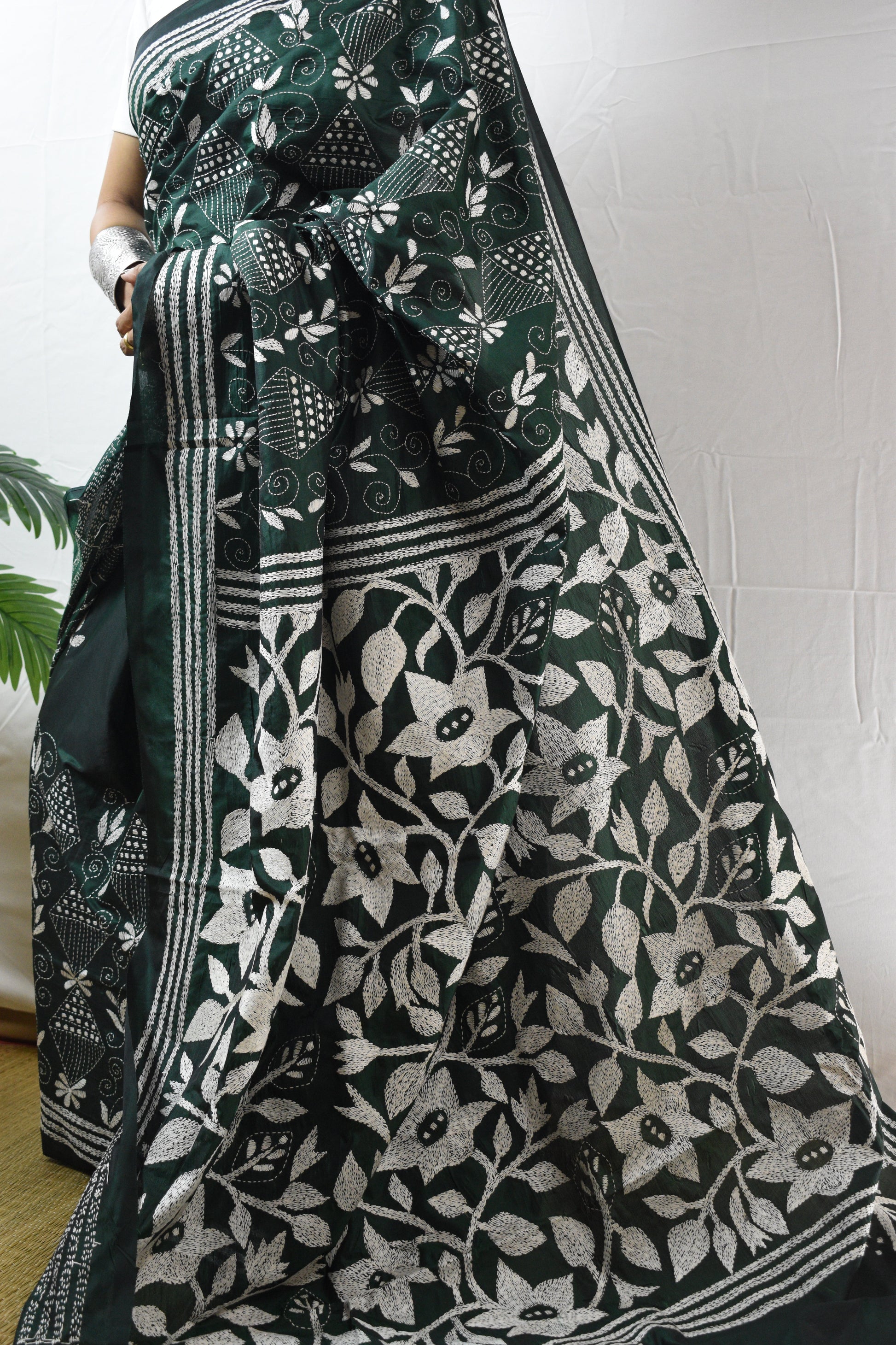 Discover the intricate beauty of our hand-embroidered Forest Green Floral Hand Embroidered Kantha Silk Saree . Each piece is individually crafted by our talented women artisans using traditional kantha stitching and delicate kantha embroidery, turning fine silk into a one-of-a-kind artwork. This premium Green is lifted with White threadwork along the border and pallu, elegant, timeless, and unmistakably handmade. A saree not just to wear, but to treasure, as art, as memory, as legacy.
