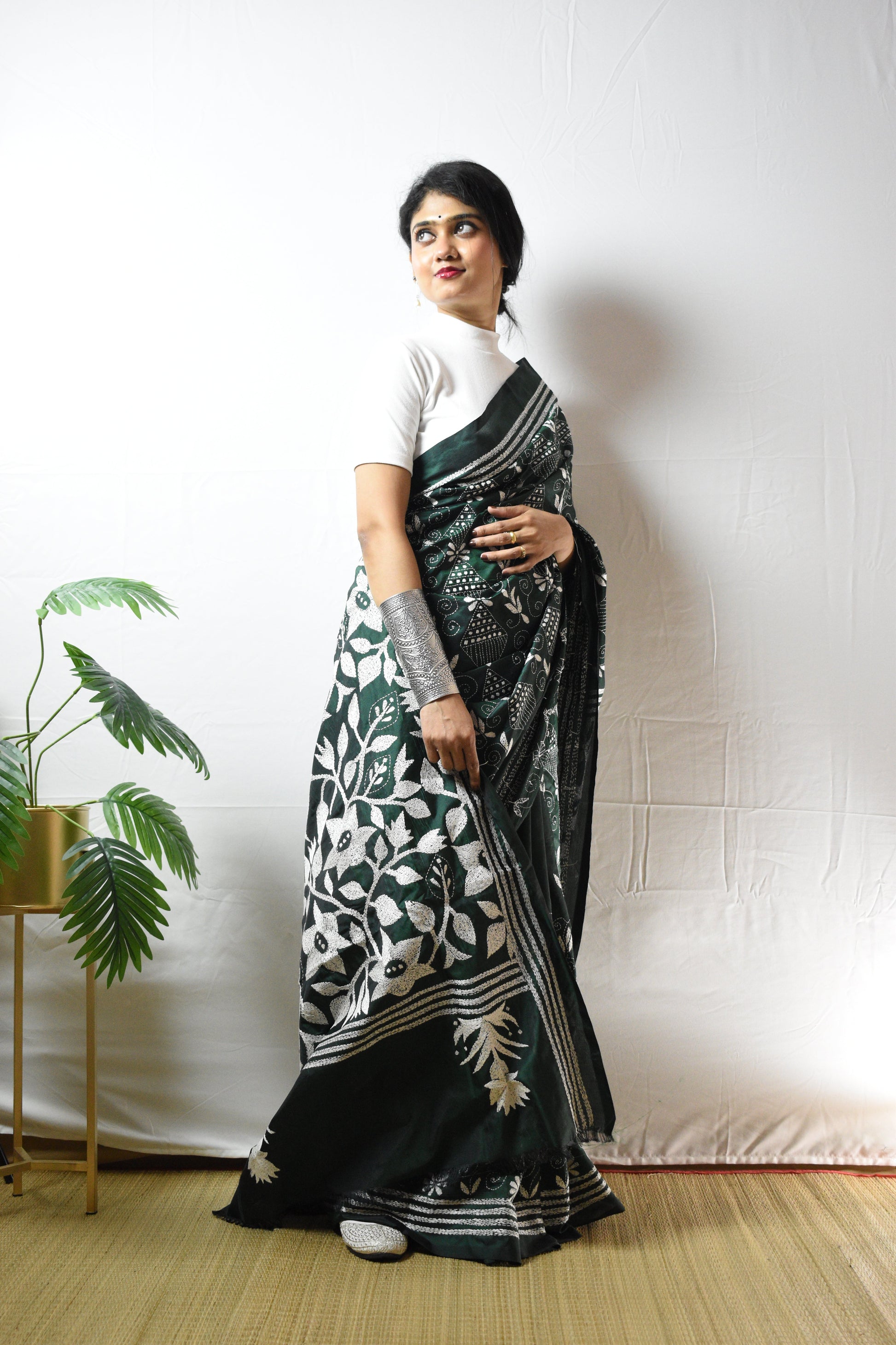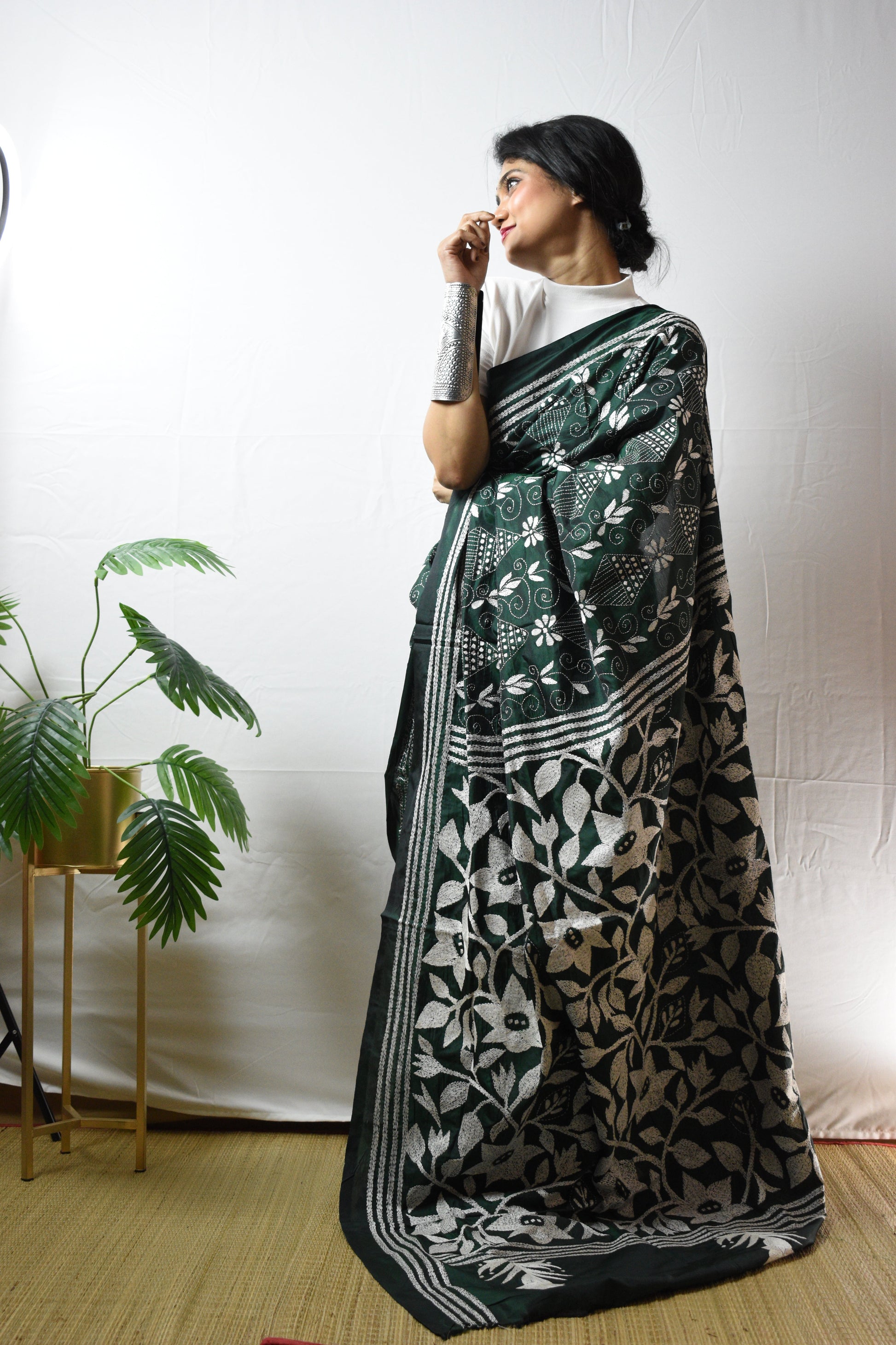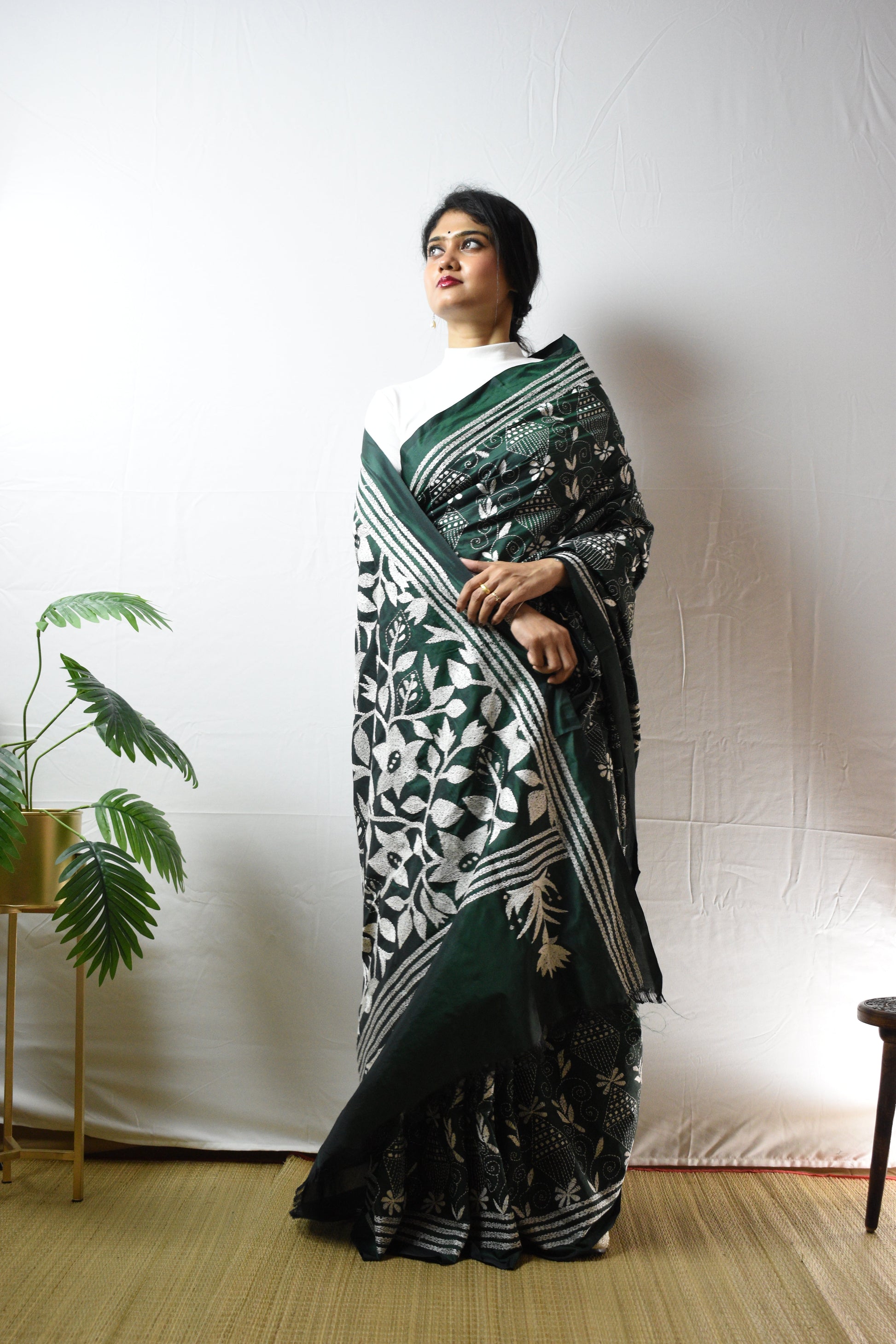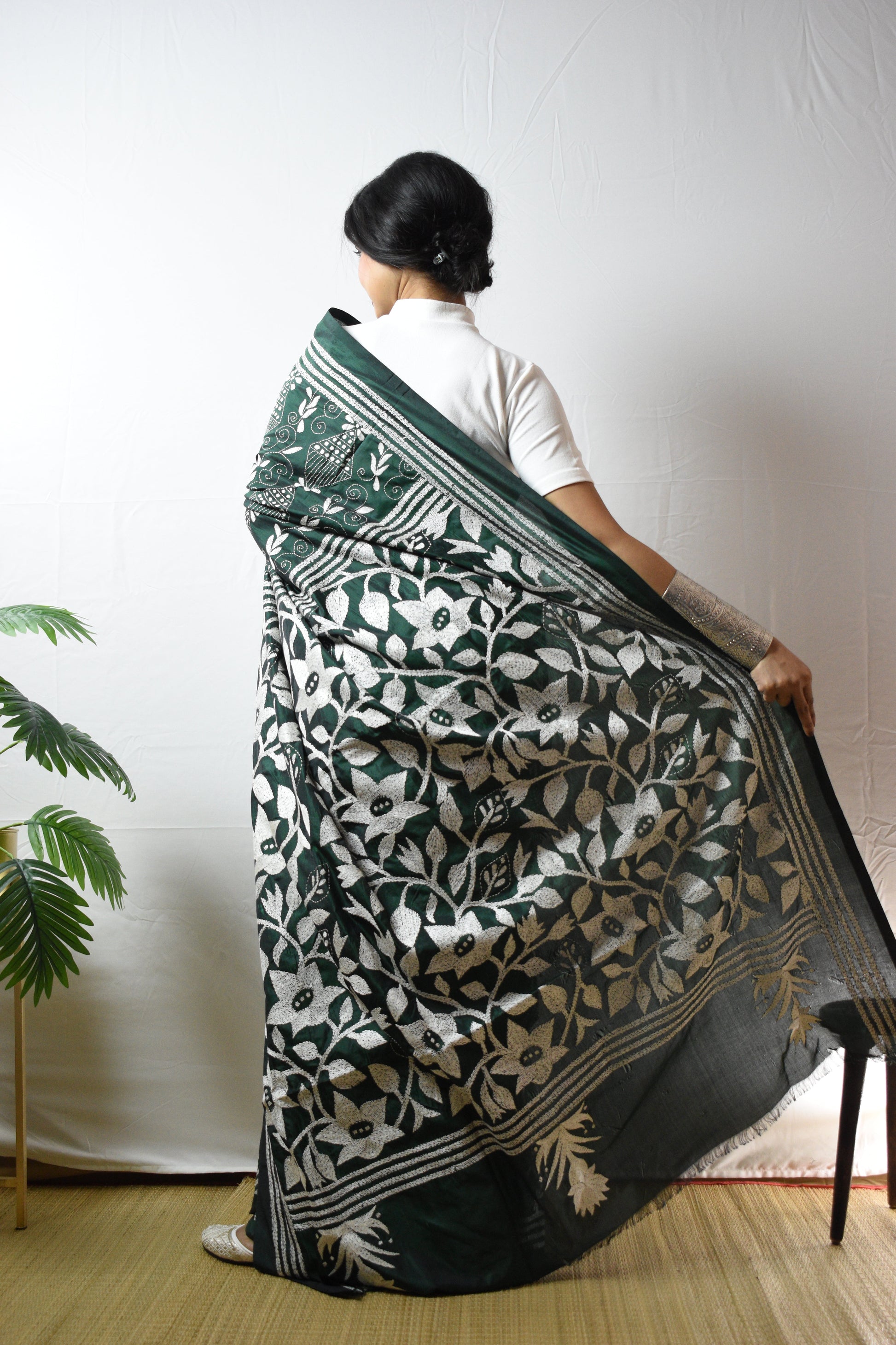 Discover the intricate beauty of our hand-embroidered Forest Green Floral Hand Embroidered Kantha Silk Saree . Each piece is individually crafted by our talented women artisans using traditional kantha stitching and delicate kantha embroidery, turning fine silk into a one-of-a-kind artwork. This premium Green is lifted with White threadwork along the border and pallu, elegant, timeless, and unmistakably handmade. A saree not just to wear, but to treasure, as art, as memory, as legacy.