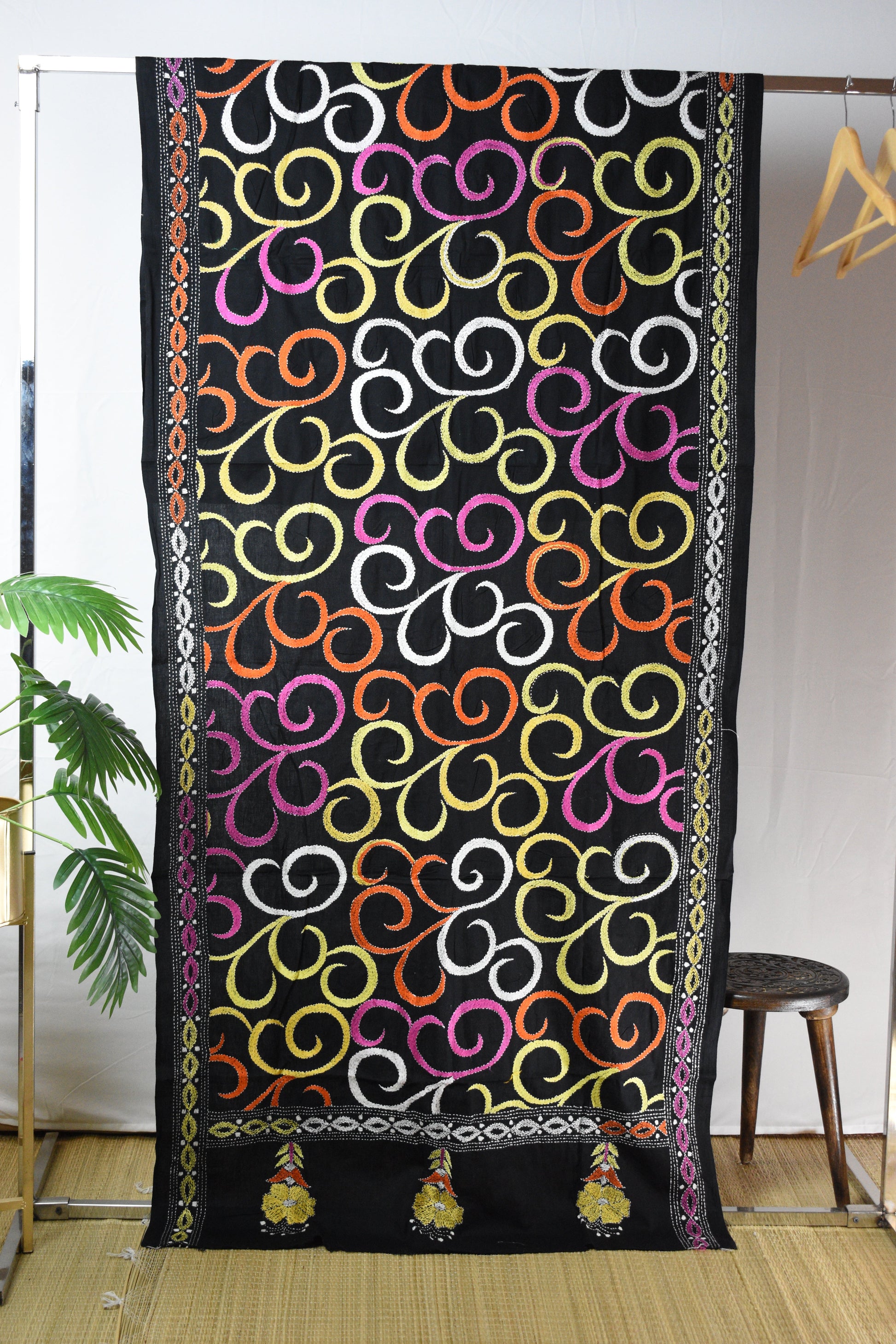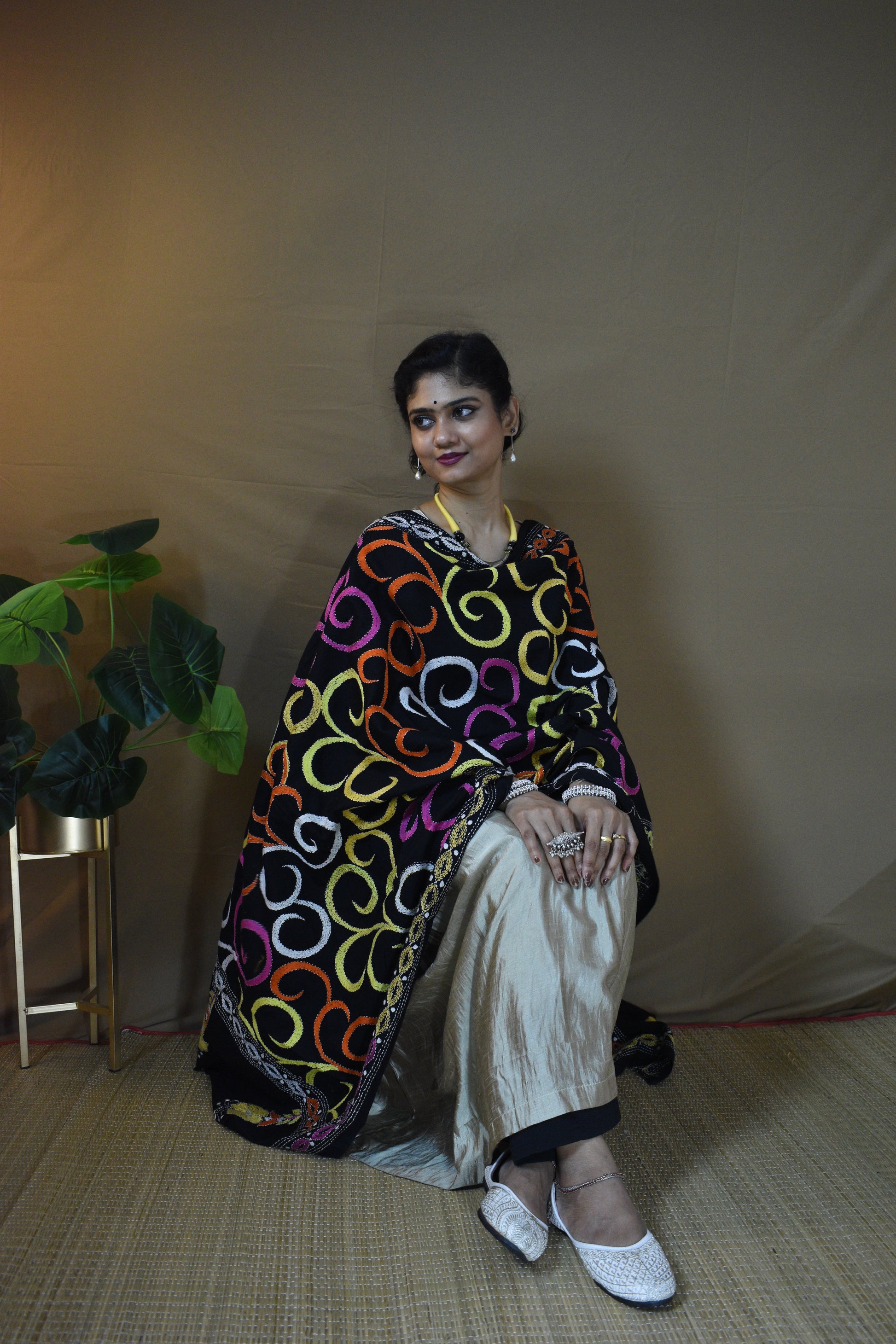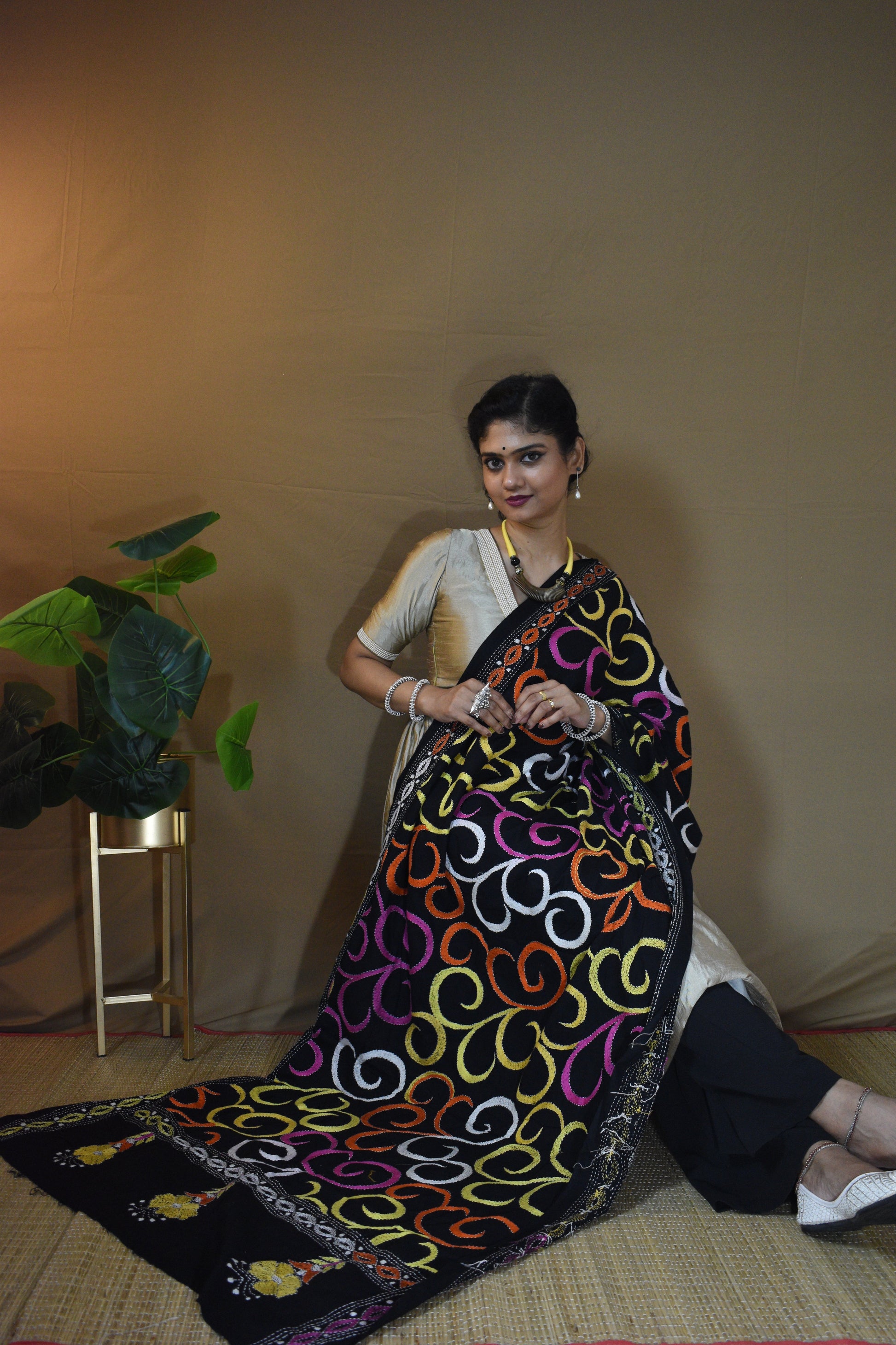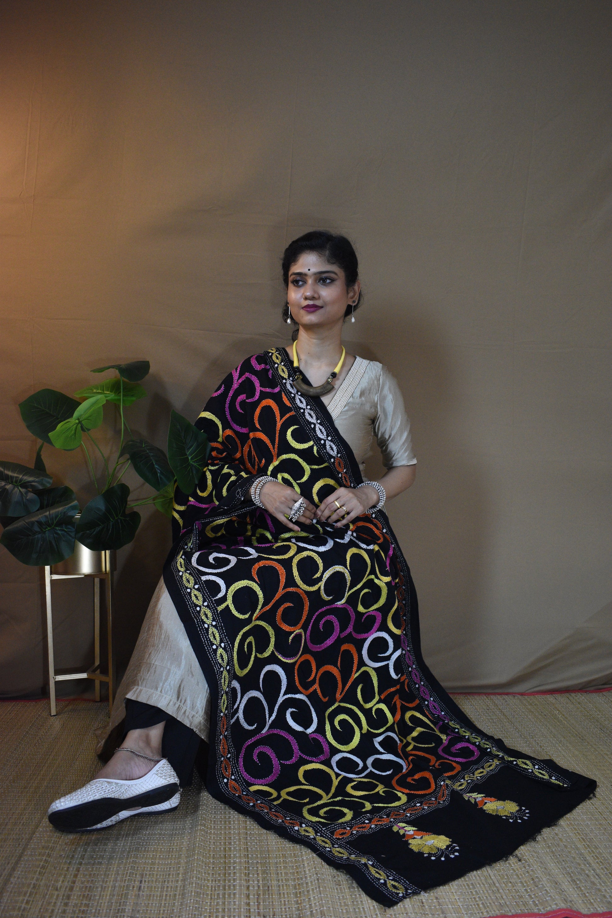 Experience the timeless charm of Bengal’s Kantha artistry with our Black Creeper Theme Pure Cotton Hand Embroidered Kantha Dupatta. Hand-embroidered by skilled women artisans, each dupatta is a celebration of patience and heritage, with running stitches that bring alive traditional motifs. The Pure Cotton fabric feels soft, airy, and light on the skin. The Black base, accented with Multi-color threadwork, gives a graceful charm that blends effortlessly with traditional as well as contemporary looks. A Dupatta not just to wear, but to treasure, as art, as memory, as legacy.