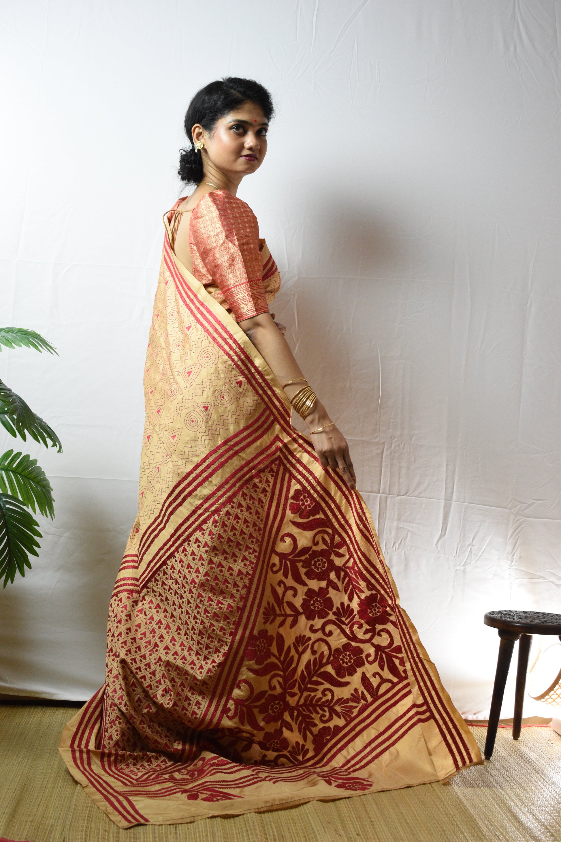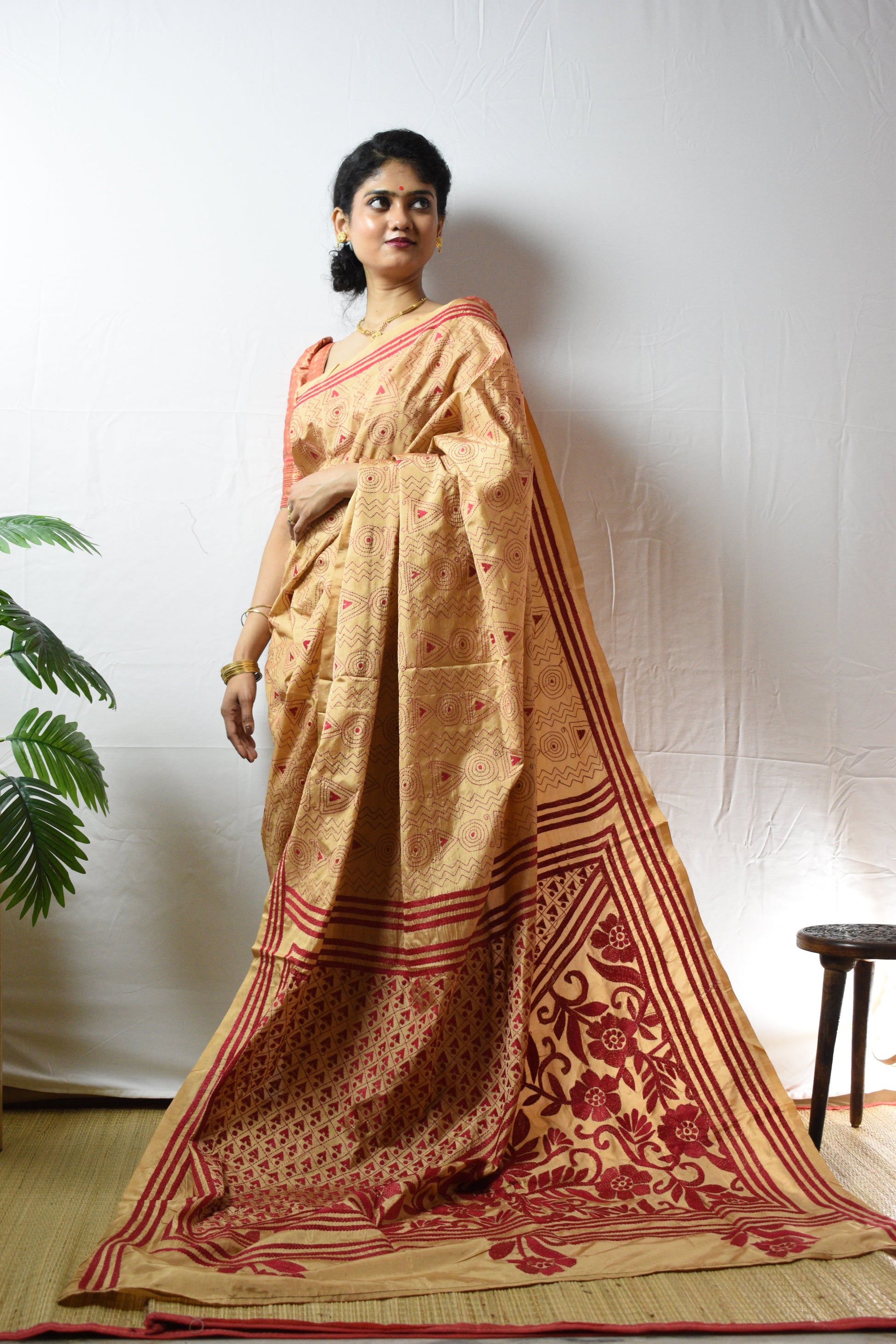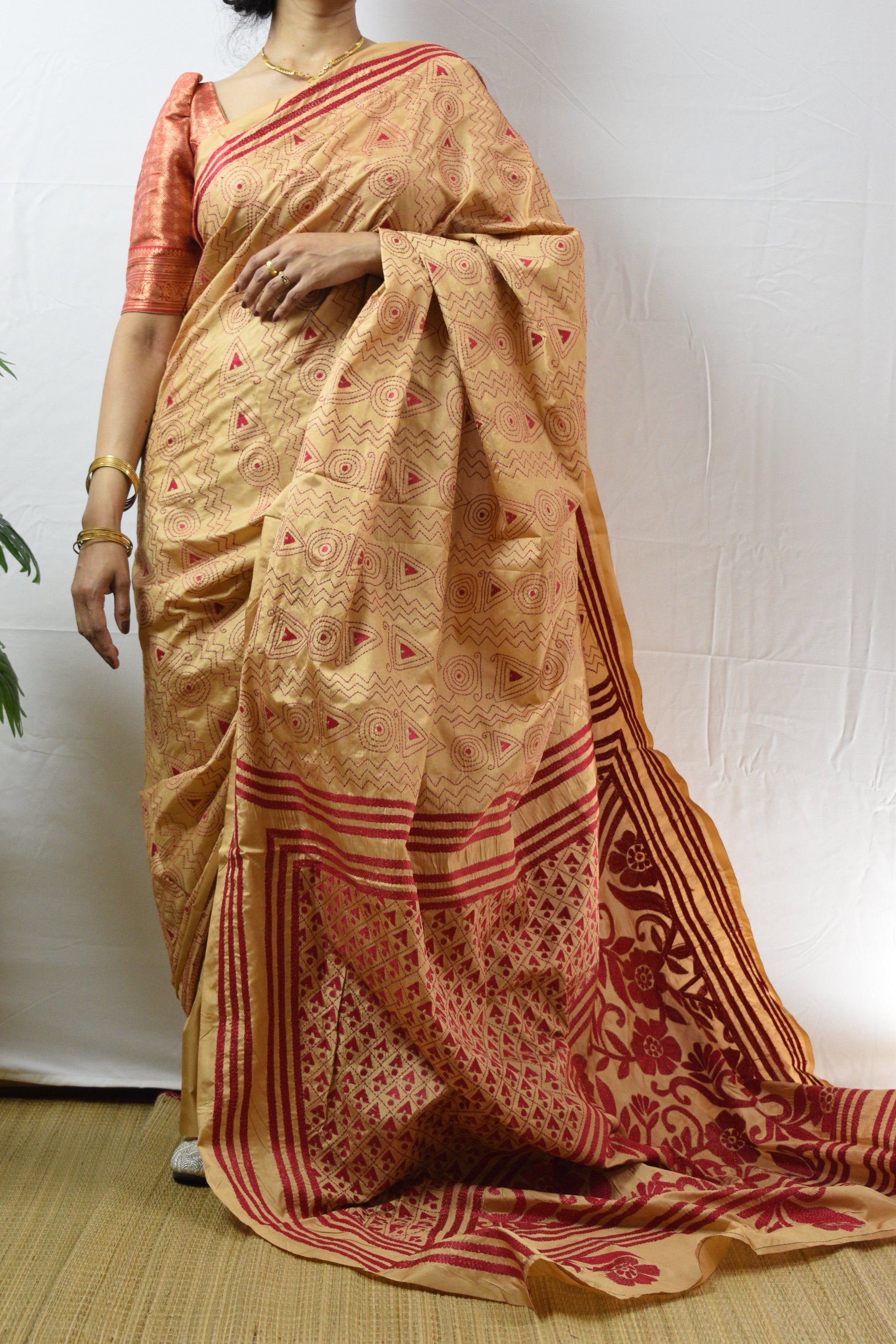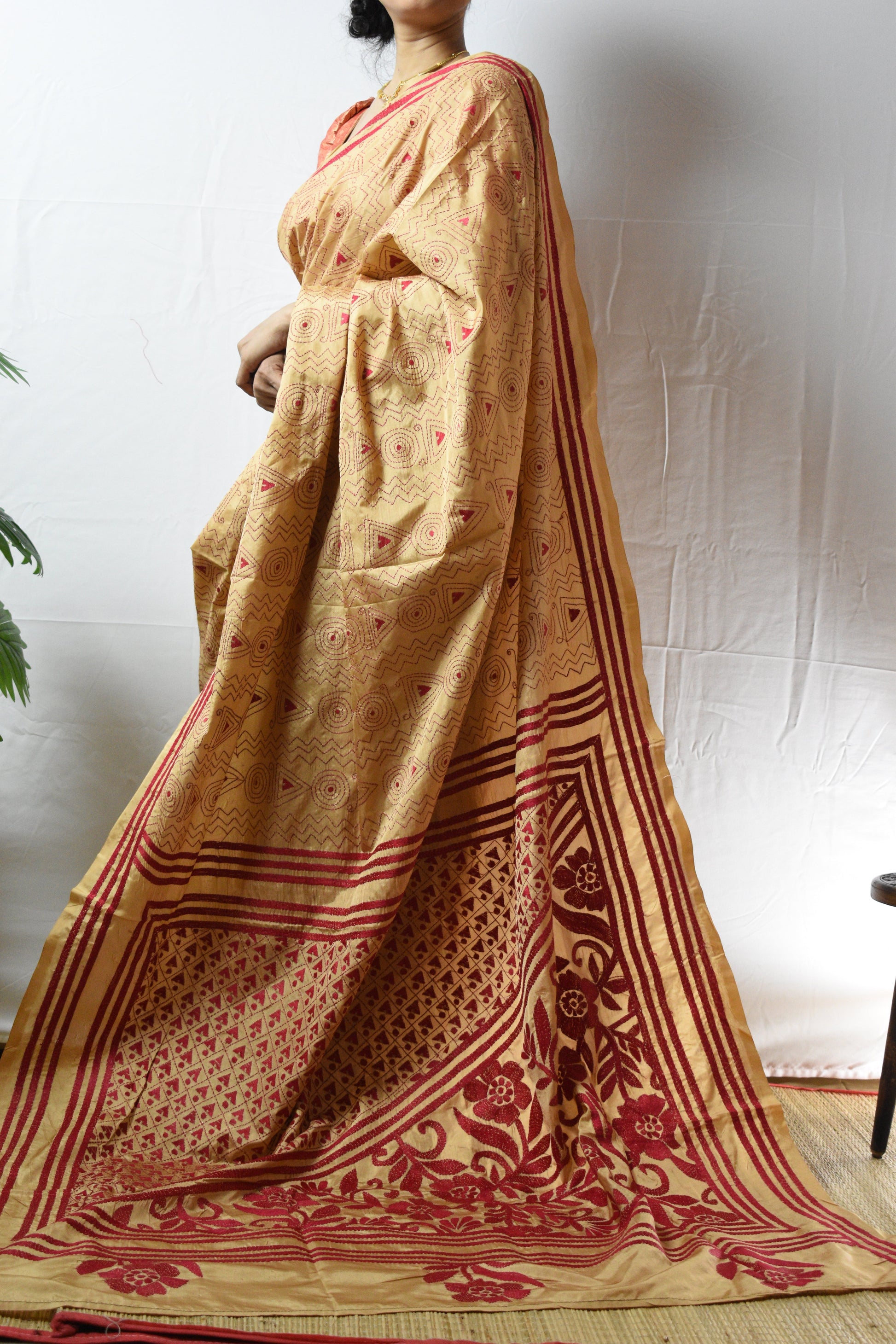 Discover the intricate beauty of our hand-embroidered Tan Warli Hand Embroidered Kantha Silk Saree. Each piece is individually crafted by our talented women artisans using traditional kantha stitching and delicate kantha embroidery, turning fine silk into a one-of-a-kind artwork. The Tan is lifted with Red threadwork along the border and pallu, elegant, timeless, and unmistakably handmade. A saree not just to wear, but to treasure, as art, as memory, as legacy.
