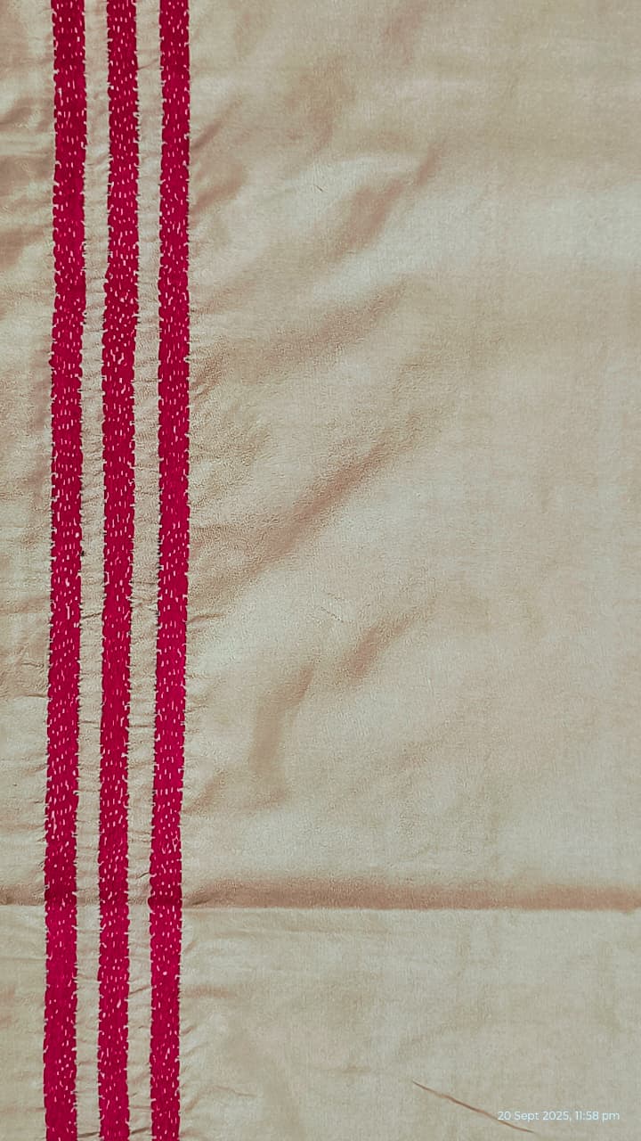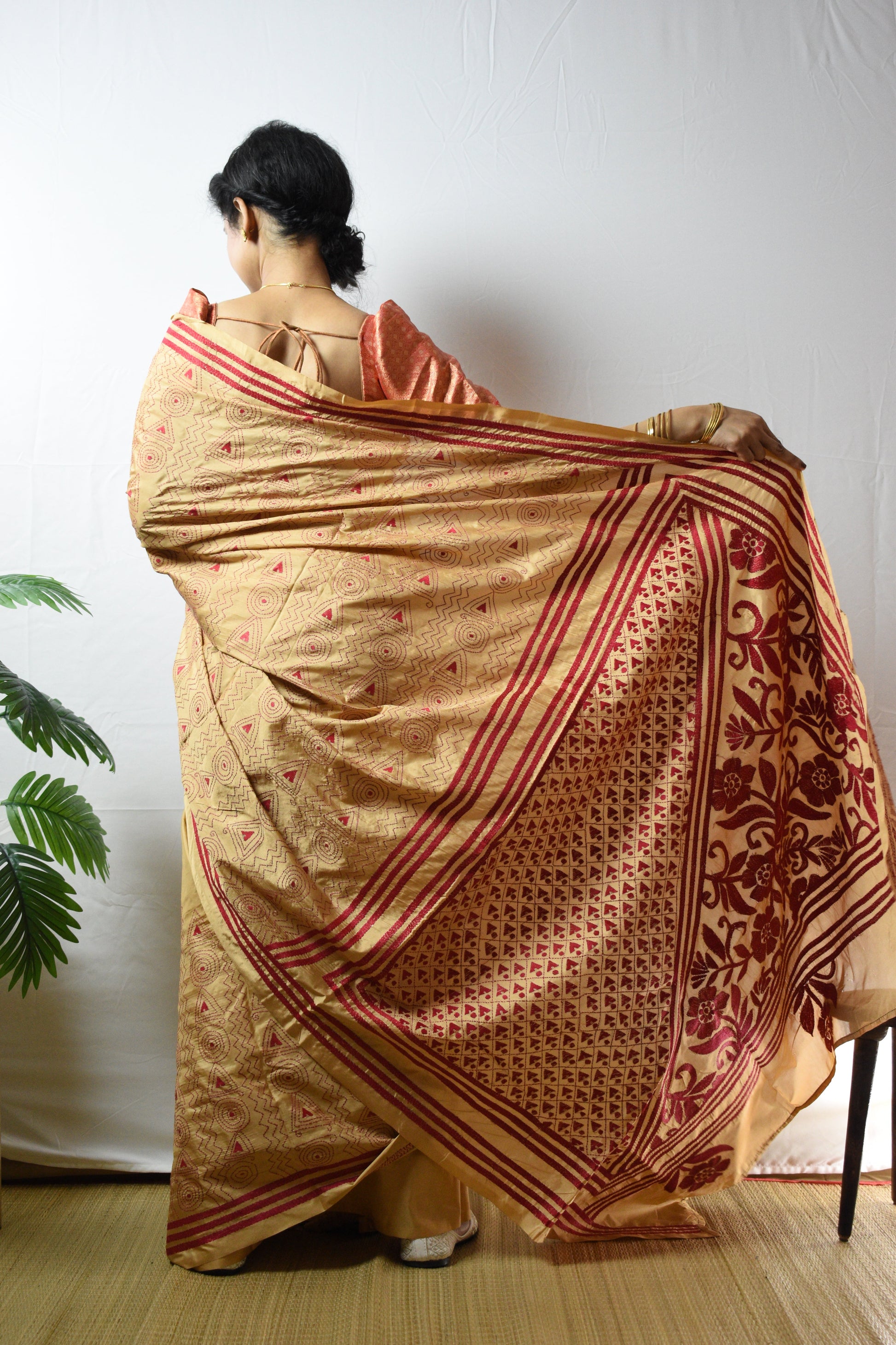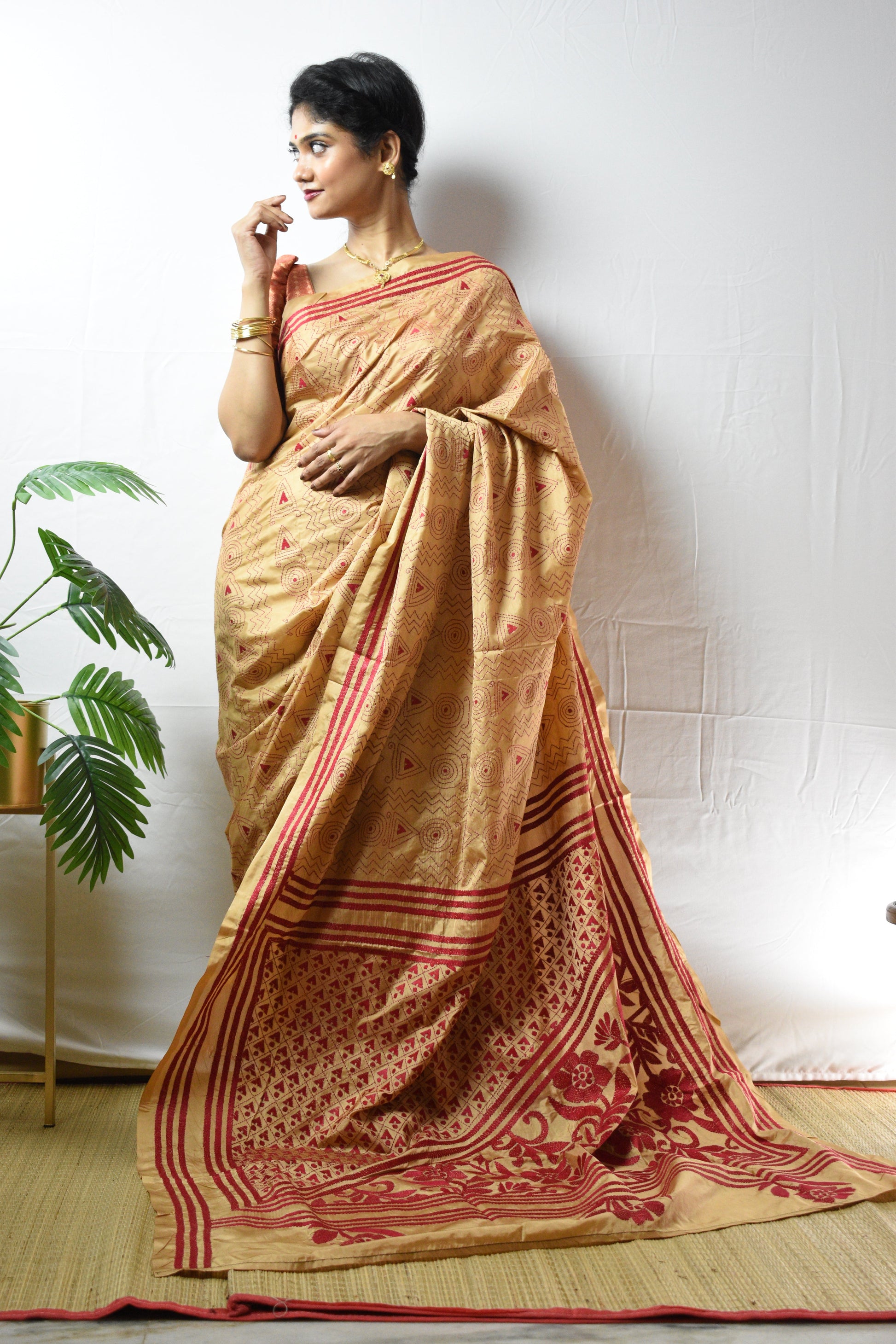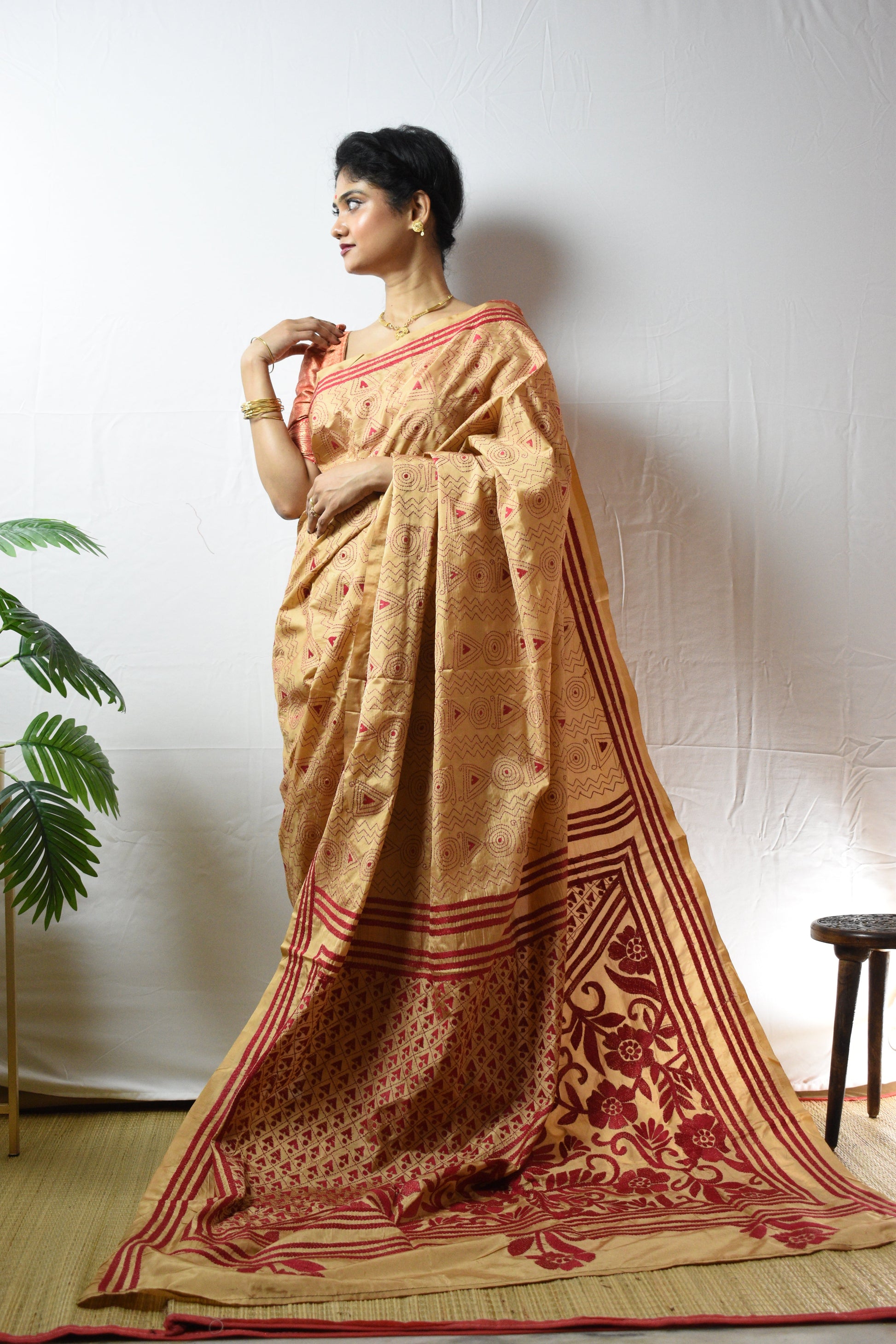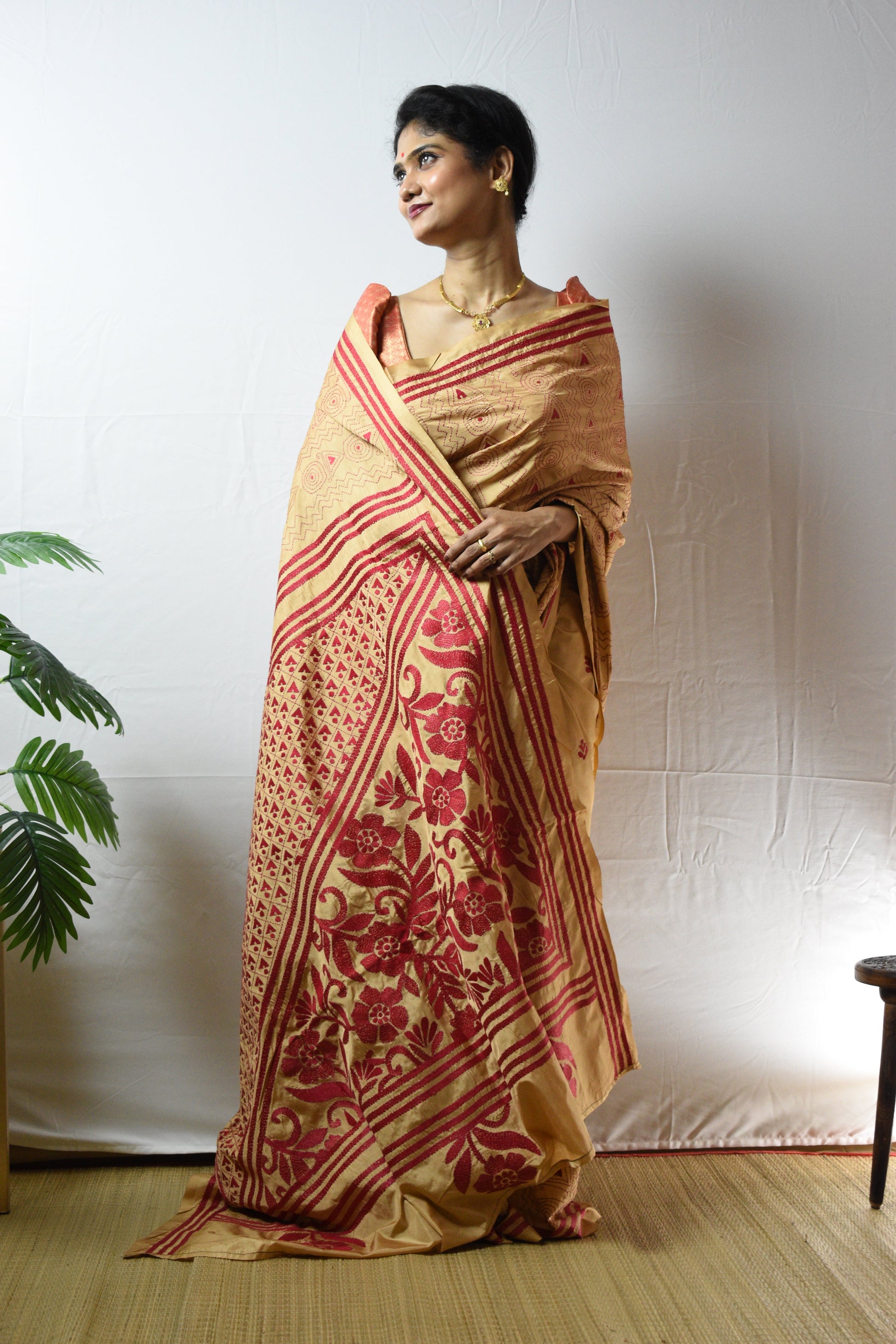 Discover the intricate beauty of our hand-embroidered Tan Warli Hand Embroidered Kantha Silk Saree. Each piece is individually crafted by our talented women artisans using traditional kantha stitching and delicate kantha embroidery, turning fine silk into a one-of-a-kind artwork. The Tan is lifted with Red threadwork along the border and pallu, elegant, timeless, and unmistakably handmade. A saree not just to wear, but to treasure, as art, as memory, as legacy.