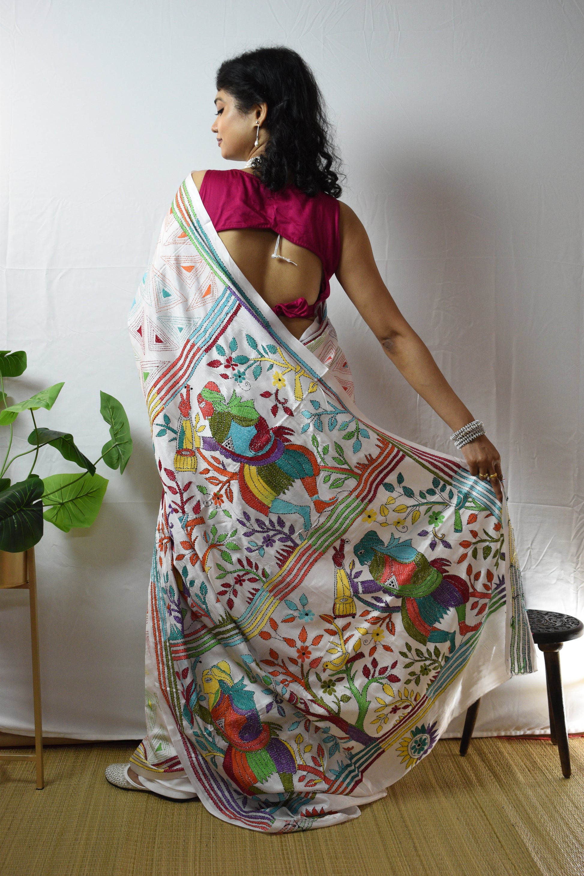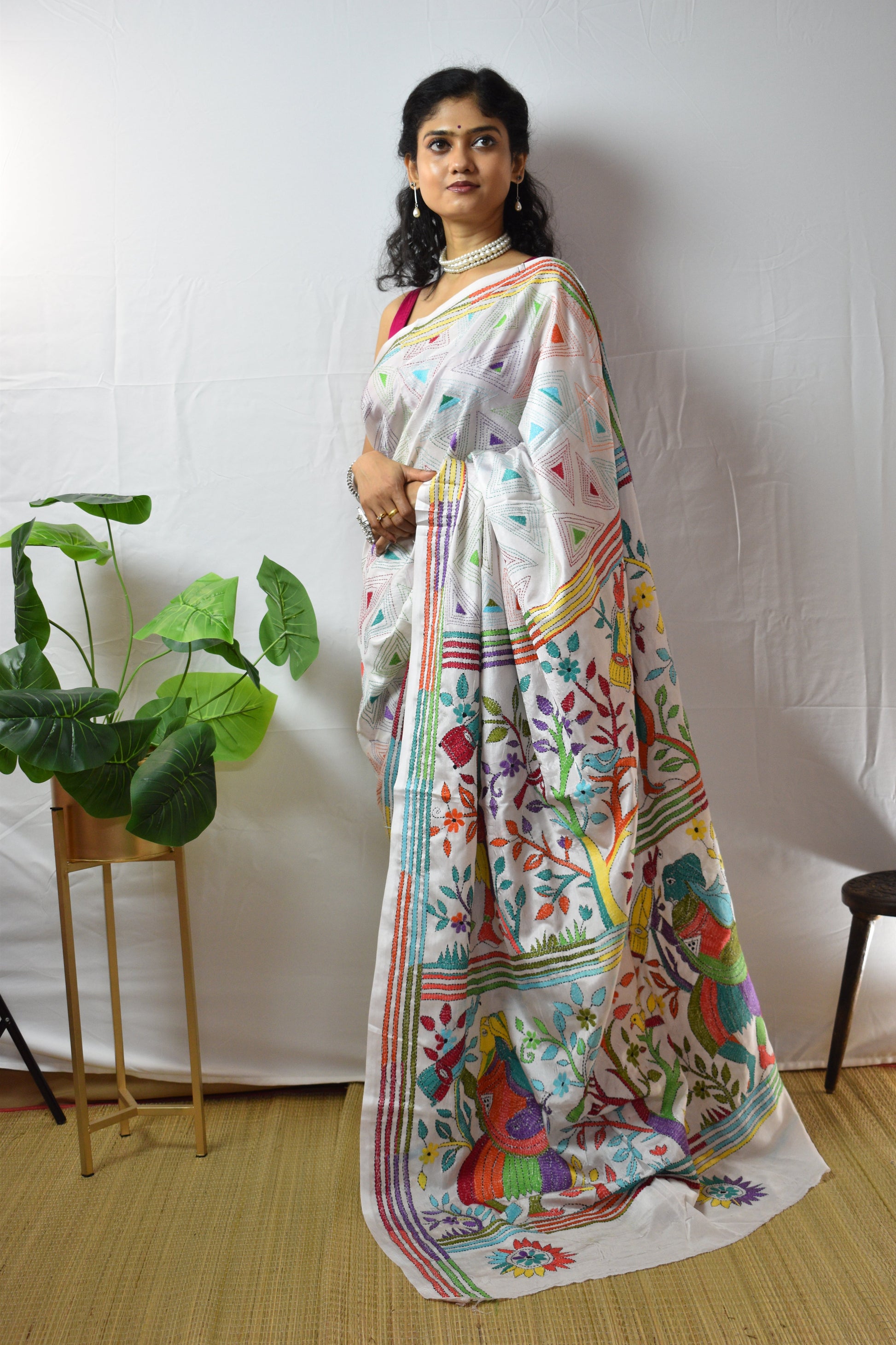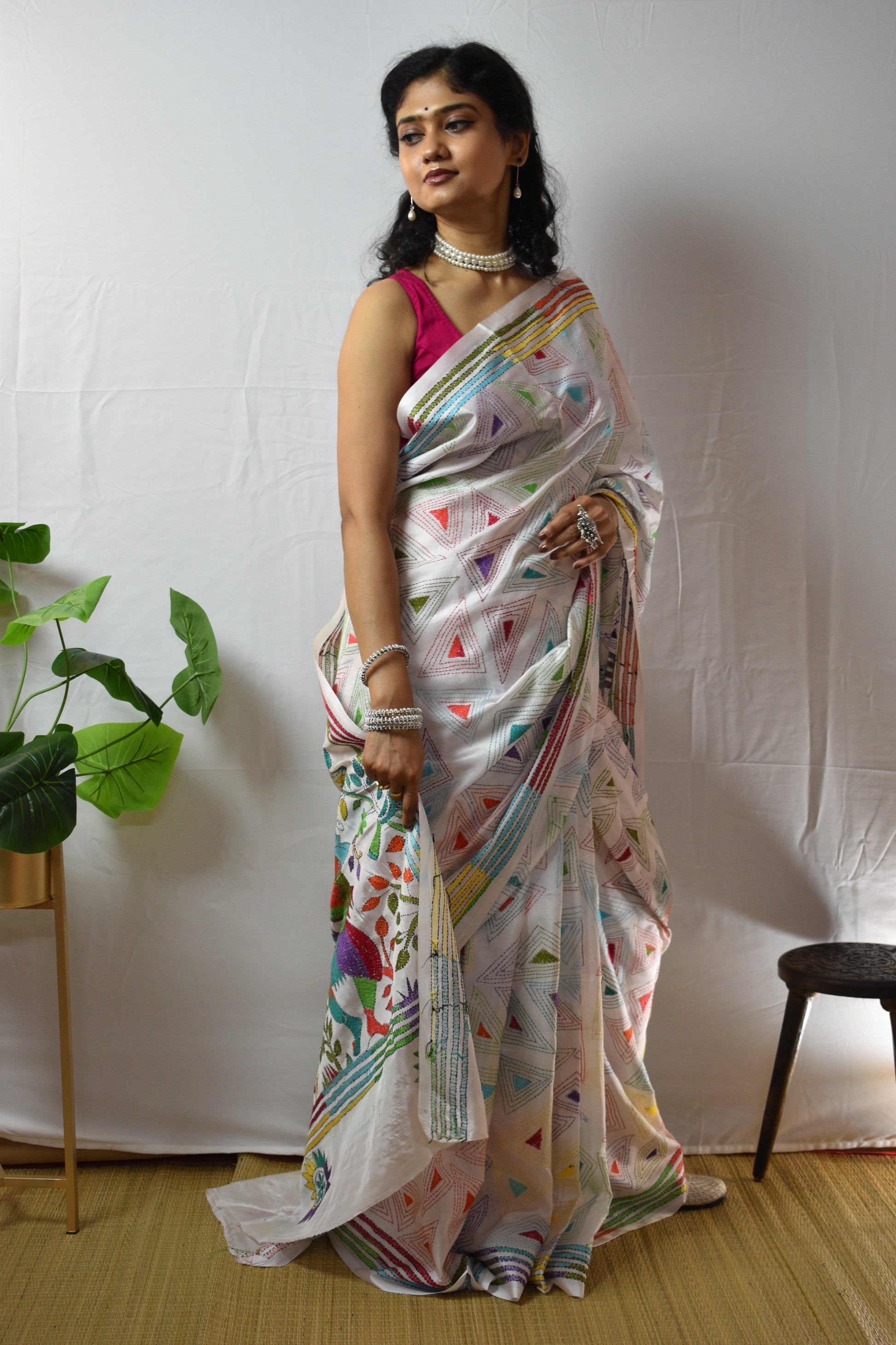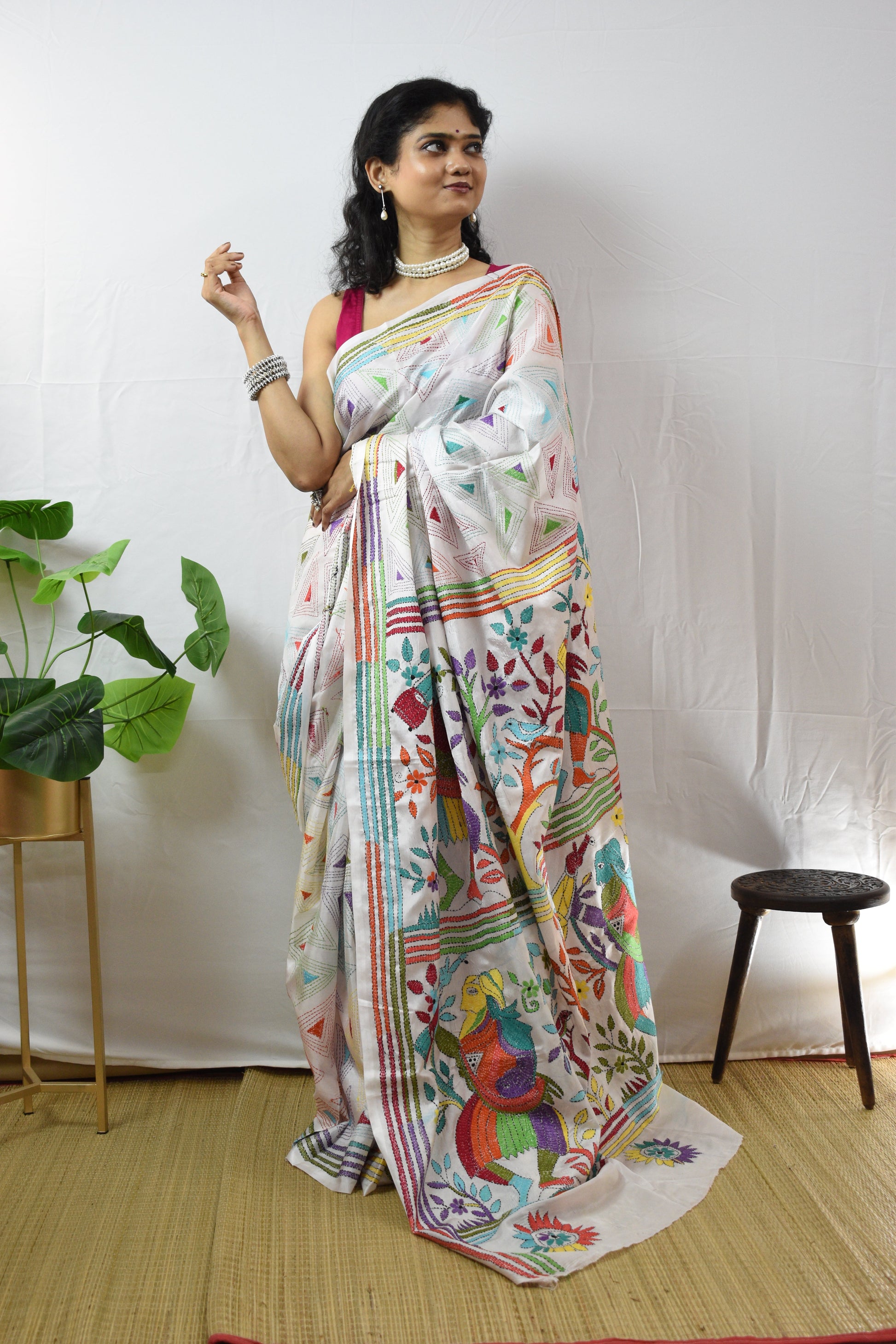 Discover the intricate beauty of our hand-embroidered White Village Theme Hand Embroidered Kantha Silk Saree. Each piece is individually crafted by our talented women artisans using traditional kantha stitching and delicate kantha embroidery, turning fine silk into a one-of-a-kind artwork. The White palette is lifted with multi color threadwork along the border and pallu, elegant, timeless, and unmistakably handmade. A saree not just to wear, but to treasure, as art, as memory, as legacy.