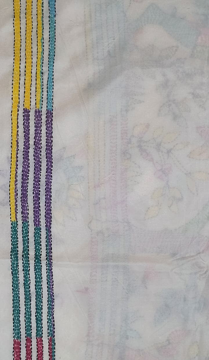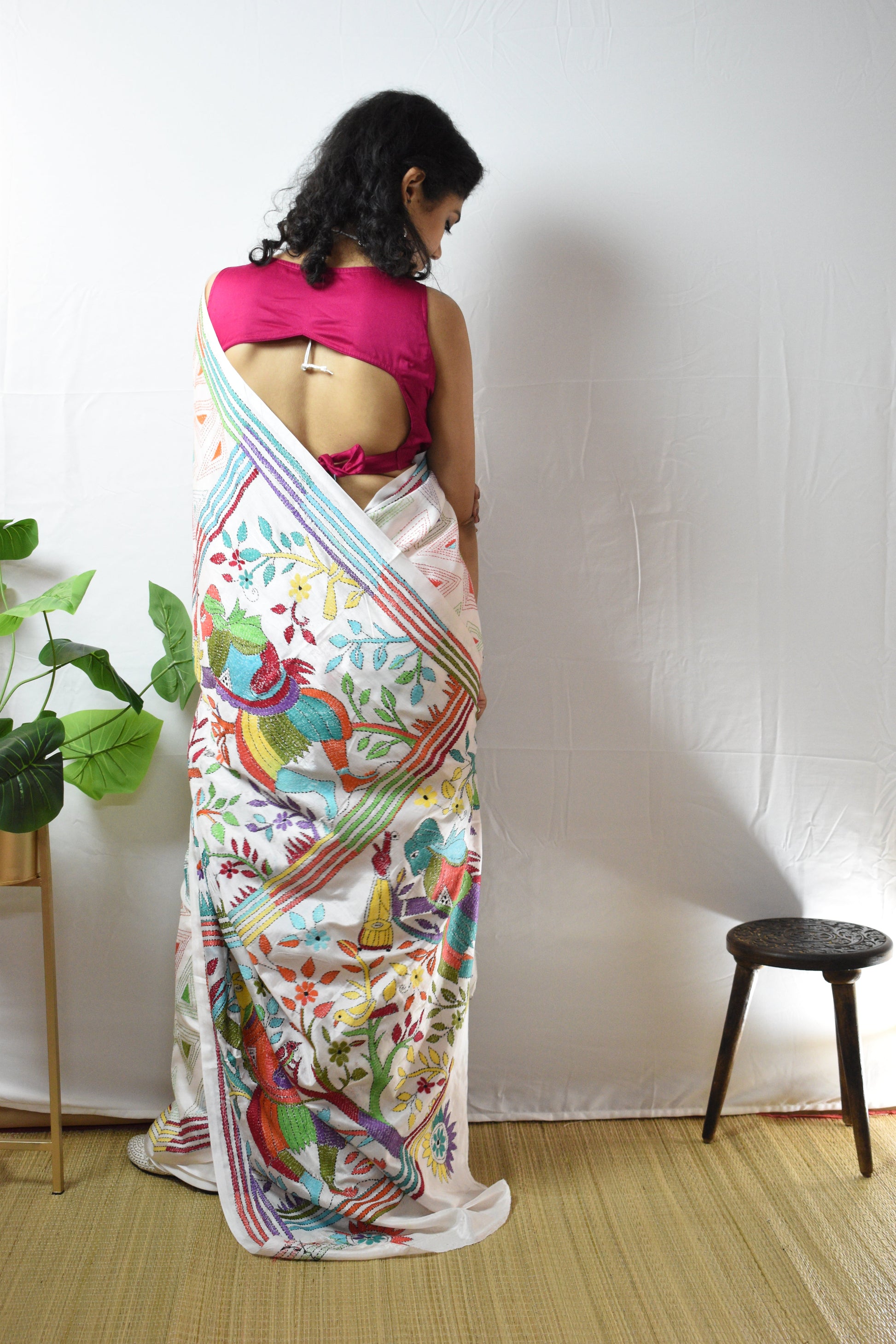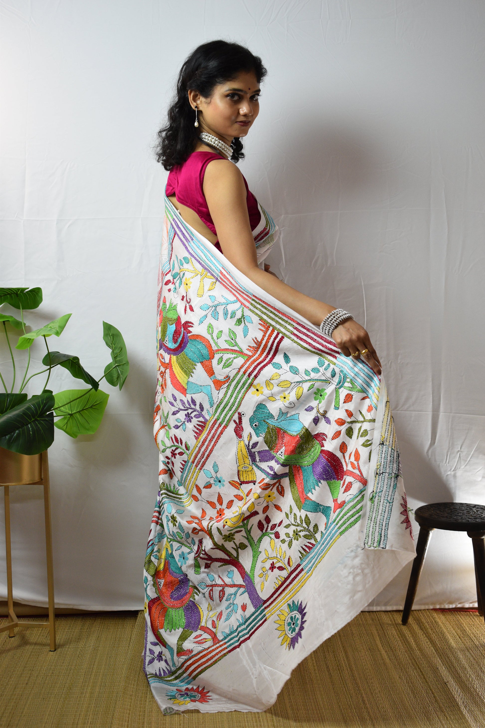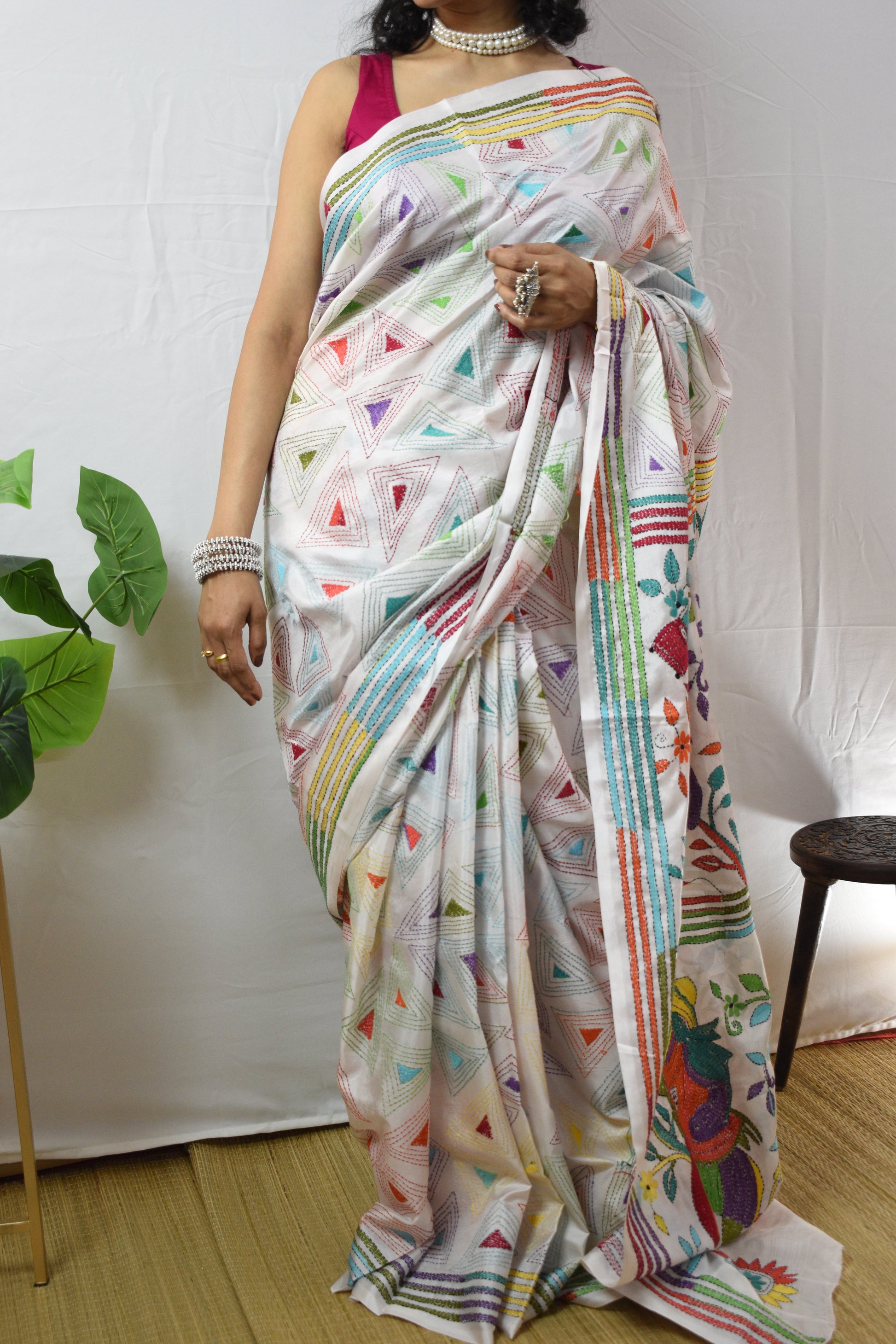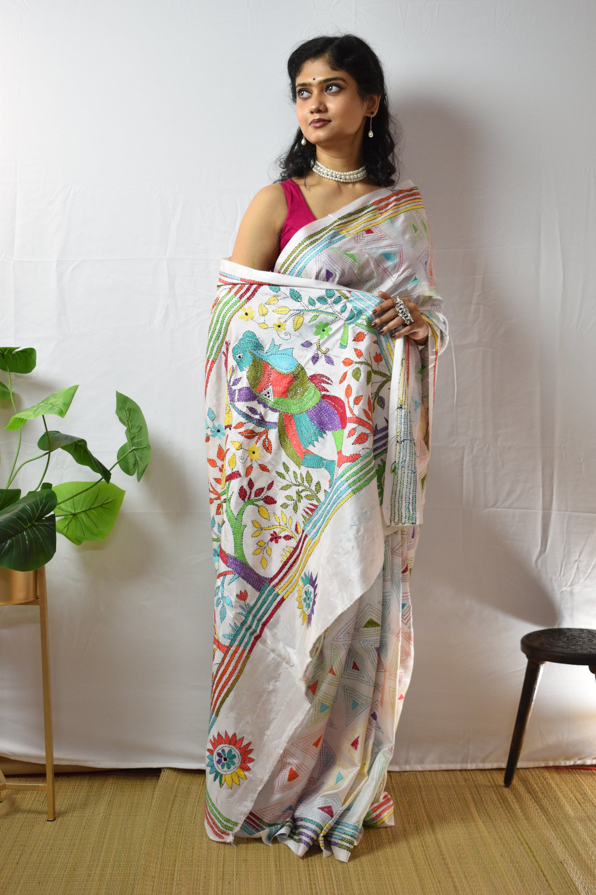 Discover the intricate beauty of our hand-embroidered White Village Theme Hand Embroidered Kantha Silk Saree. Each piece is individually crafted by our talented women artisans using traditional kantha stitching and delicate kantha embroidery, turning fine silk into a one-of-a-kind artwork. The White palette is lifted with multi color threadwork along the border and pallu, elegant, timeless, and unmistakably handmade. A saree not just to wear, but to treasure, as art, as memory, as legacy.
