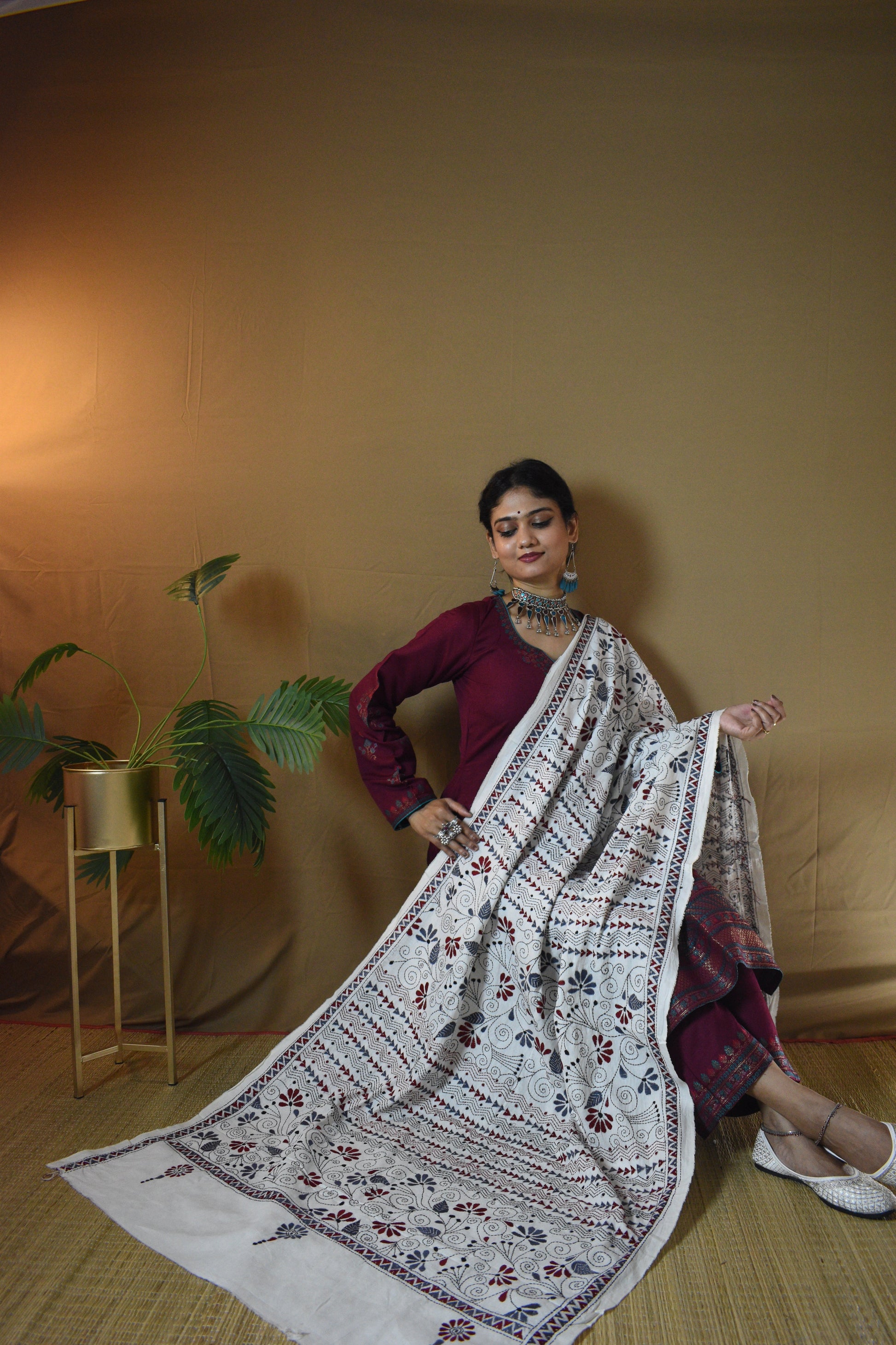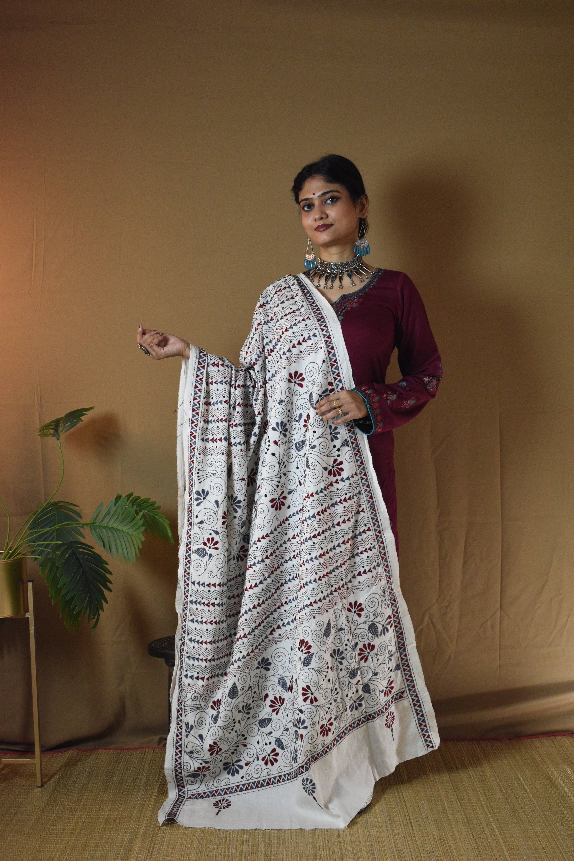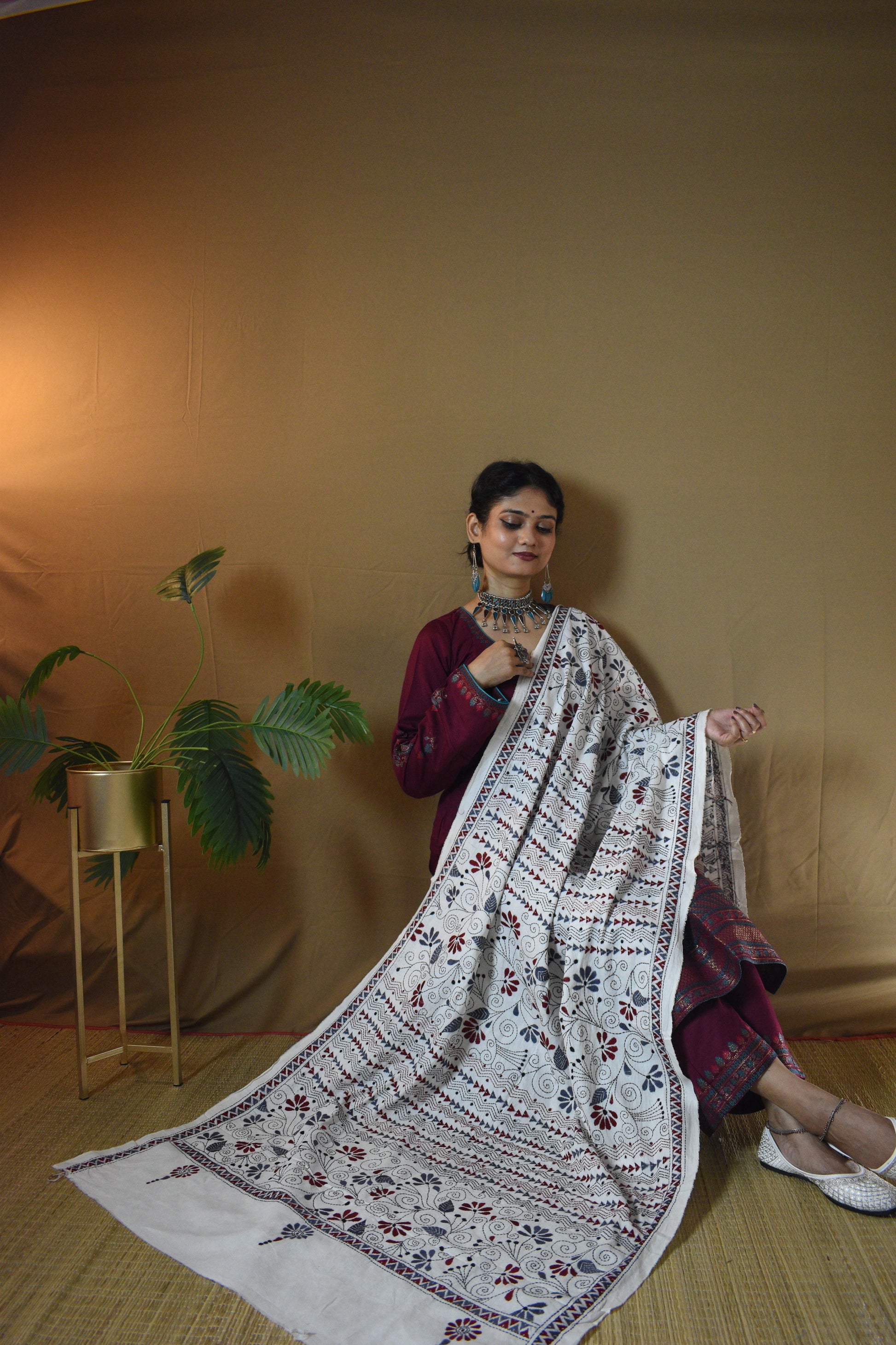 Experience the timeless charm of Bengal’s Kantha artistry with our Off White Geometrical Pure Cotton Hand Embroidered Kantha Dupatta. Hand-embroidered by skilled women artisans, each dupatta is a celebration of patience and heritage, with running stitches that bring alive traditional motifs. The Pure Cotton fabric feels soft, airy, and light on the skin. The Off White base, accented with multi-color threadwork, gives a graceful charm that blends effortlessly with traditional as well as contemporary looks. A Dupatta not just to wear, but to treasure, as art, as memory, as legacy.