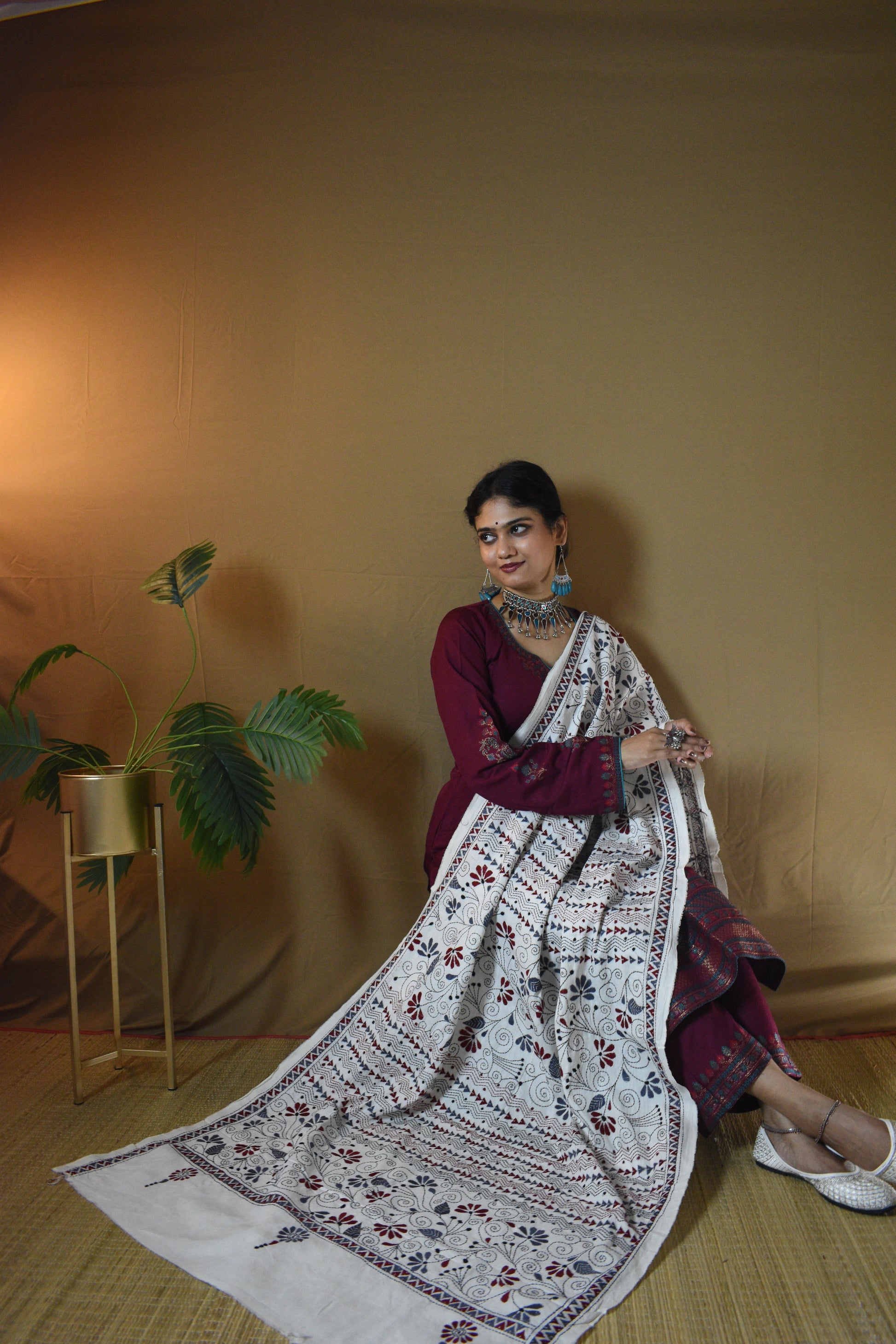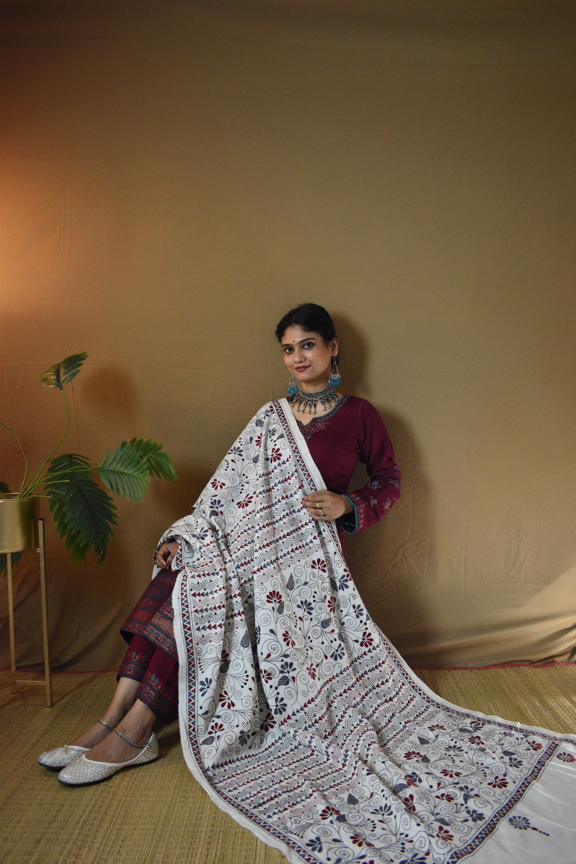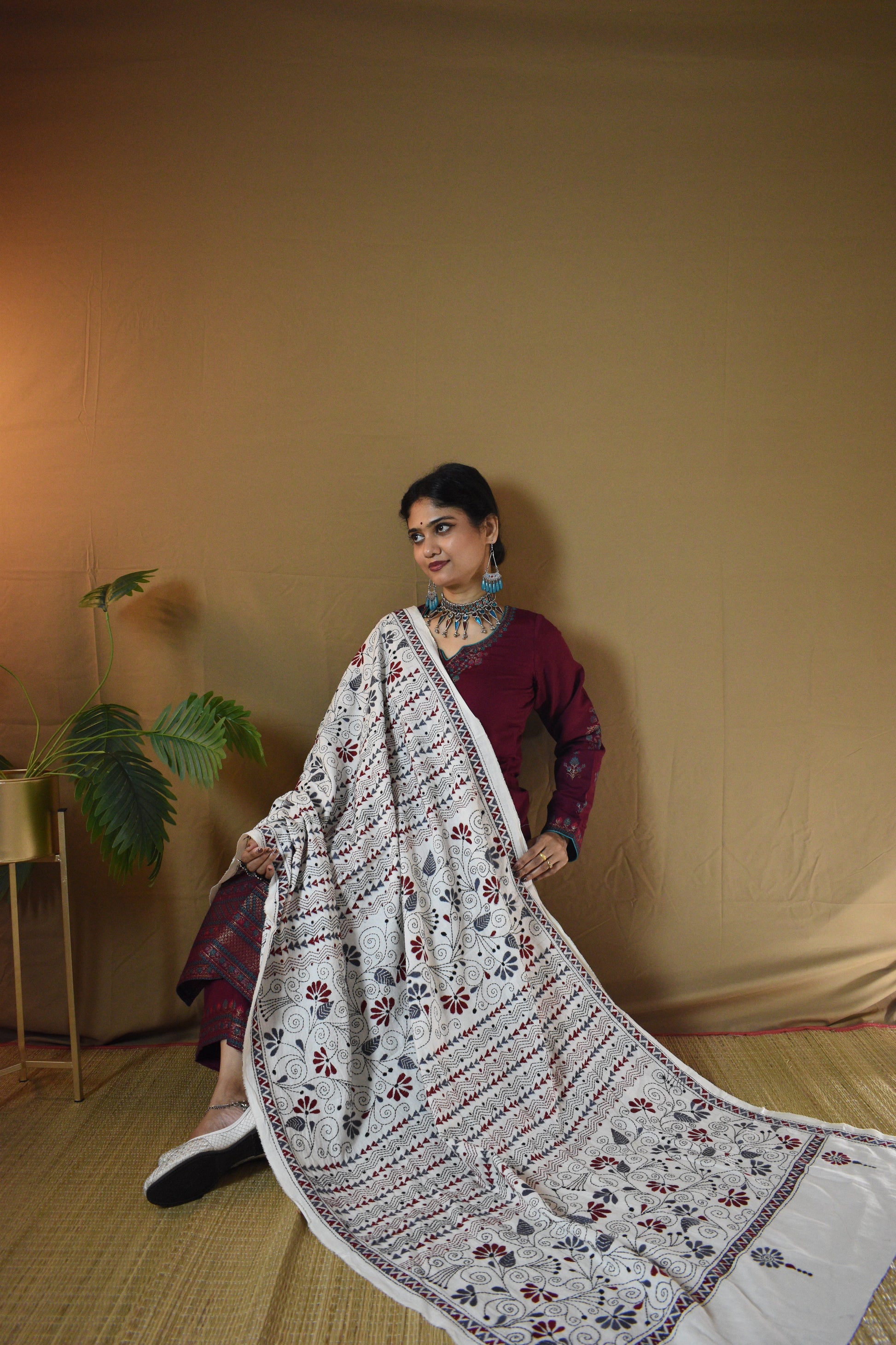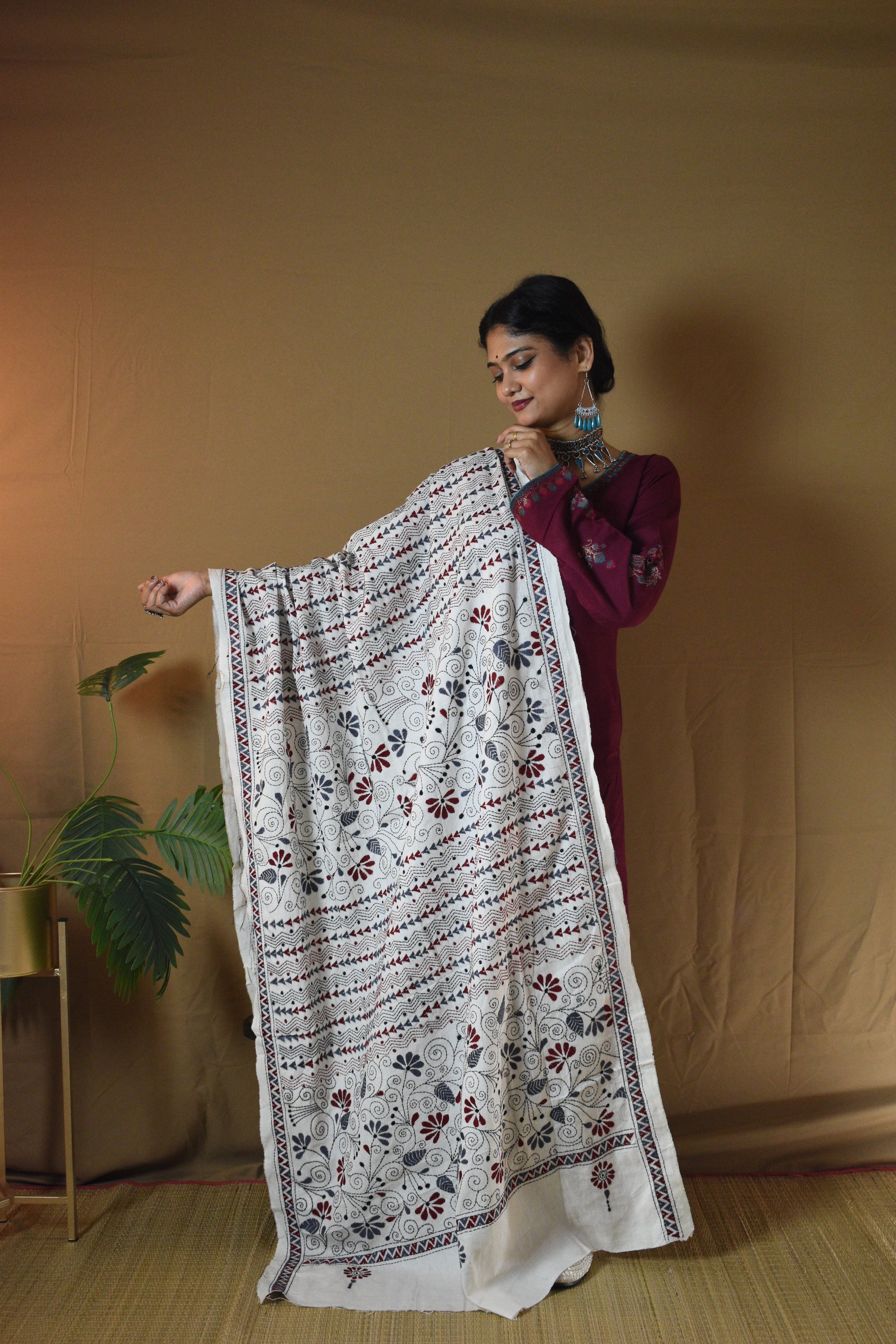 Experience the timeless charm of Bengal’s Kantha artistry with our Off White Geometrical Pure Cotton Hand Embroidered Kantha Dupatta. Hand-embroidered by skilled women artisans, each dupatta is a celebration of patience and heritage, with running stitches that bring alive traditional motifs. The Pure Cotton fabric feels soft, airy, and light on the skin. The Off White base, accented with multi-color threadwork, gives a graceful charm that blends effortlessly with traditional as well as contemporary looks. A Dupatta not just to wear, but to treasure, as art, as memory, as legacy.