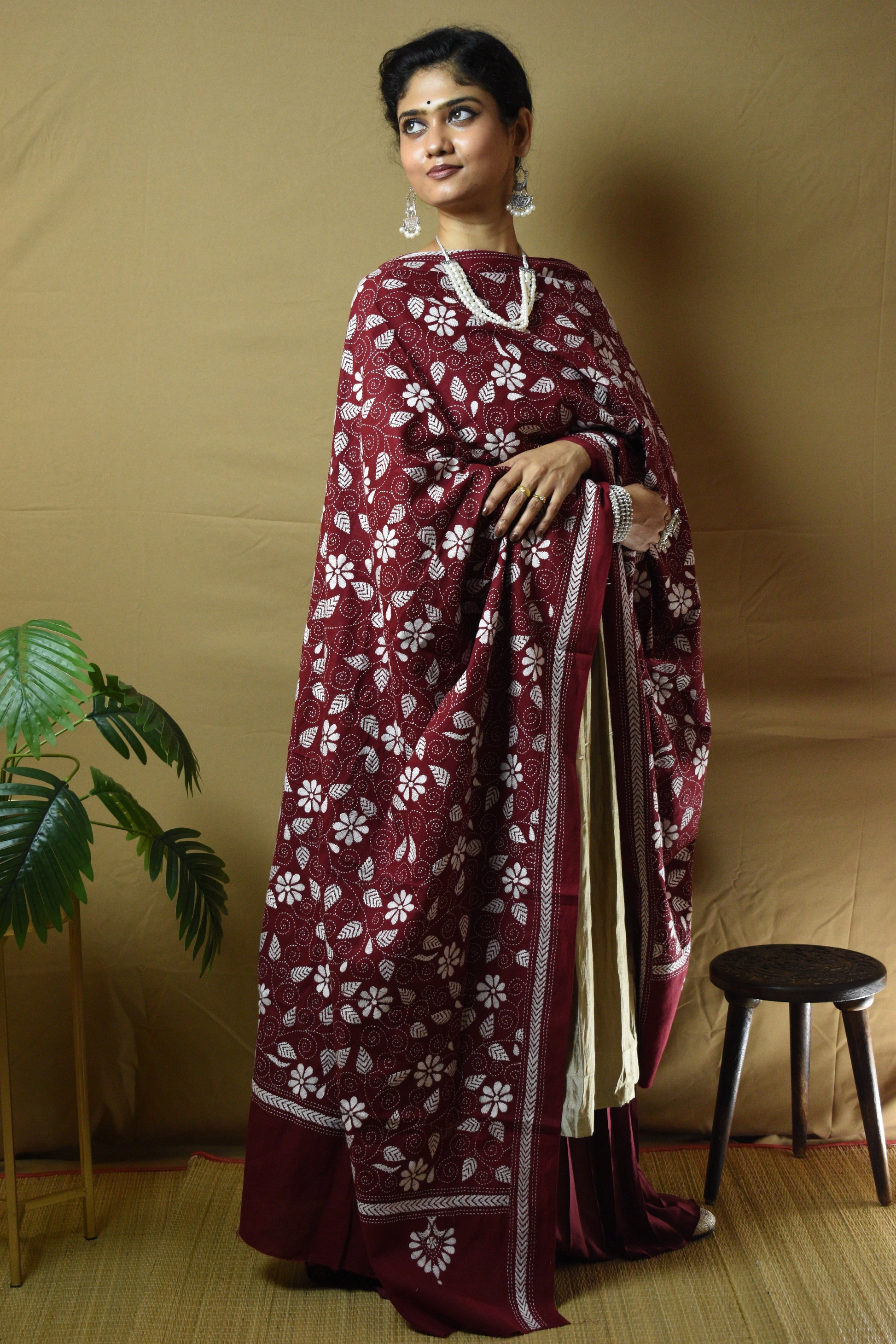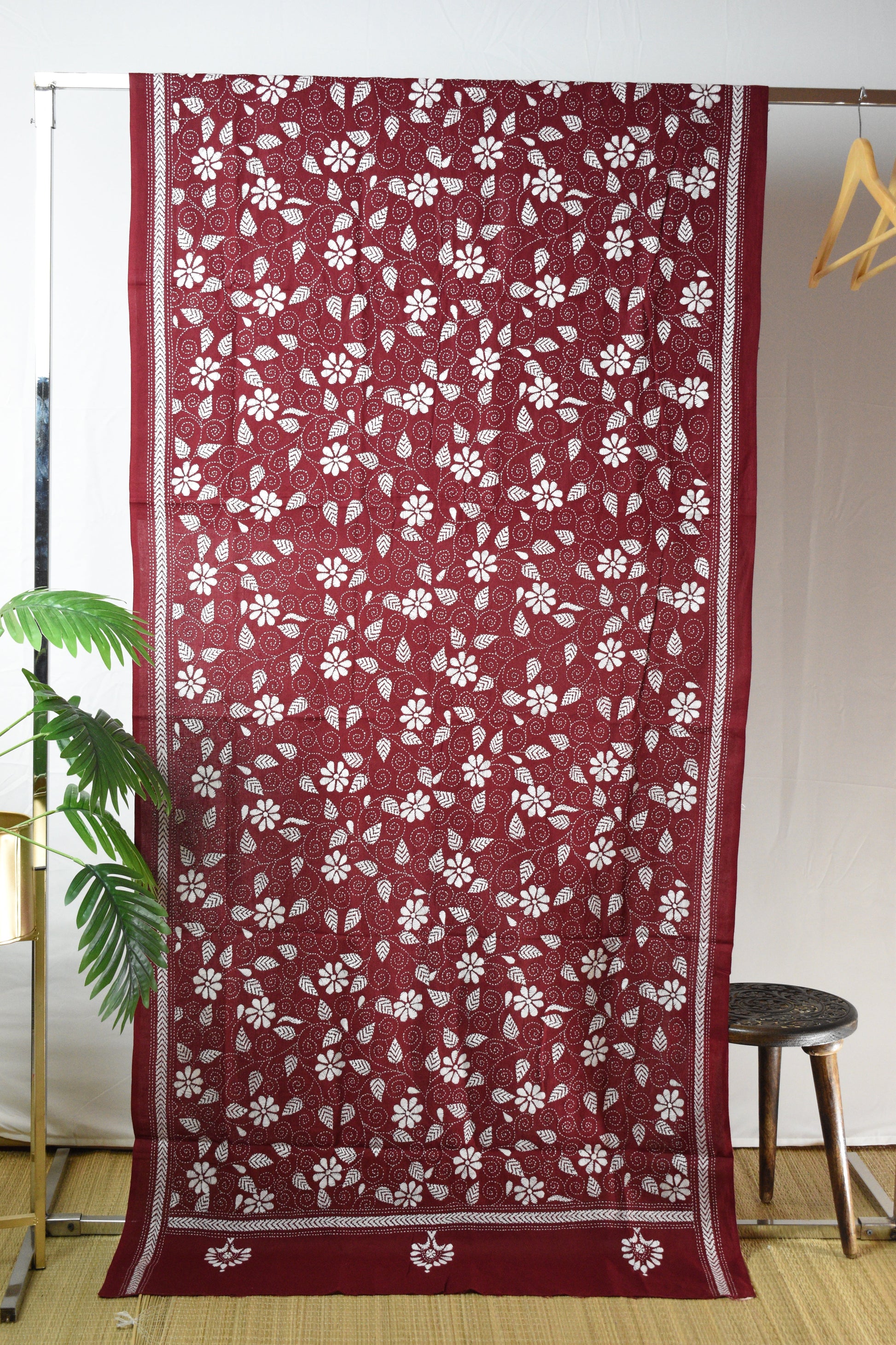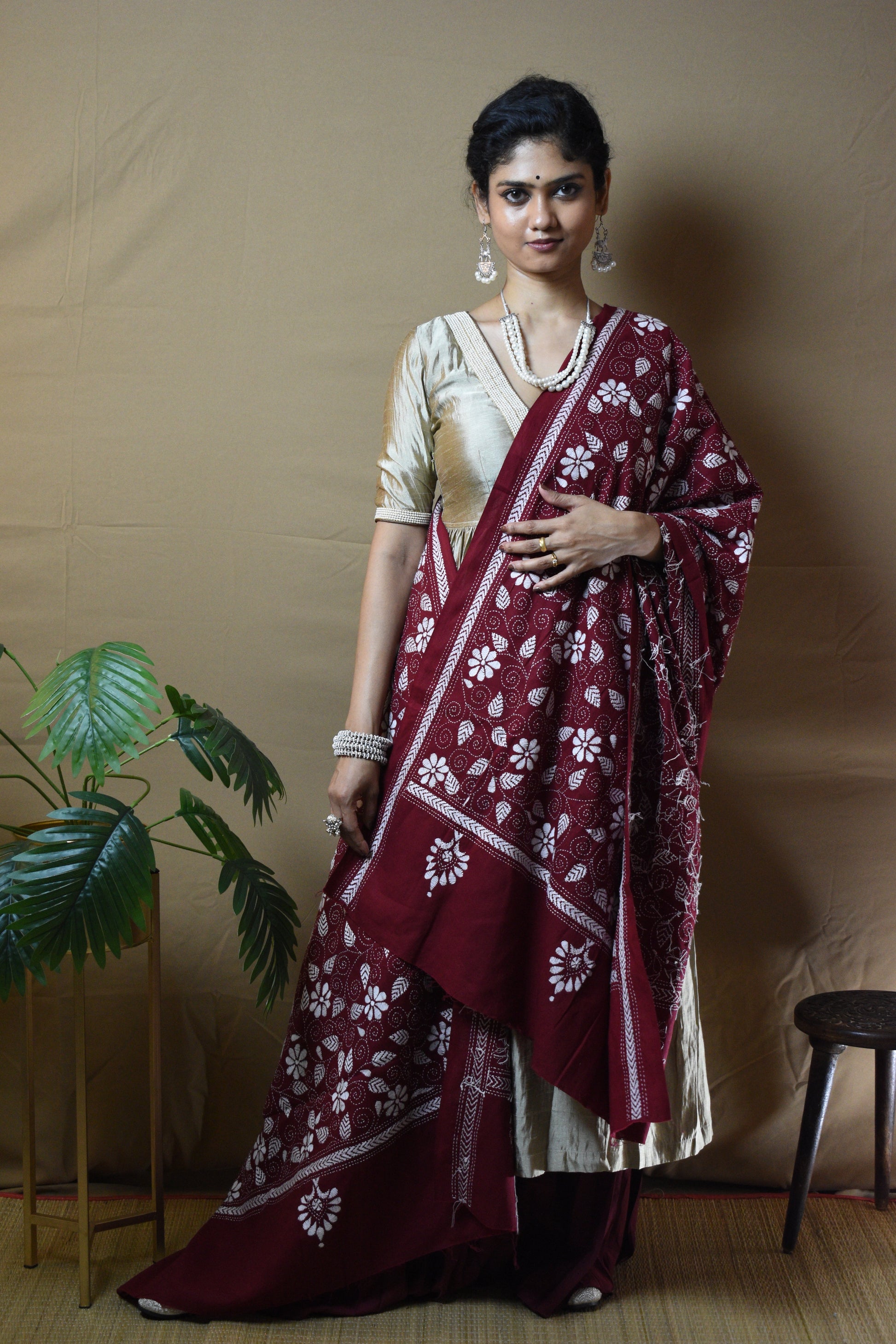 Experience the timeless charm of Bengal’s Kantha artistry with our Maroon Floral Pure Cotton Hand Embroidered Kantha Dupatta. Hand-embroidered by skilled women artisans, each dupatta is a celebration of patience and heritage, with running stitches that bring alive traditional motifs. The Pure Cotton fabric feels soft, airy, and light on the skin. The Maroon base, accented with White threadwork, gives a graceful charm that blends effortlessly with traditional as well as contemporary looks. A Dupatta not just to wear, but to treasure, as art, as memory, as legacy.