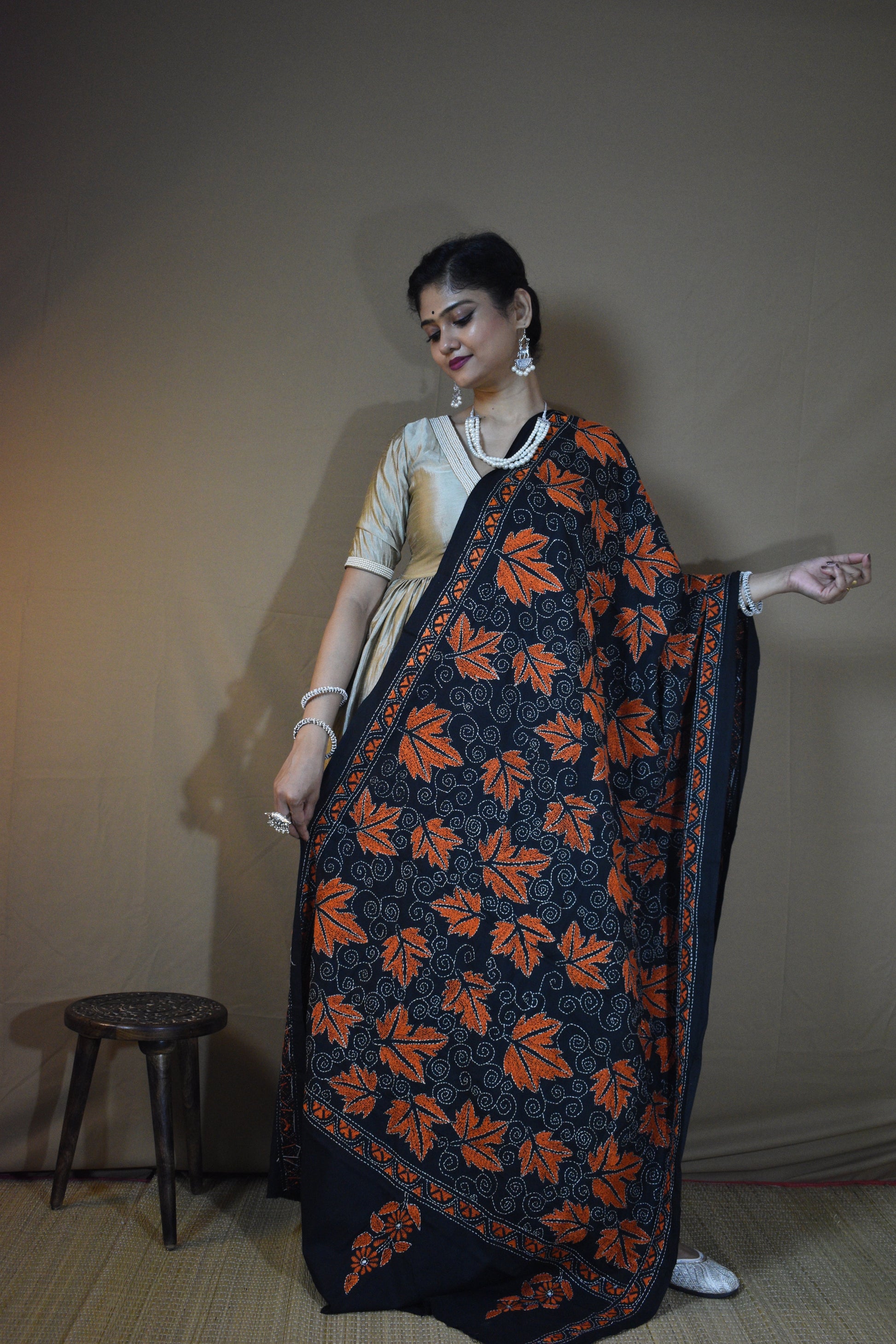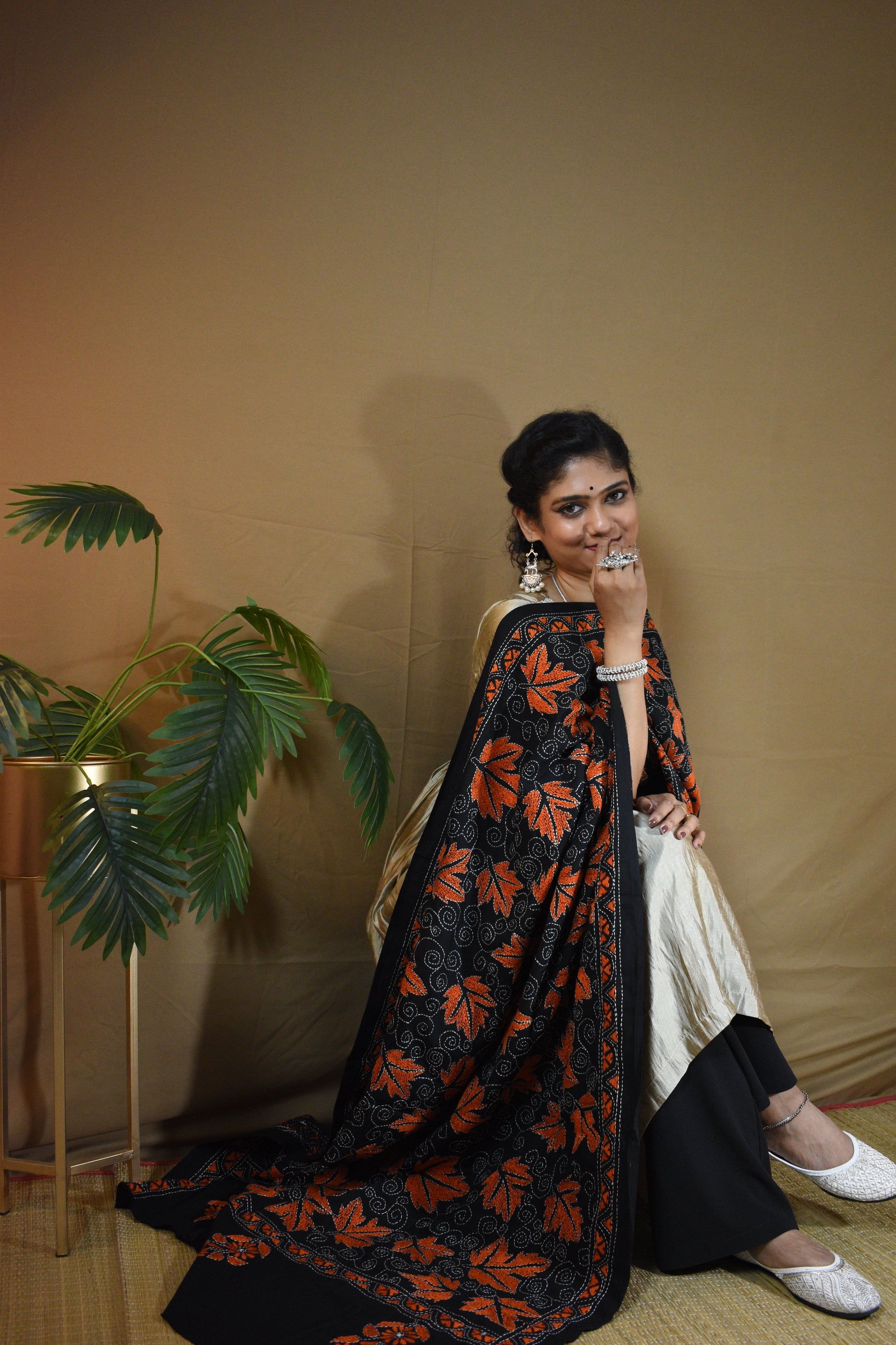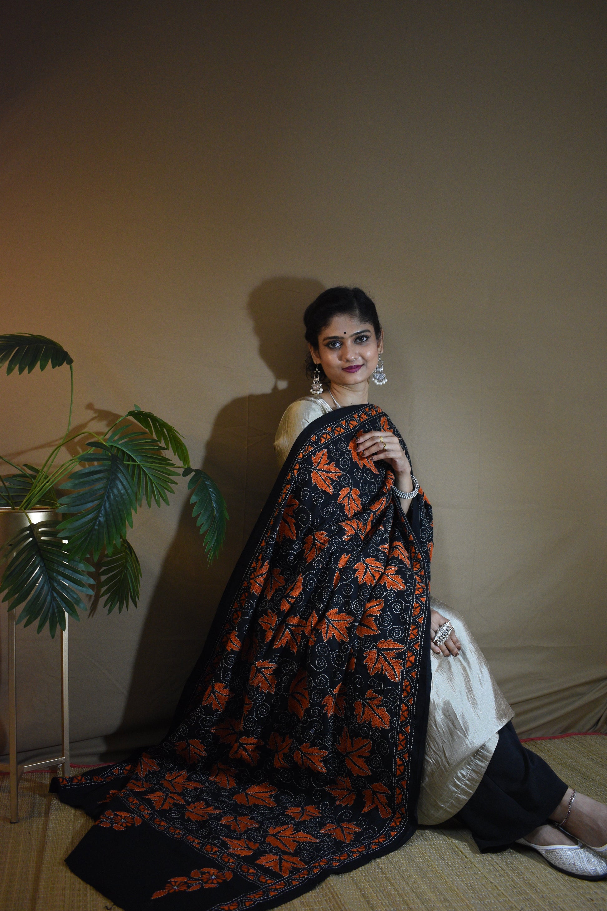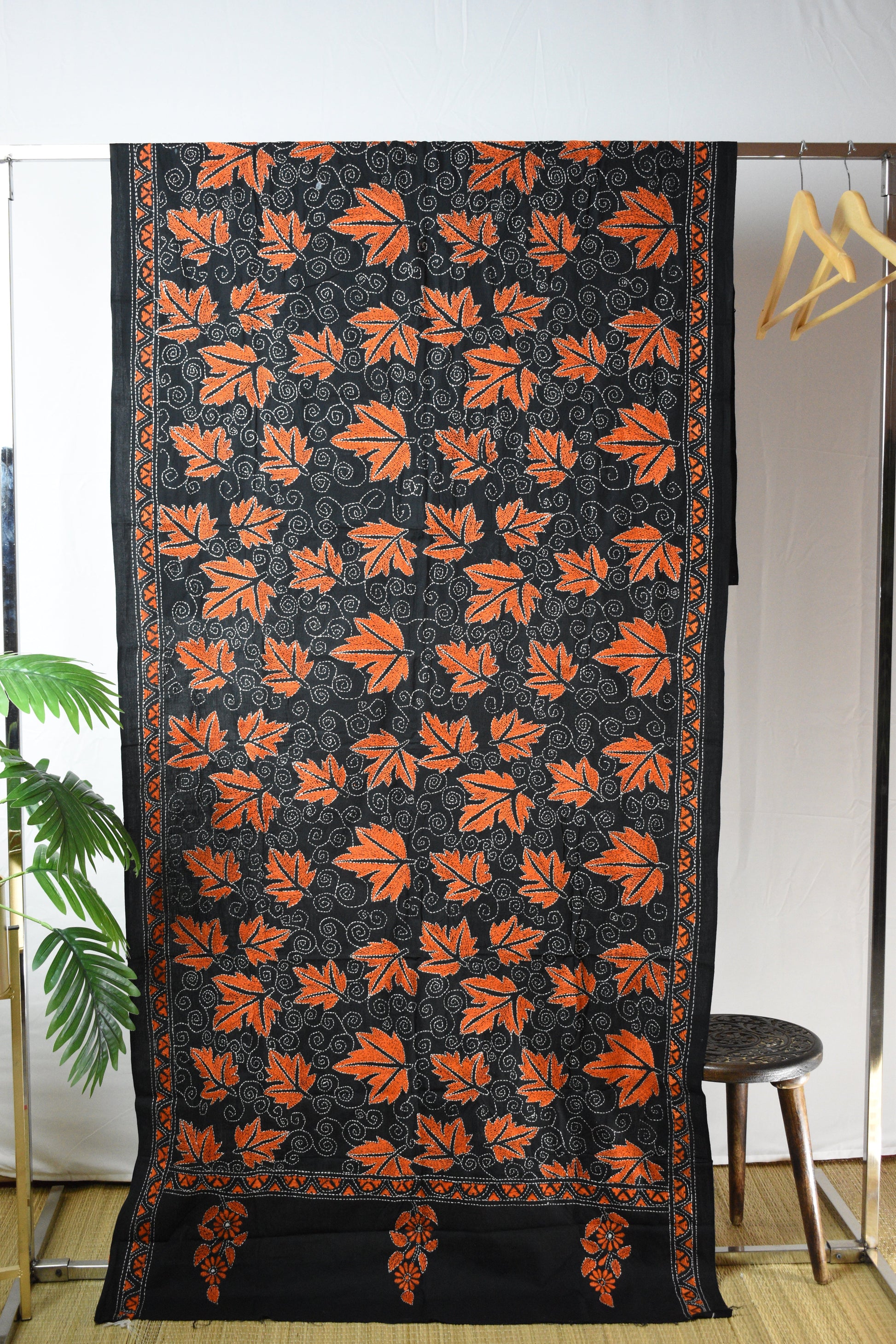 Experience the timeless charm of Bengal’s Kantha artistry with our Black Leaf Motif Pure Cotton Hand Embroidered Kantha Dupatta. Hand-embroidered by skilled women artisans, each dupatta is a celebration of patience and heritage, with running stitches that bring alive traditional motifs. The Pure Cotton fabric feels soft, airy, and light on the skin. The Black base, accented with bright Orange color threadwork, gives a graceful charm that blends effortlessly with traditional as well as contemporary looks. A Dupatta not just to wear, but to treasure, as art, as memory, as legacy.