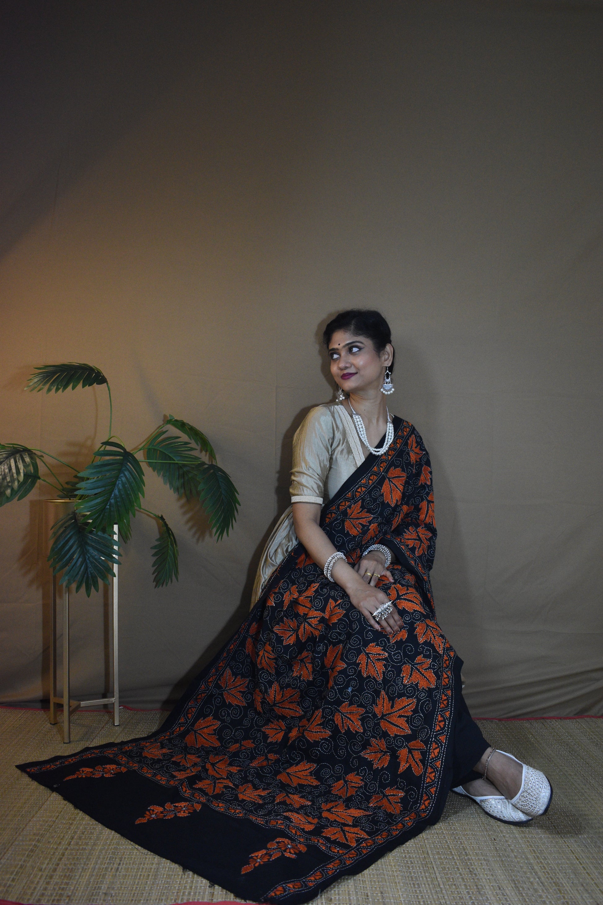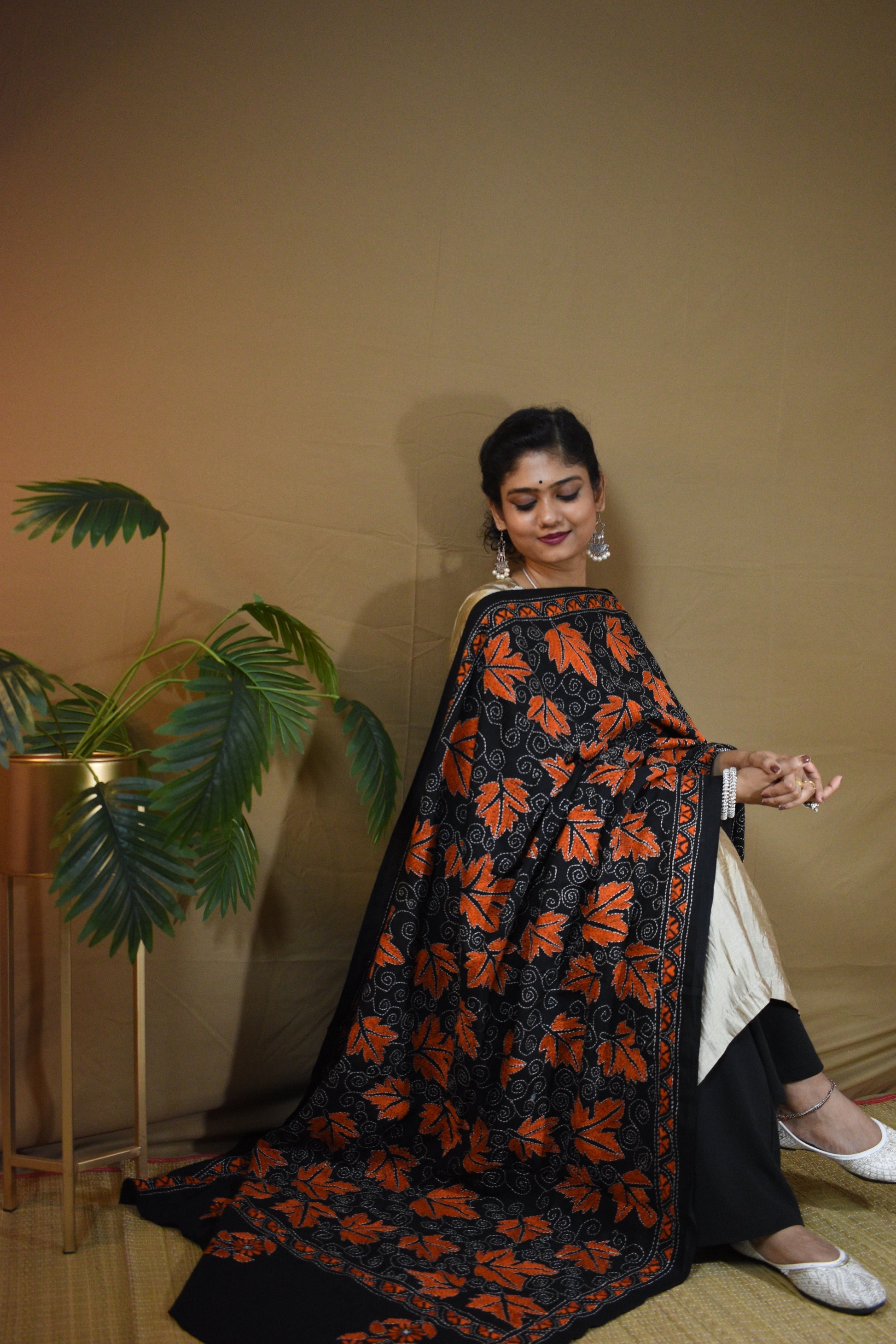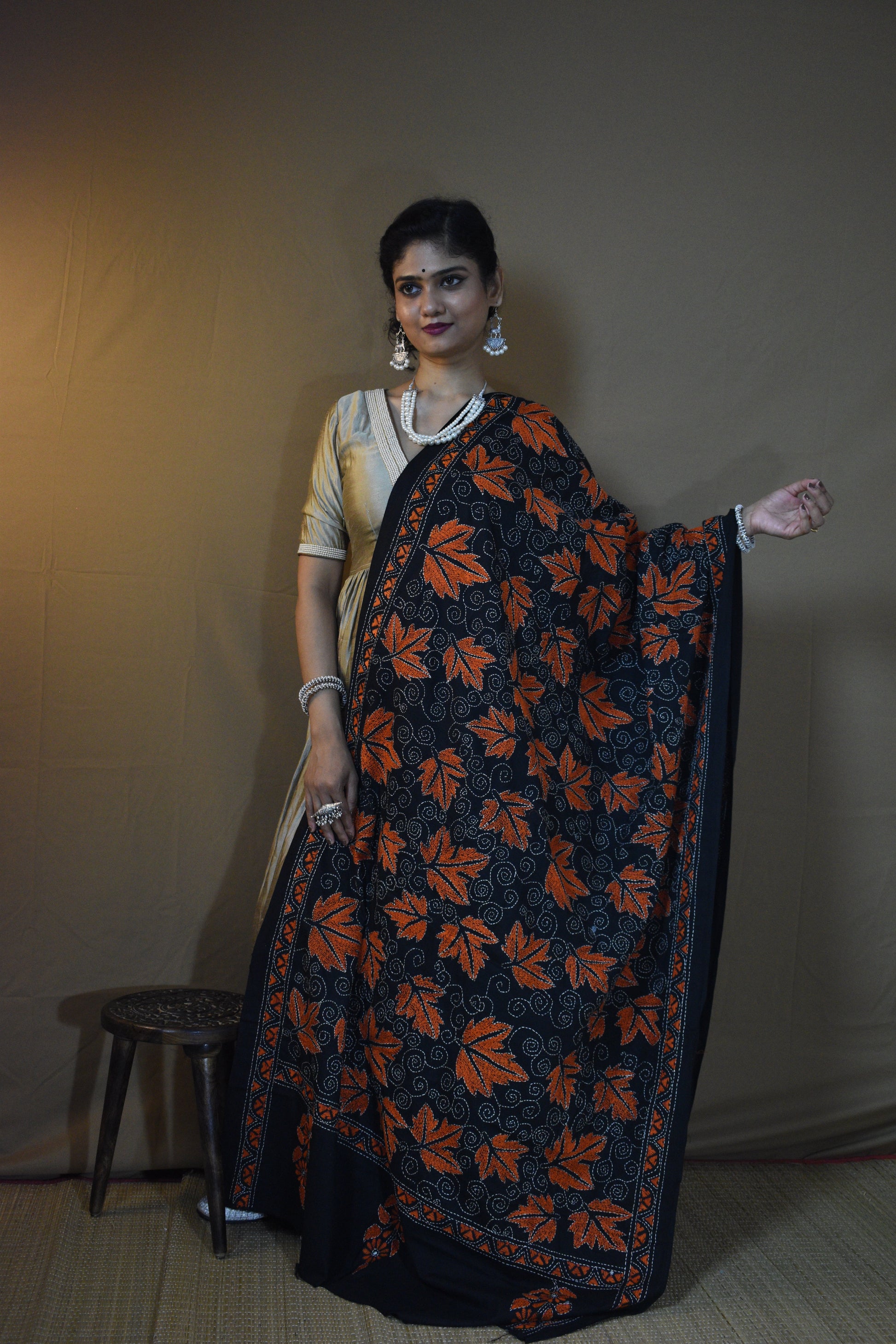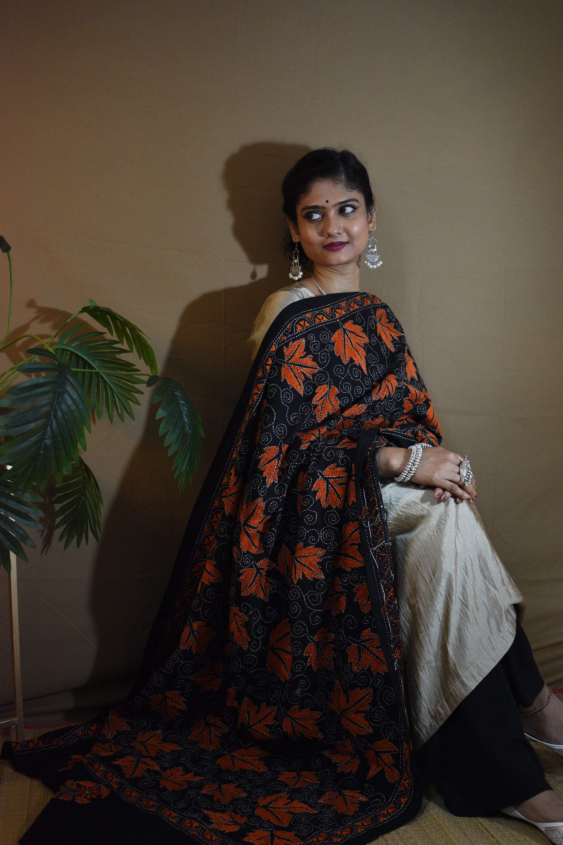 Experience the timeless charm of Bengal’s Kantha artistry with our Black Leaf Motif Pure Cotton Hand Embroidered Kantha Dupatta. Hand-embroidered by skilled women artisans, each dupatta is a celebration of patience and heritage, with running stitches that bring alive traditional motifs. The Pure Cotton fabric feels soft, airy, and light on the skin. The Black base, accented with bright Orange color threadwork, gives a graceful charm that blends effortlessly with traditional as well as contemporary looks. A Dupatta not just to wear, but to treasure, as art, as memory, as legacy.