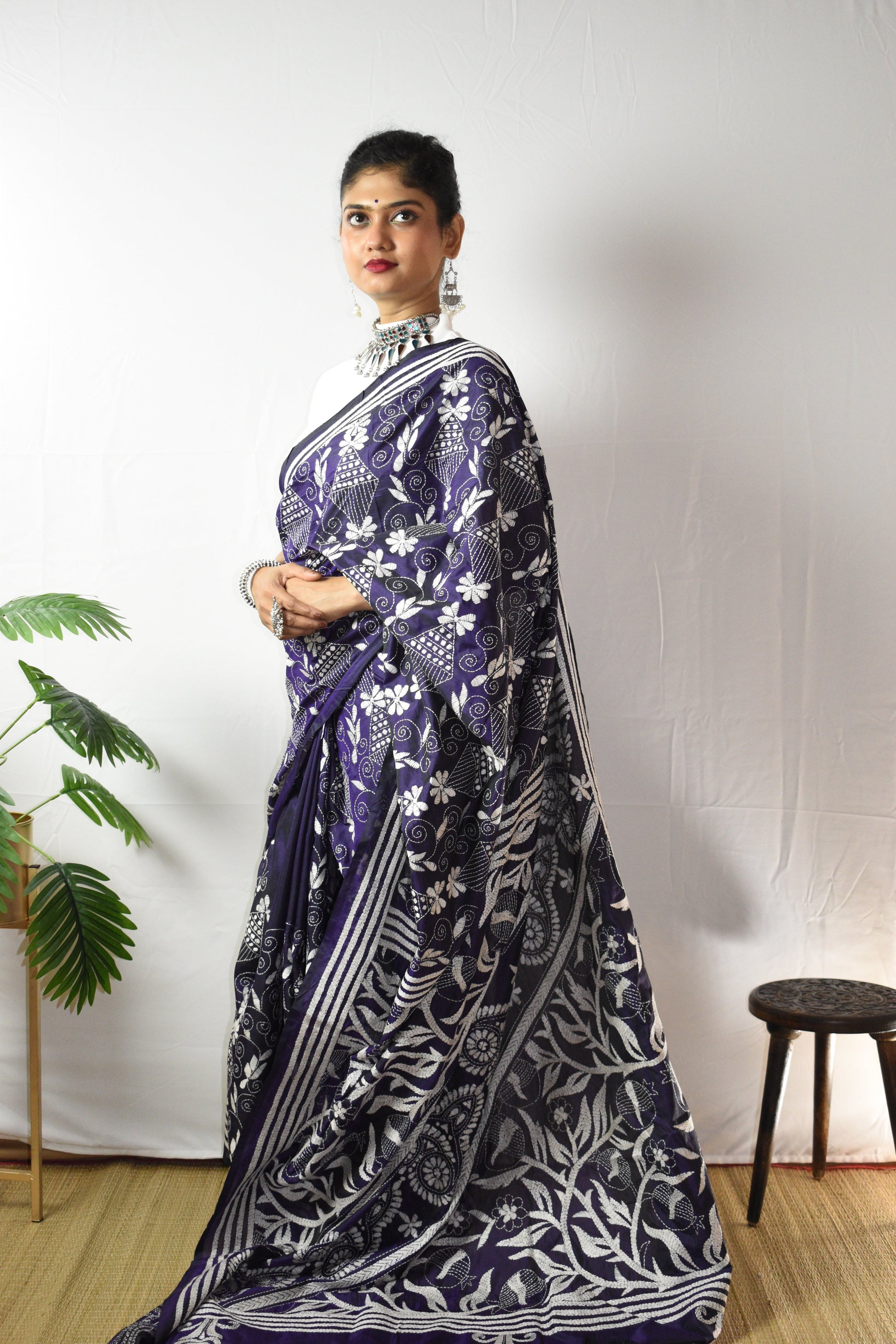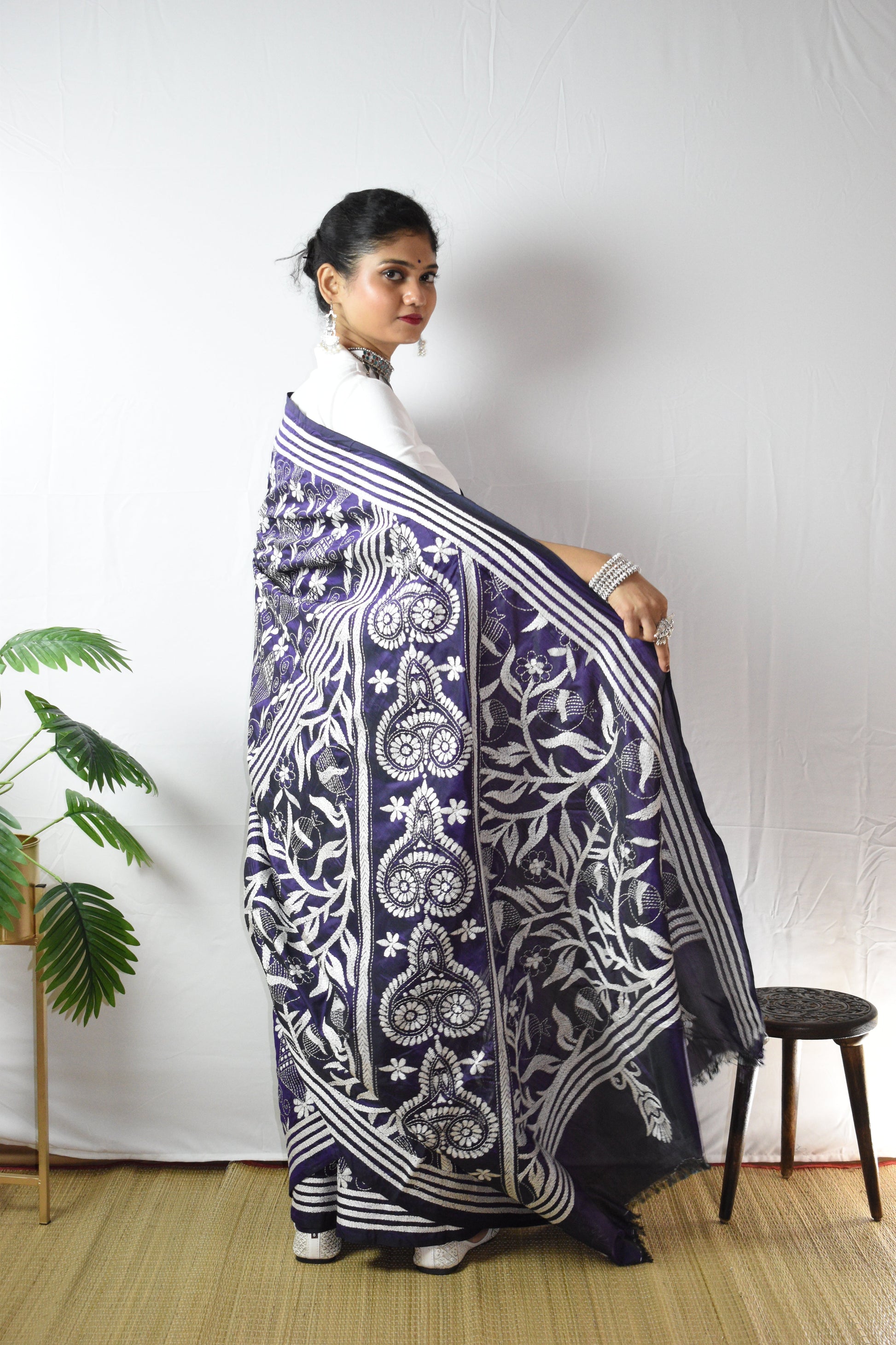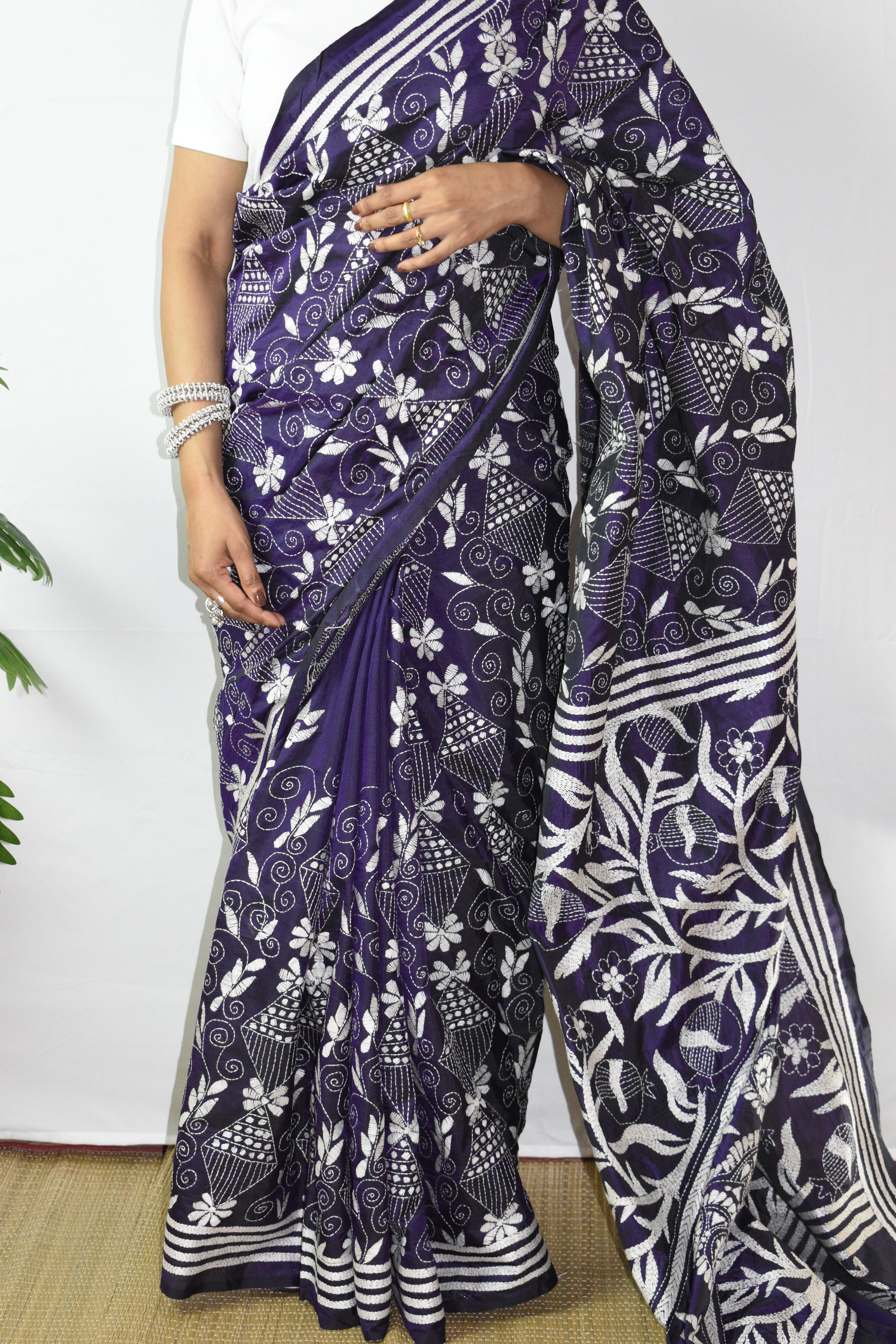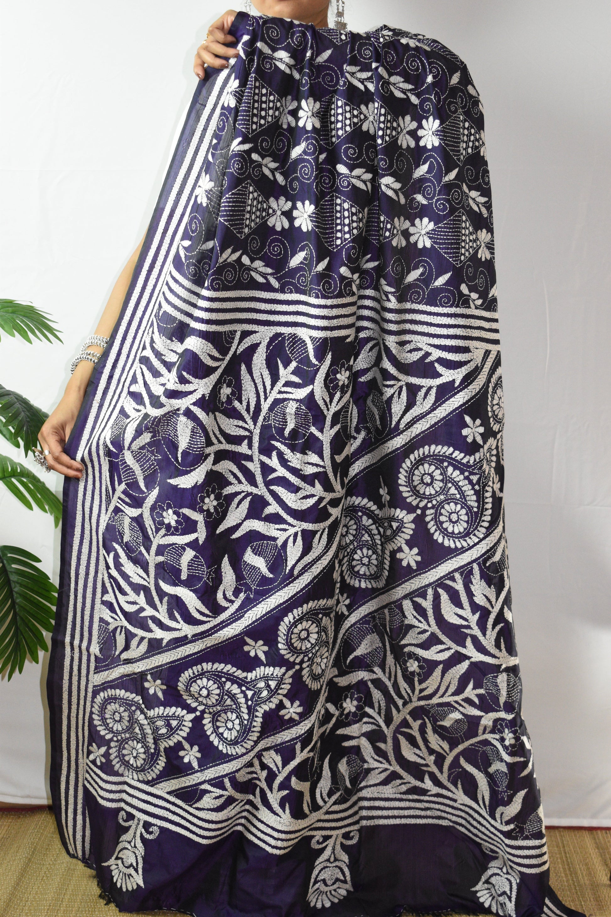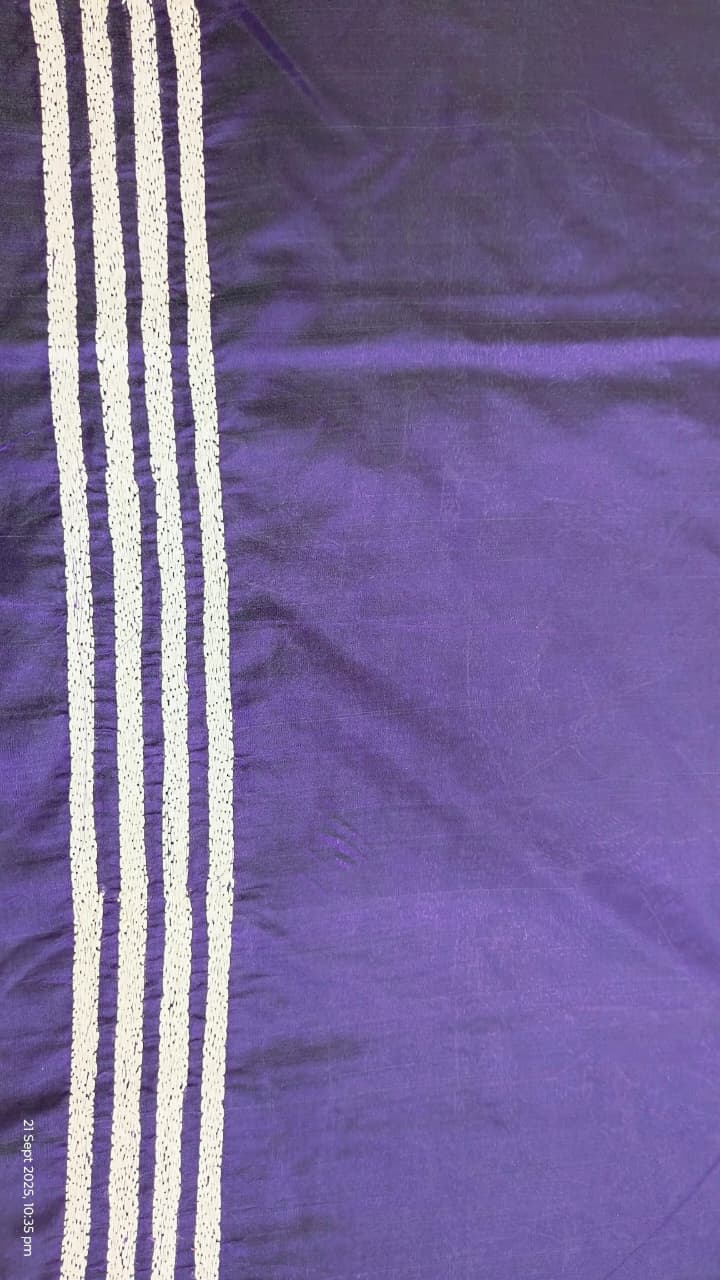 Discover the intricate beauty of our hand-embroidered Purple Floral Hand Embroidered Kantha Silk Saree. Each piece is individually crafted by our talented women artisans using traditional kantha stitching and delicate kantha embroidery, turning fine silk into a one-of-a-kind artwork. This gorgeous Purple is lifted with White threadwork along the border and pallu, elegant, timeless, and unmistakably handmade. A saree not just to wear, but to treasure, as art, as memory, as legacy.
