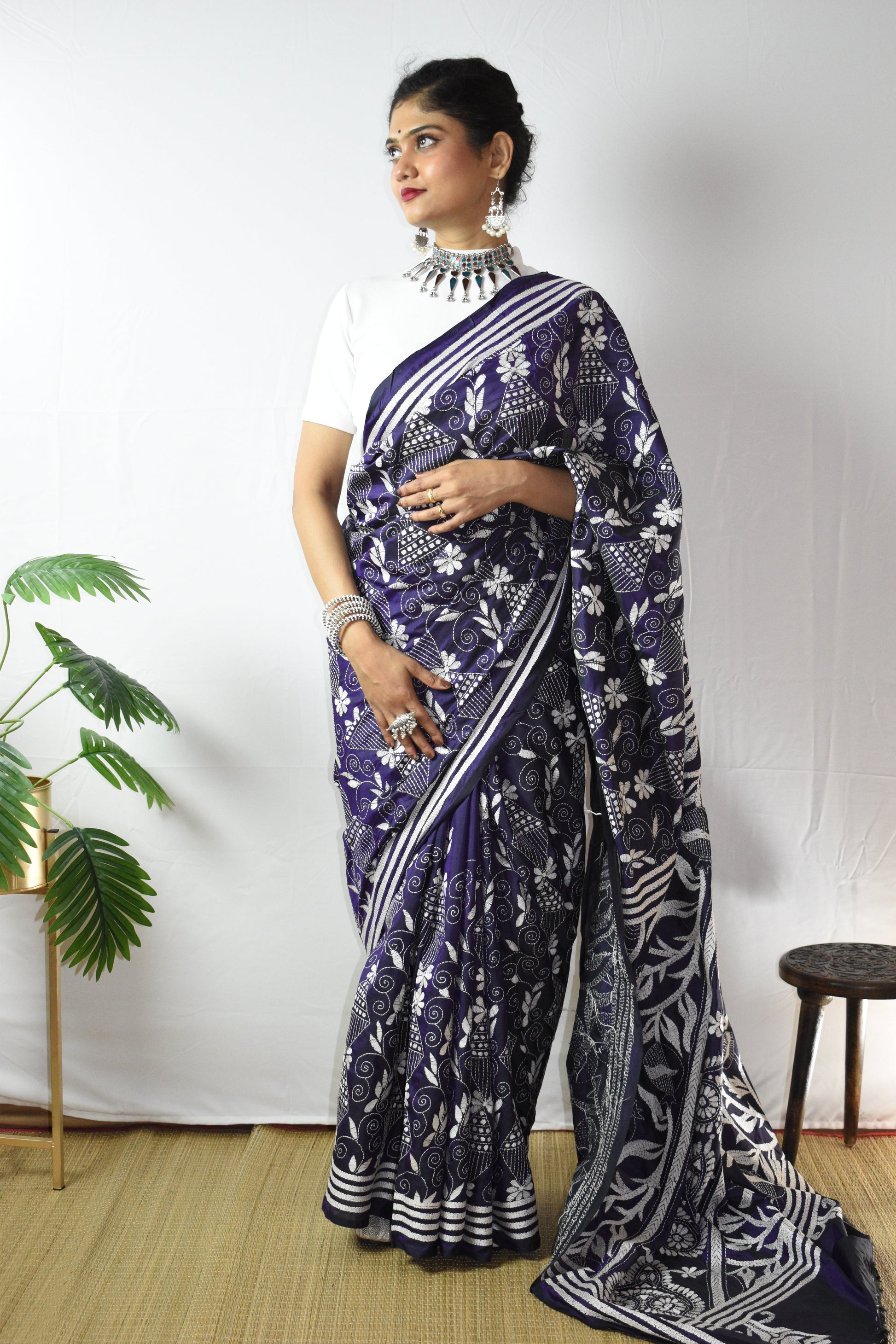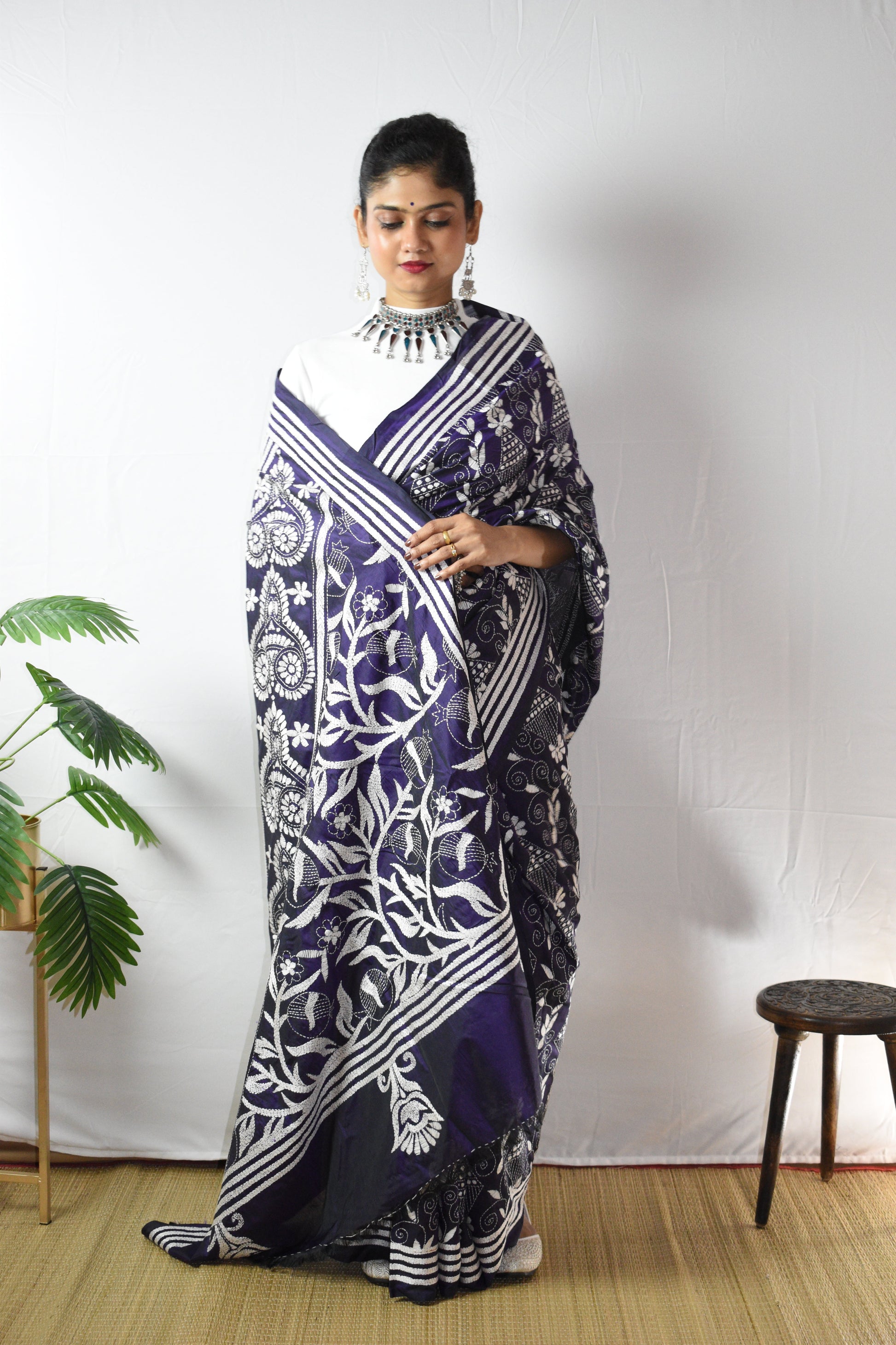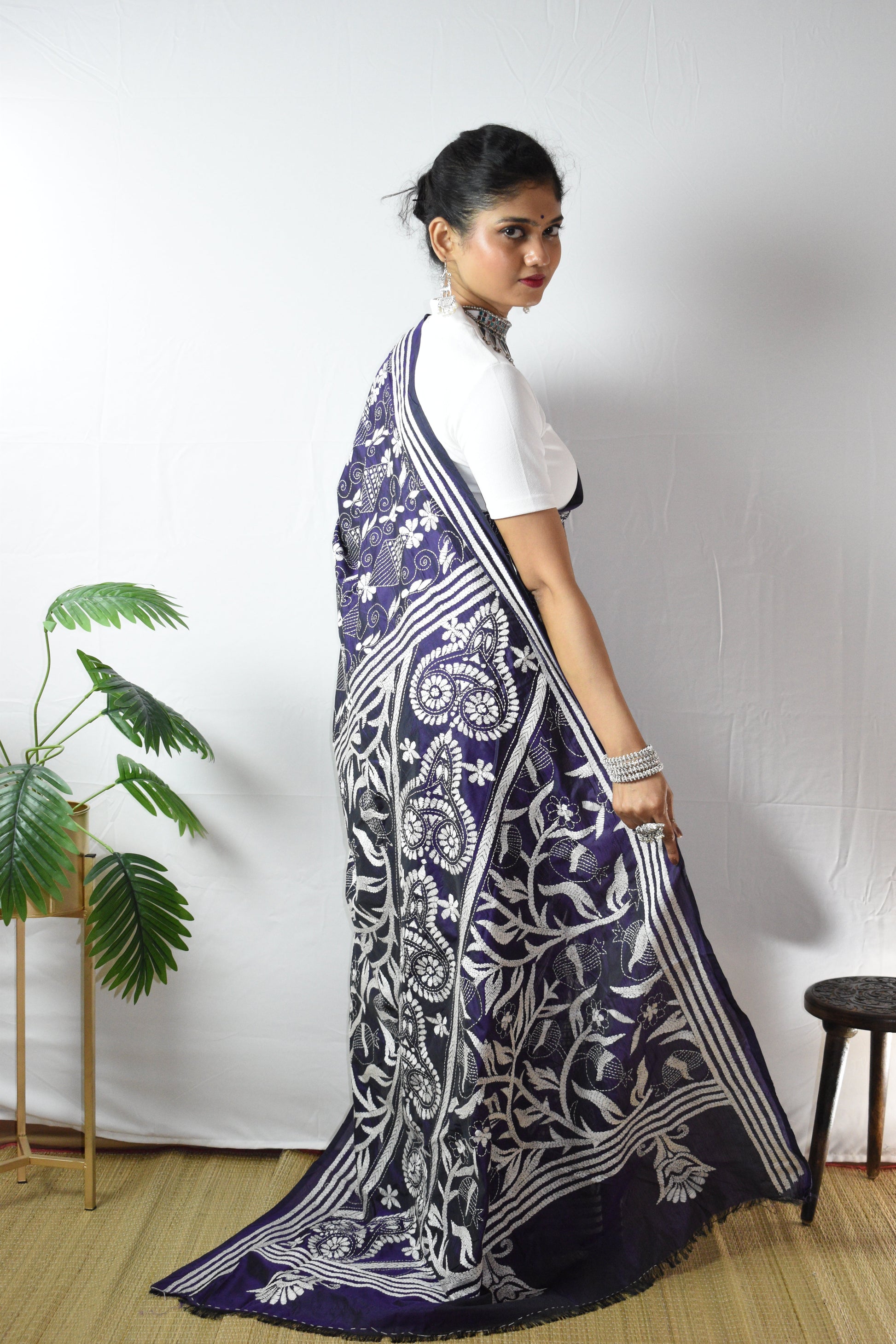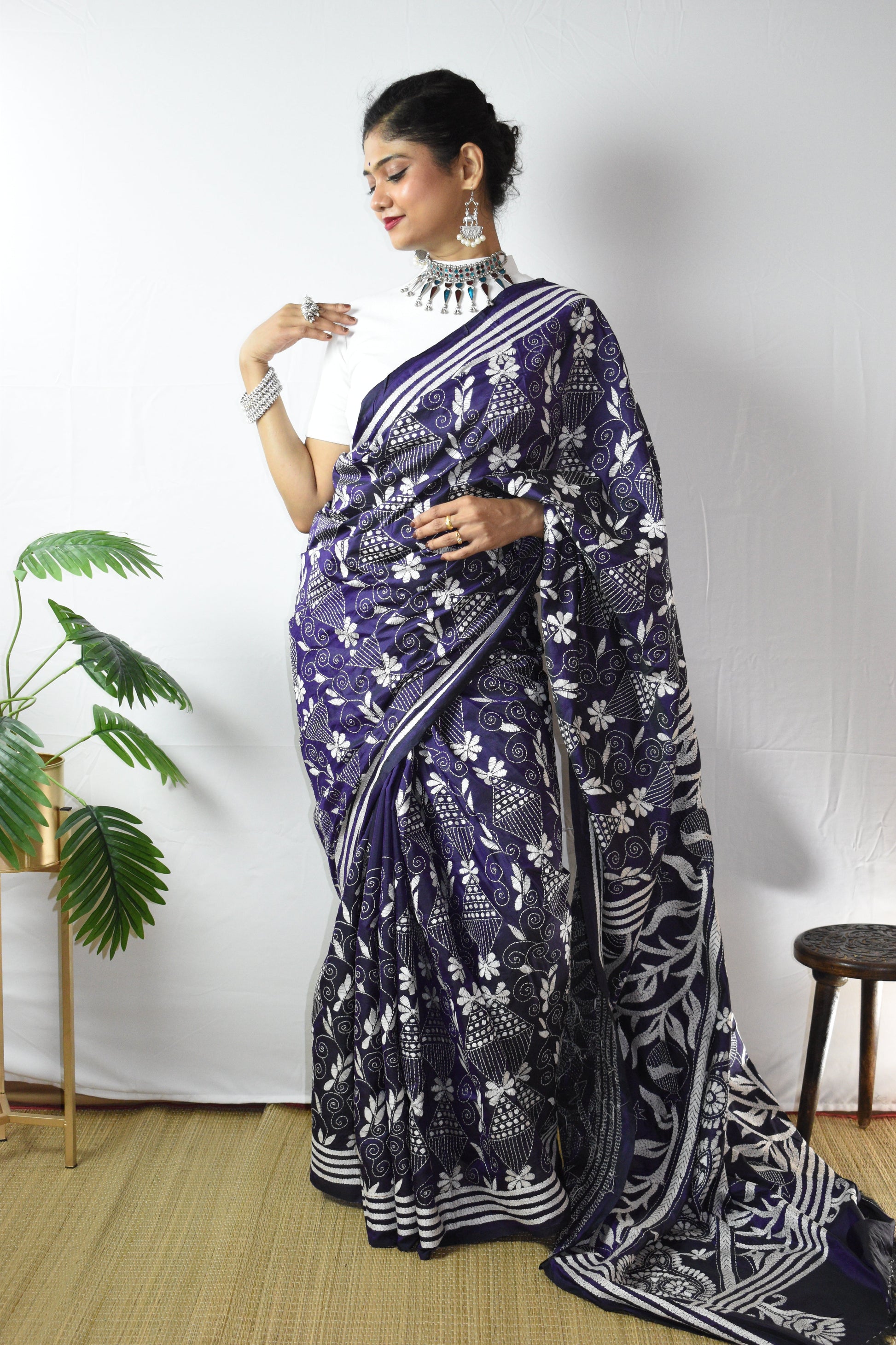 Discover the intricate beauty of our hand-embroidered Purple Floral Hand Embroidered Kantha Silk Saree. Each piece is individually crafted by our talented women artisans using traditional kantha stitching and delicate kantha embroidery, turning fine silk into a one-of-a-kind artwork. This gorgeous Purple is lifted with White threadwork along the border and pallu, elegant, timeless, and unmistakably handmade. A saree not just to wear, but to treasure, as art, as memory, as legacy.