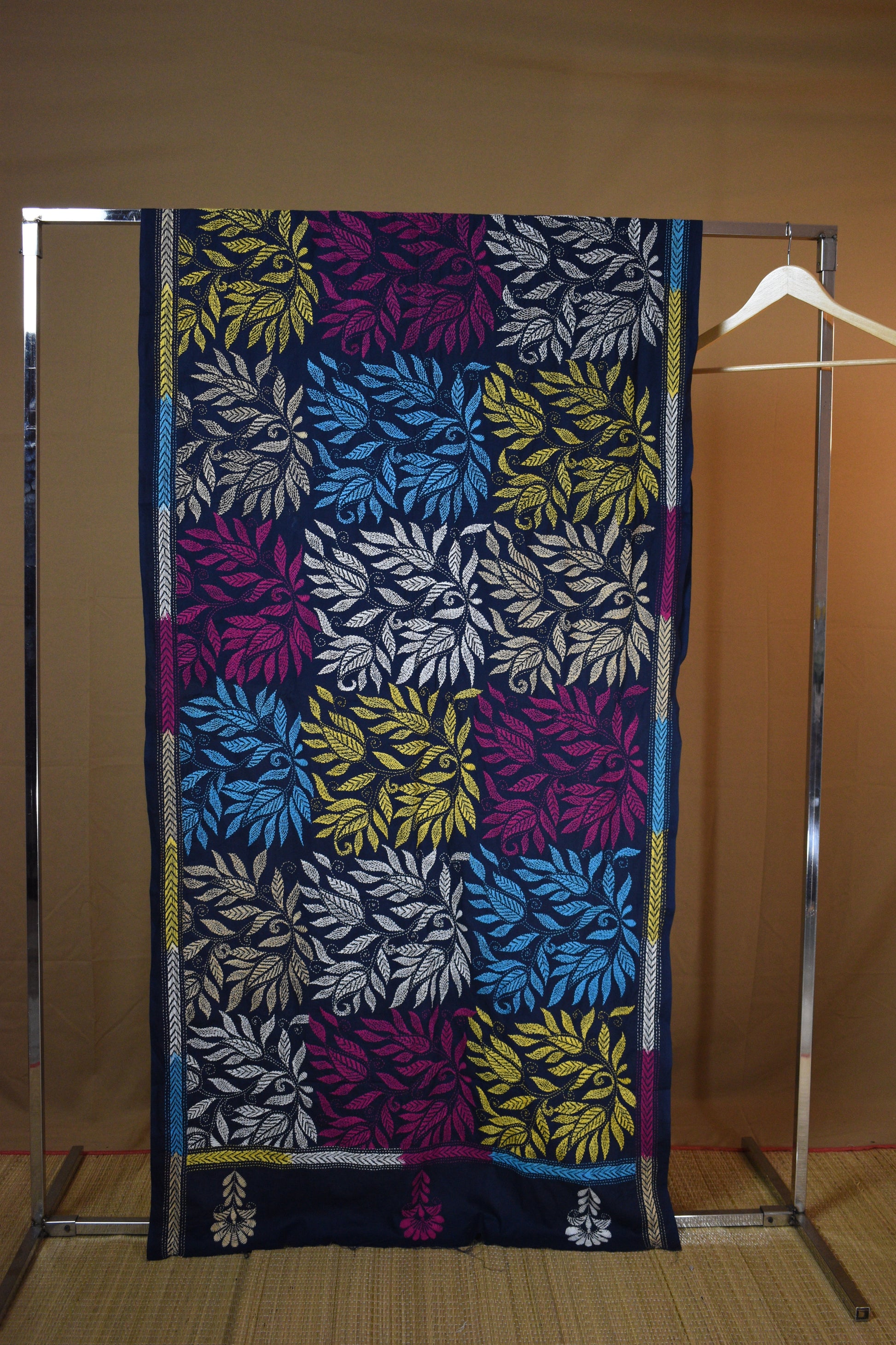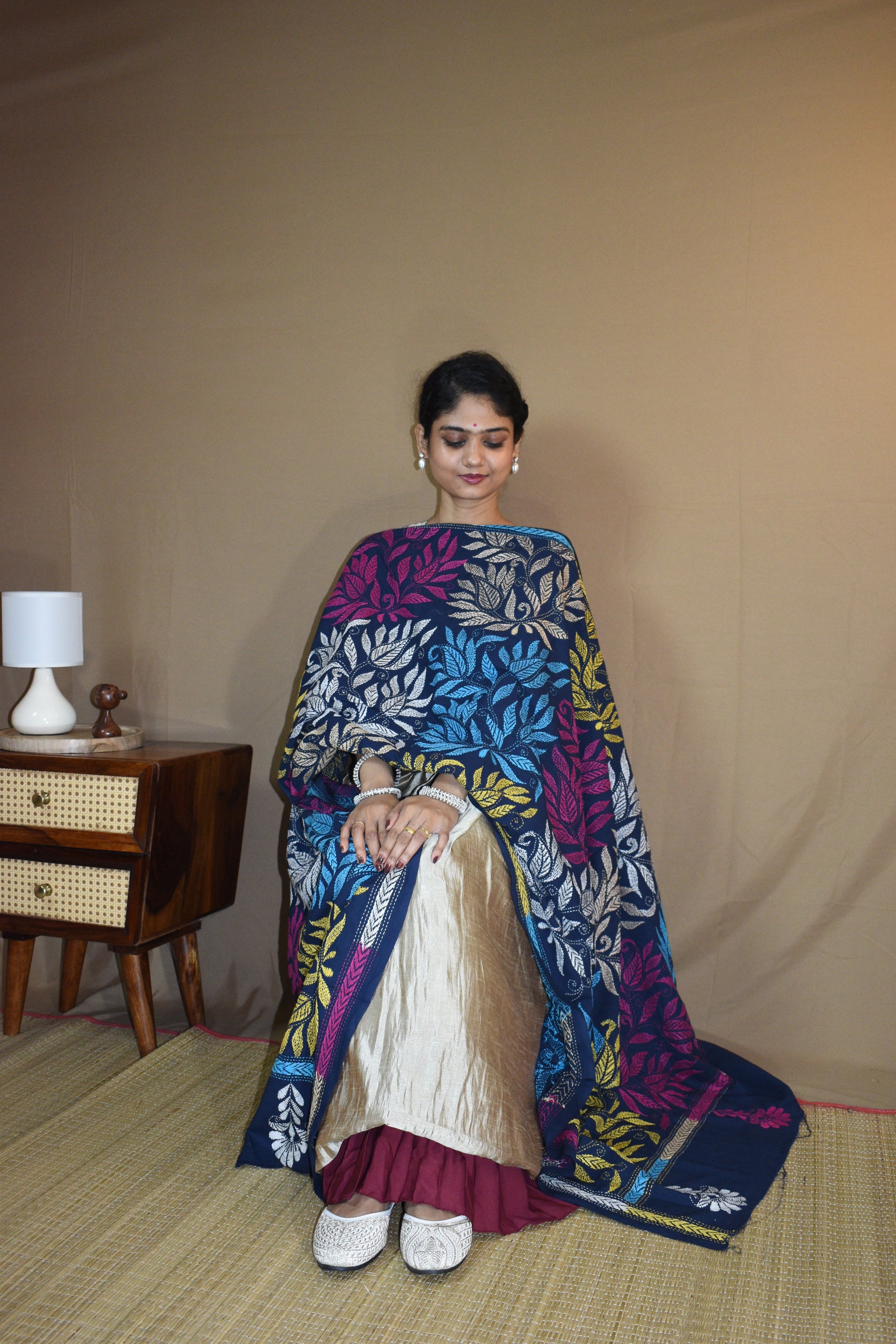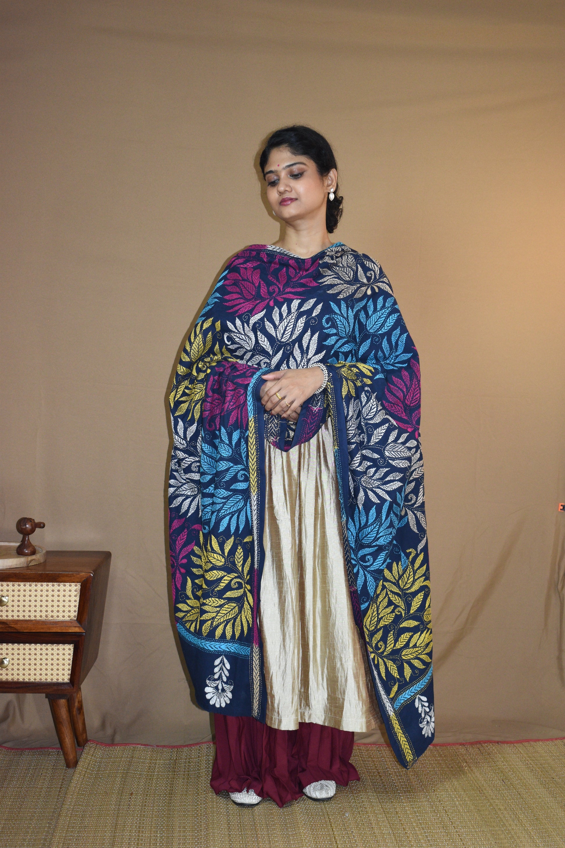 Experience the timeless charm of Bengal’s Kantha artistry with our Navy Blue Paisleys Theme Pure Cotton Hand Embroidered Kantha Dupatta. Hand-embroidered by skilled women artisans, each dupatta is a celebration of patience and heritage, with running stitches that bring alive traditional motifs. The Pure Cotton fabric feels soft, airy, and light on the skin. The Navy Blue base, accented with multi color threadwork, gives a graceful charm that blends effortlessly with traditional as well as contemporary looks. A Dupatta not just to wear, but to treasure, as art, as memory, as legacy.