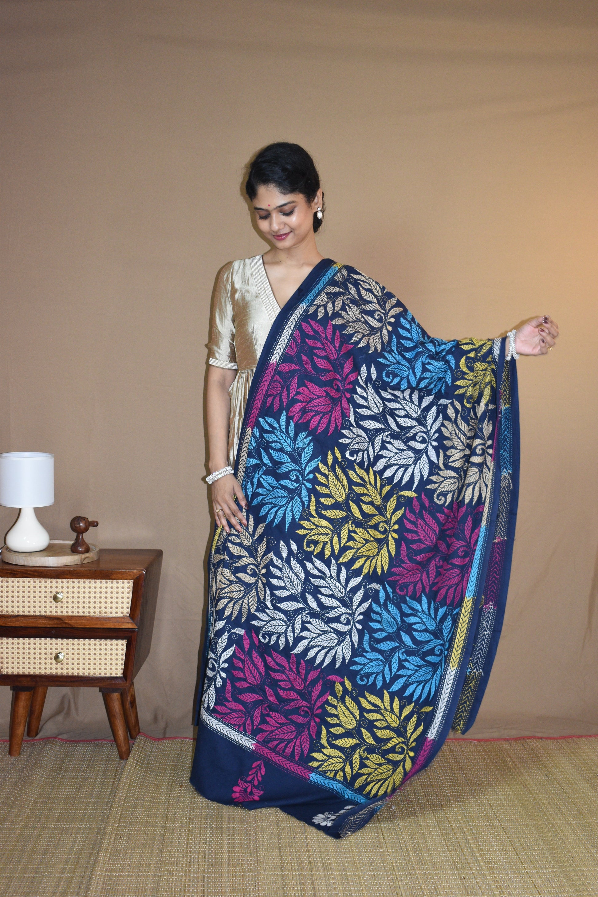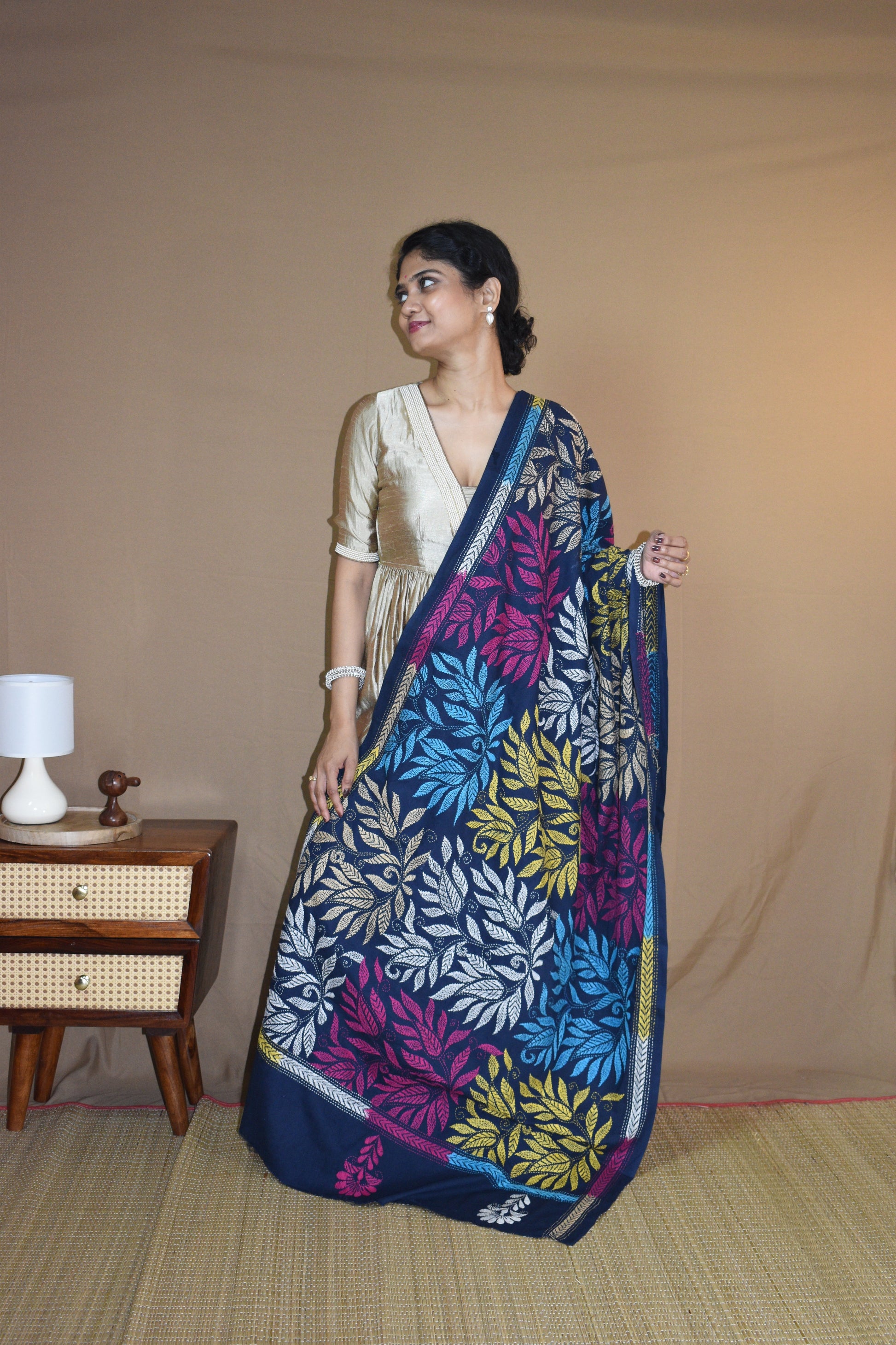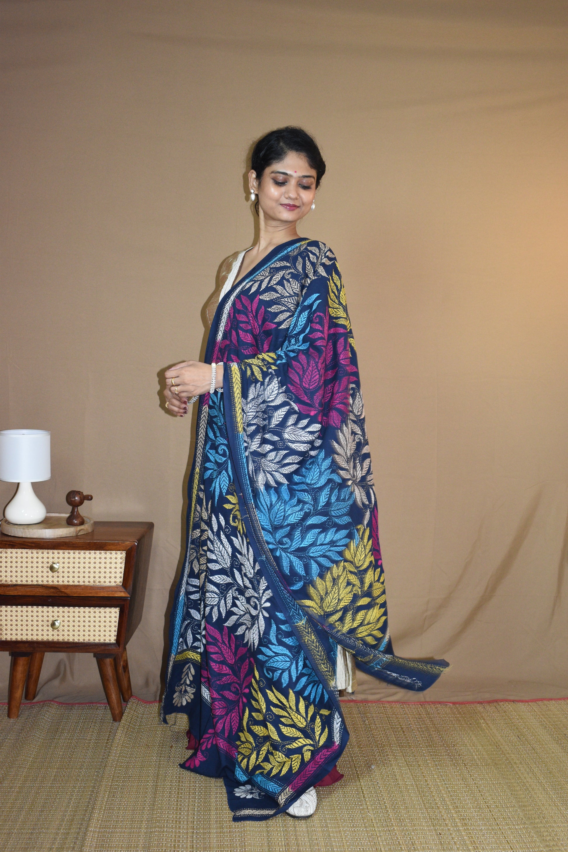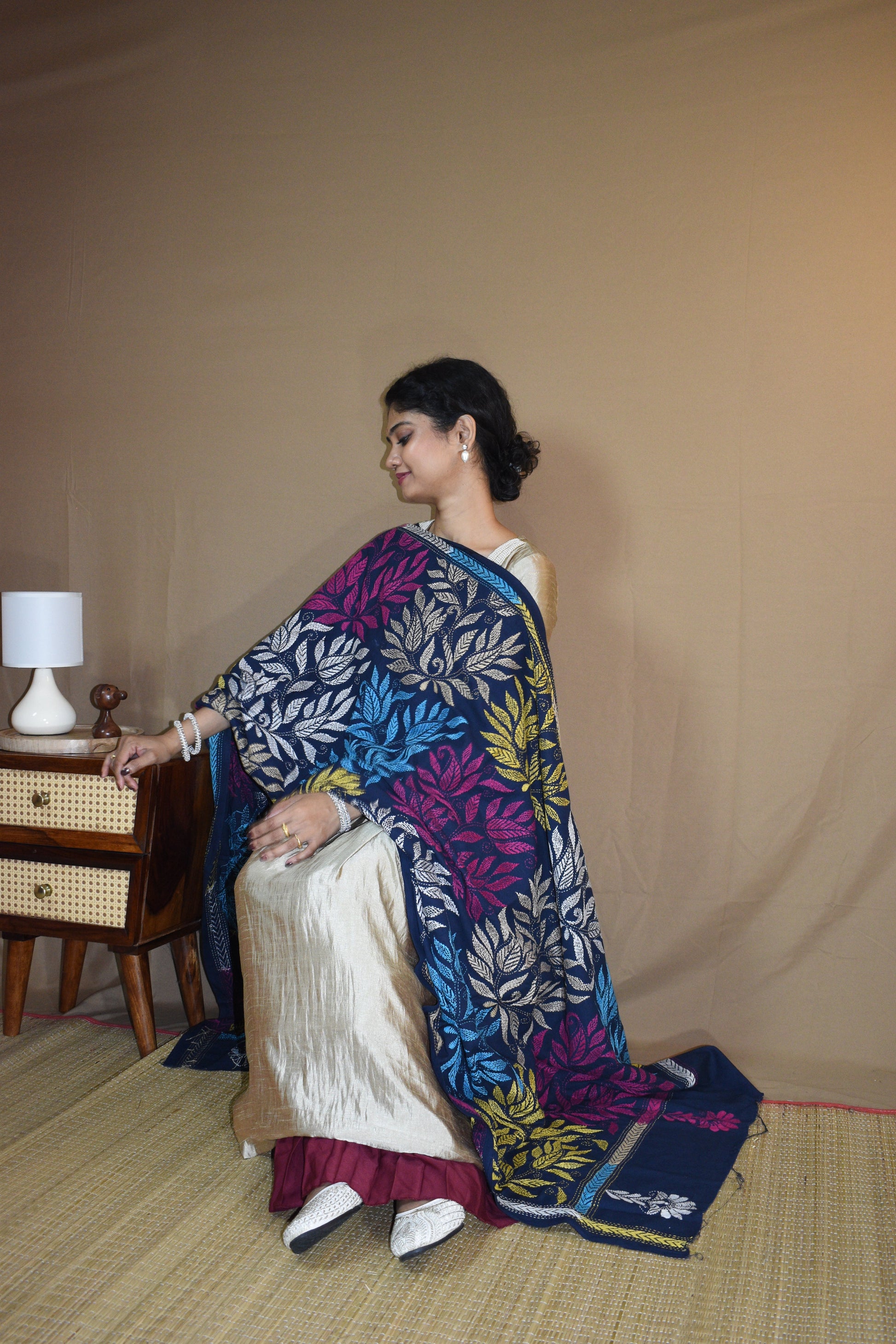 Experience the timeless charm of Bengal’s Kantha artistry with our Navy Blue Paisleys Theme Pure Cotton Hand Embroidered Kantha Dupatta. Hand-embroidered by skilled women artisans, each dupatta is a celebration of patience and heritage, with running stitches that bring alive traditional motifs. The Pure Cotton fabric feels soft, airy, and light on the skin. The Navy Blue base, accented with multi color threadwork, gives a graceful charm that blends effortlessly with traditional as well as contemporary looks. A Dupatta not just to wear, but to treasure, as art, as memory, as legacy.