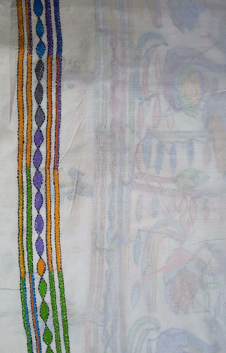 Colour: White Lotus Theme Hand Embroidered Kantha Silk Saree
