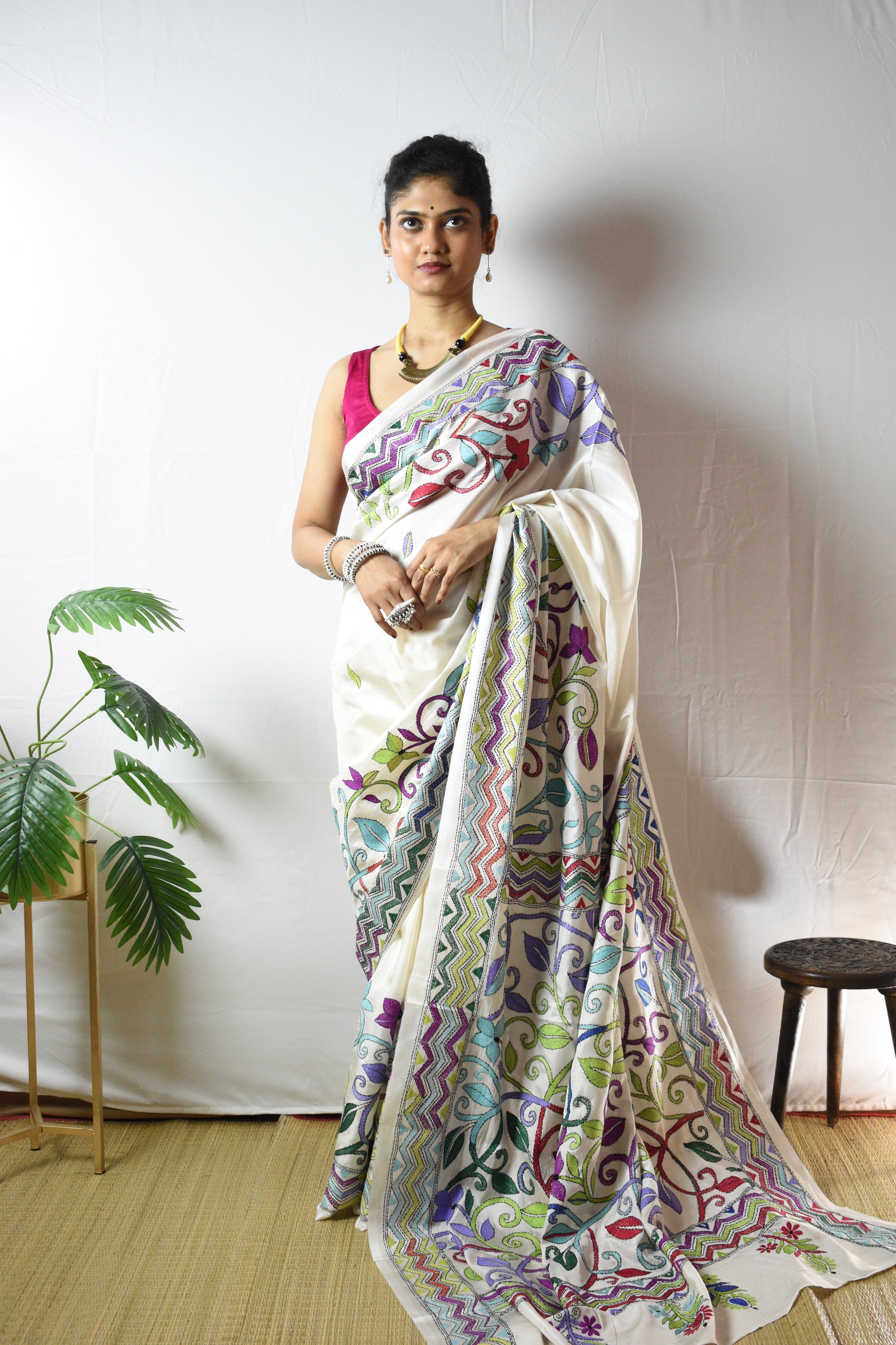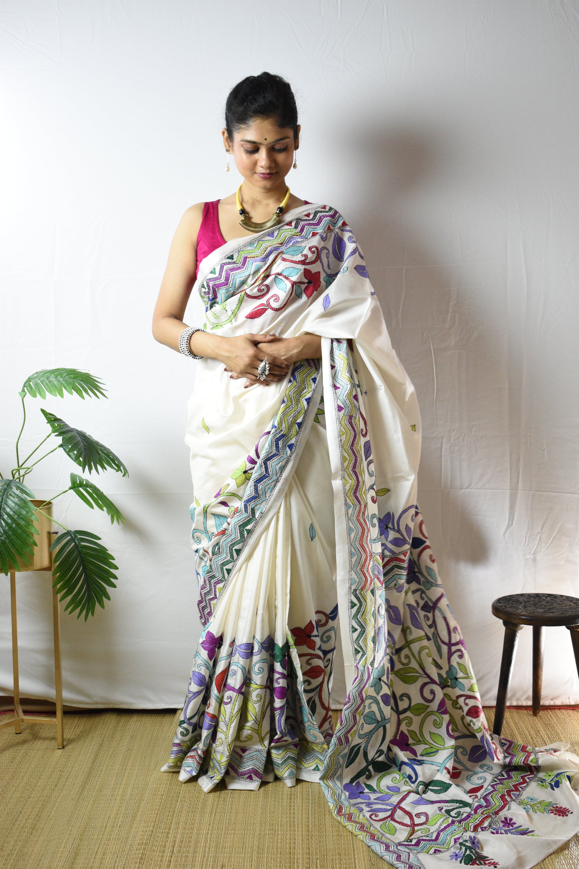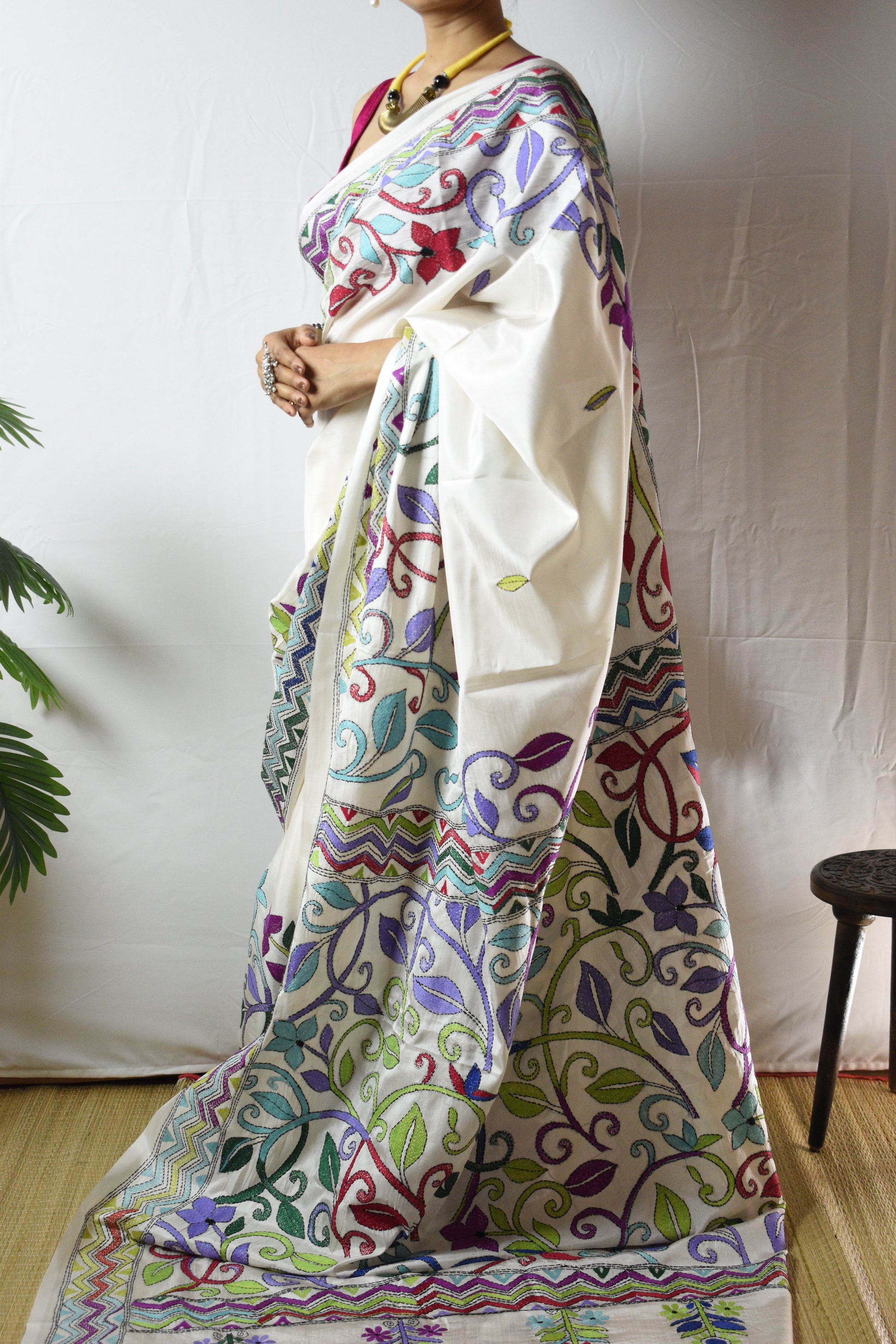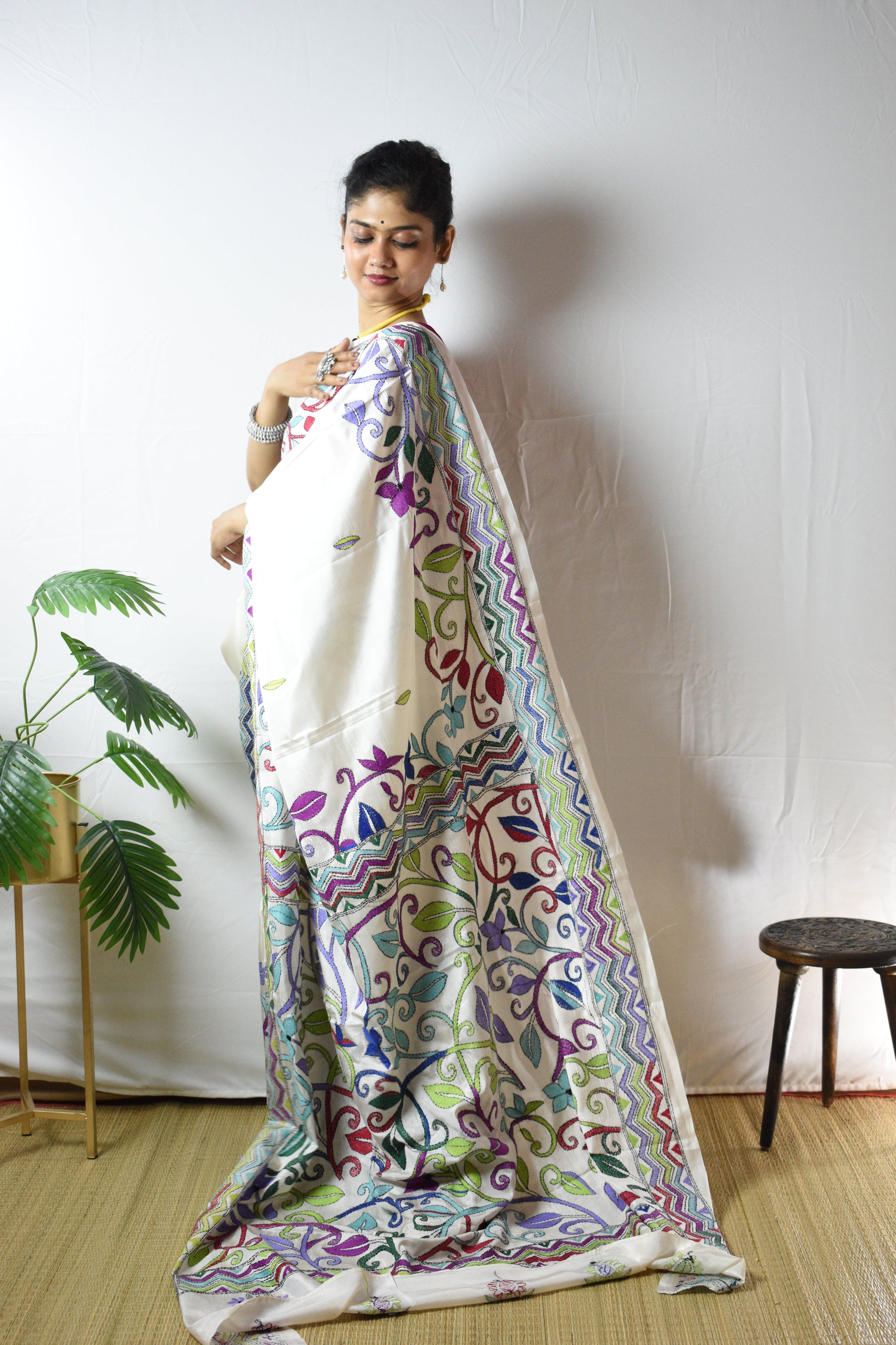 Discover the intricate beauty of our hand-embroidered White Floral Hand Embroidered Kantha Silk Saree. Each piece is individually crafted by our talented women artisans using traditional kantha stitching and delicate kantha embroidery, turning fine silk into a one-of-a-kind artwork. The white palette is lifted with multicolour threadwork along the border and pallu, elegant, timeless, and unmistakably handmade. A saree not just to wear, but to treasure, as art, as memory, as legacy.