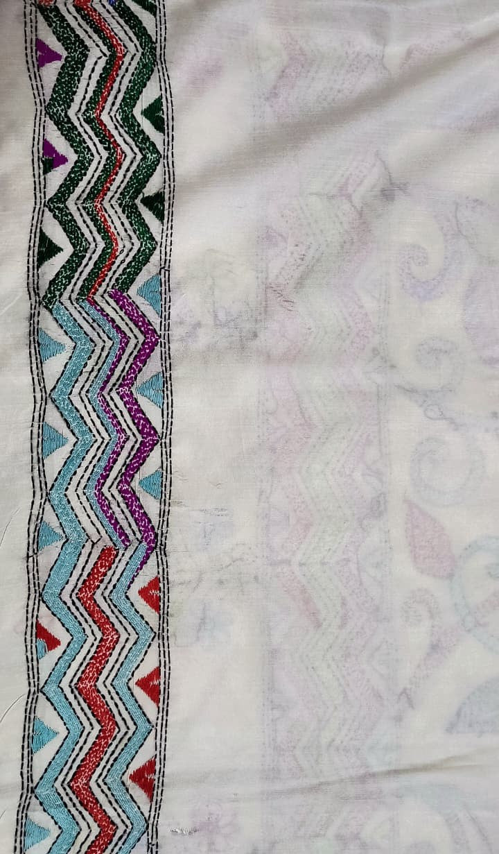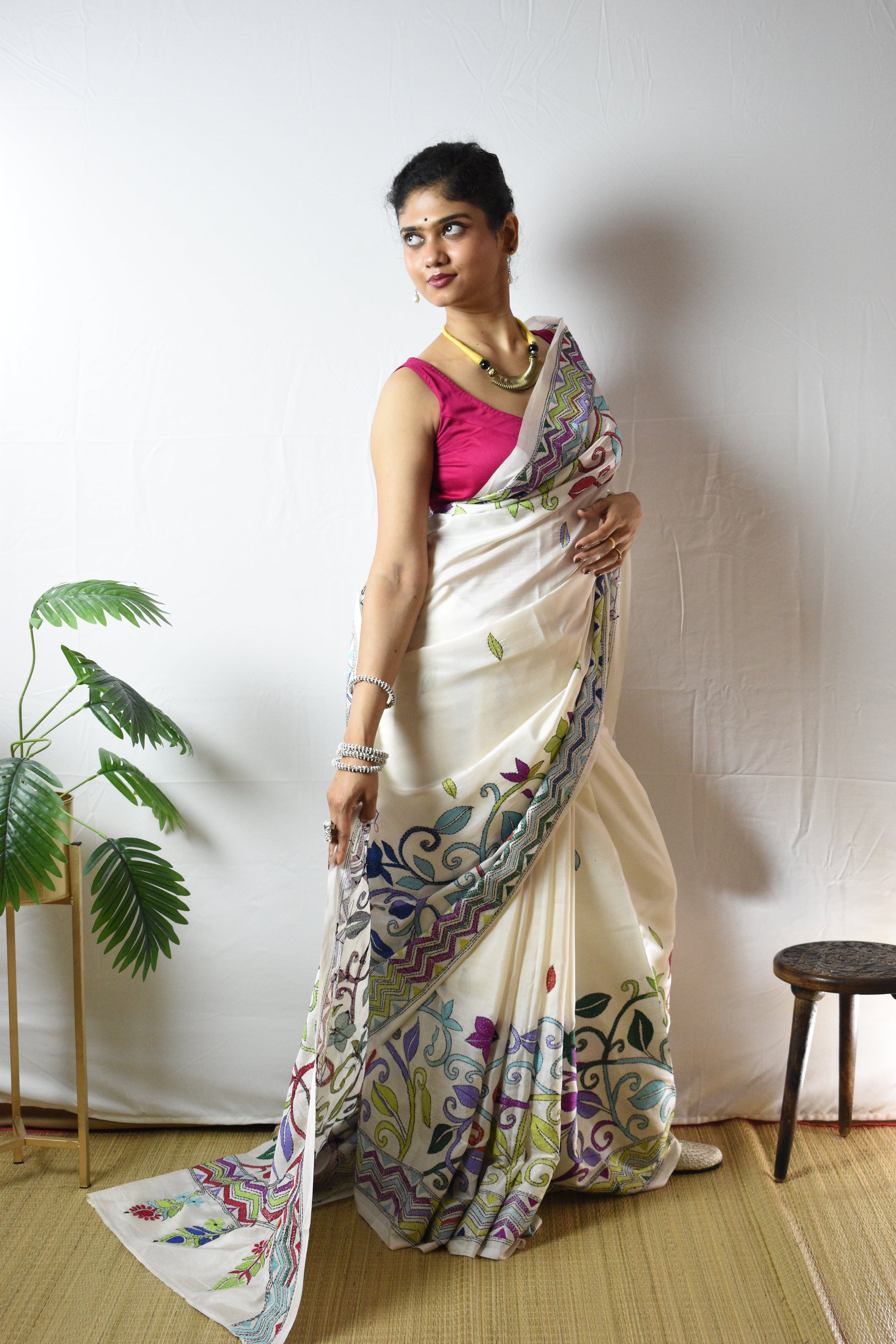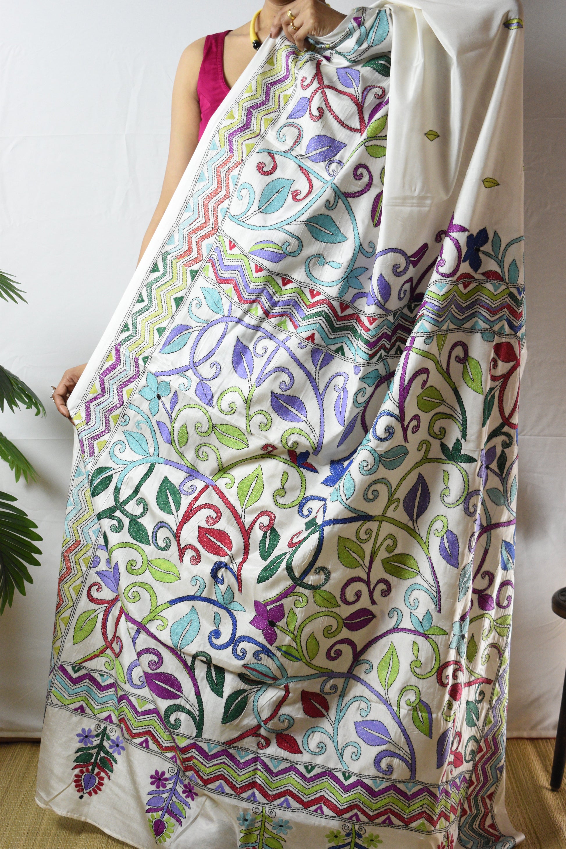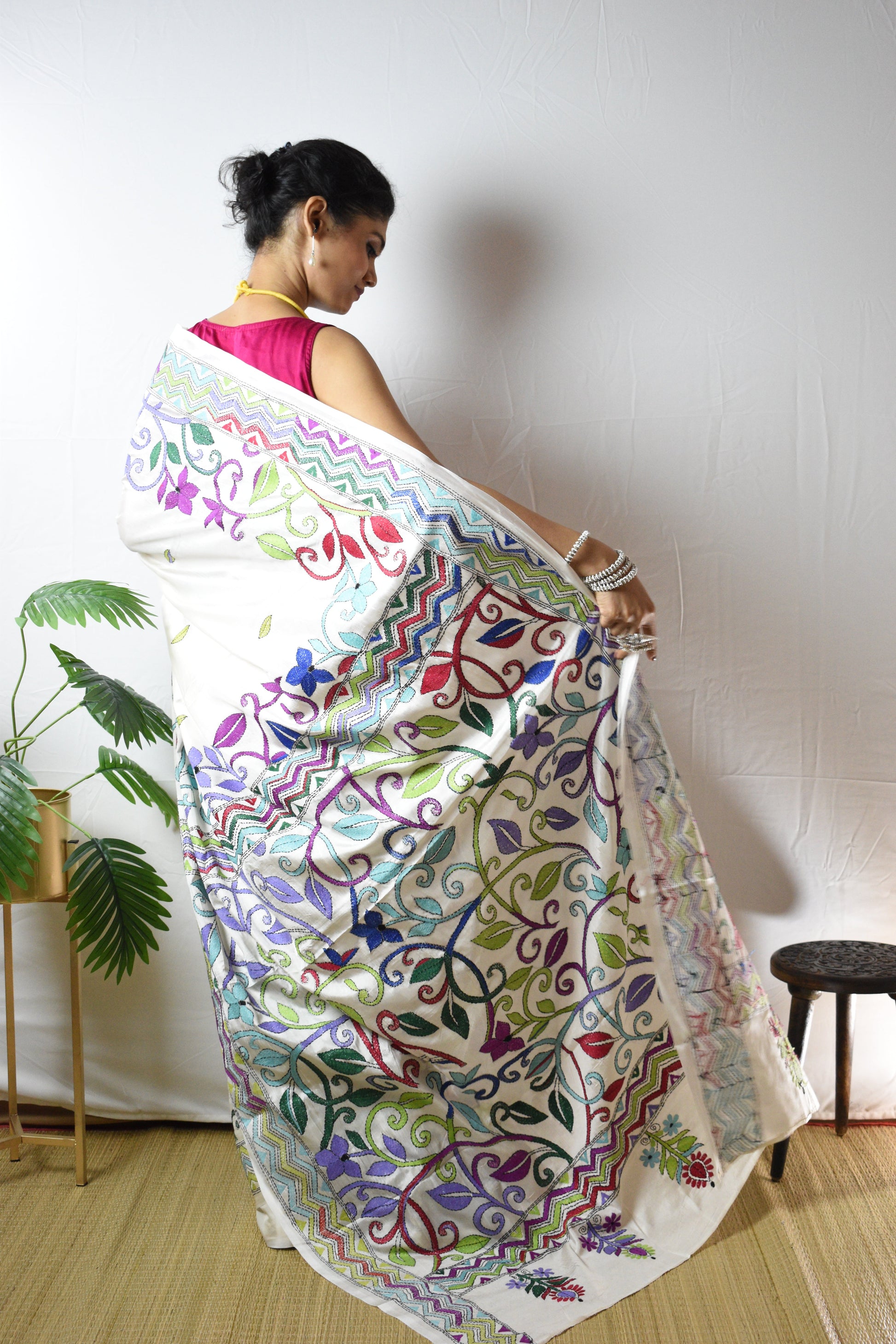 Discover the intricate beauty of our hand-embroidered White Floral Hand Embroidered Kantha Silk Saree. Each piece is individually crafted by our talented women artisans using traditional kantha stitching and delicate kantha embroidery, turning fine silk into a one-of-a-kind artwork. The white palette is lifted with multicolour threadwork along the border and pallu, elegant, timeless, and unmistakably handmade. A saree not just to wear, but to treasure, as art, as memory, as legacy.