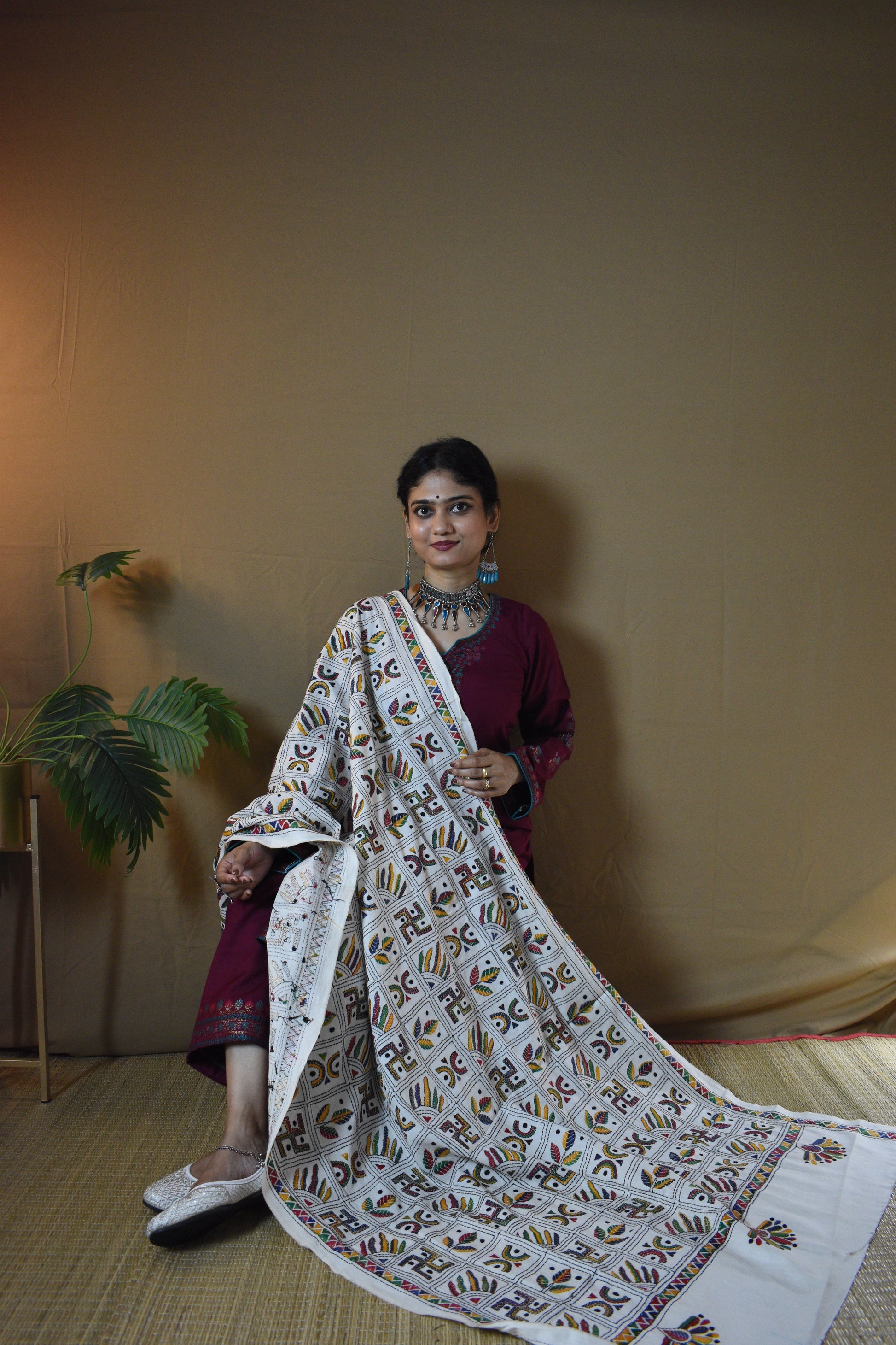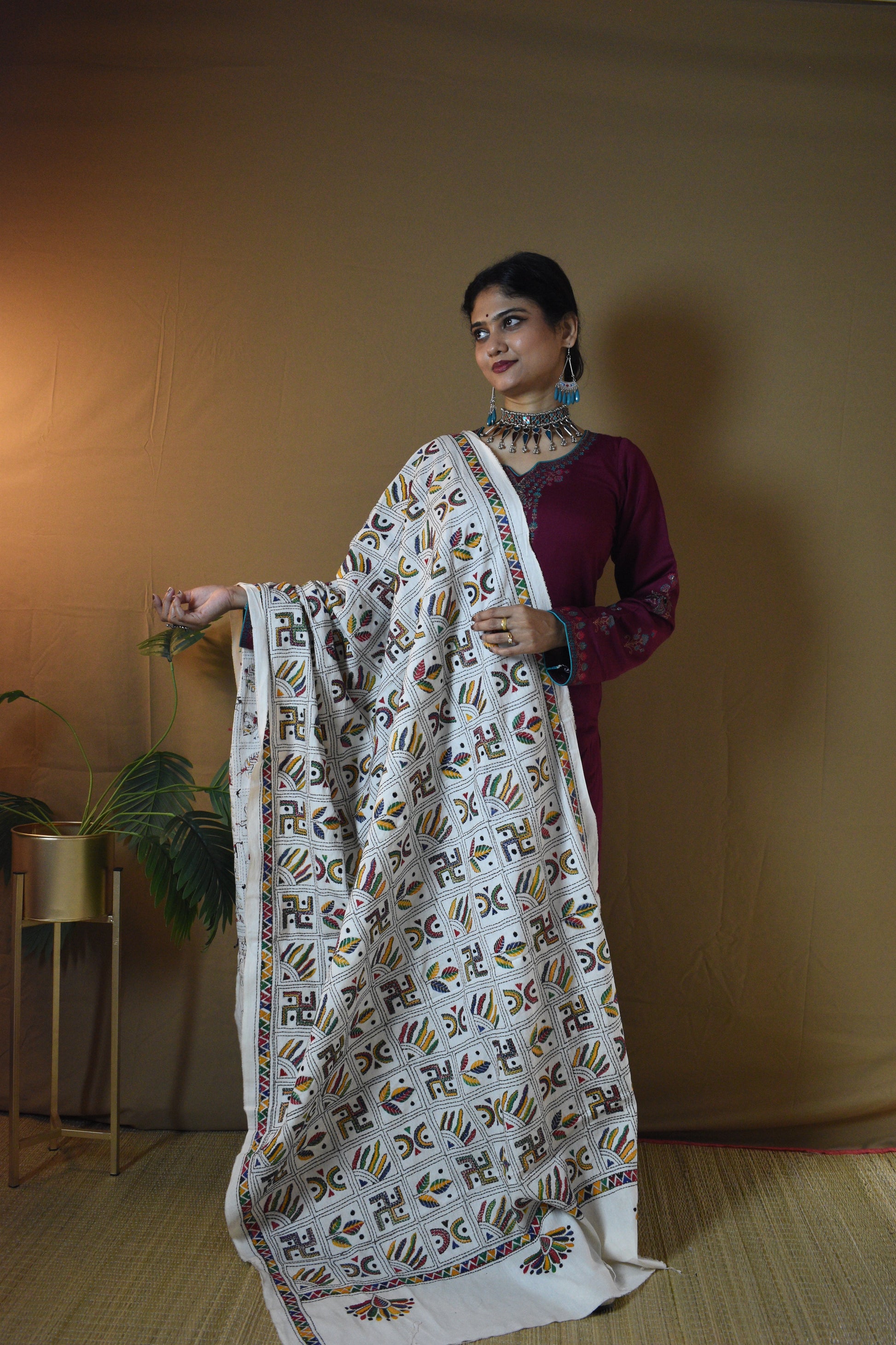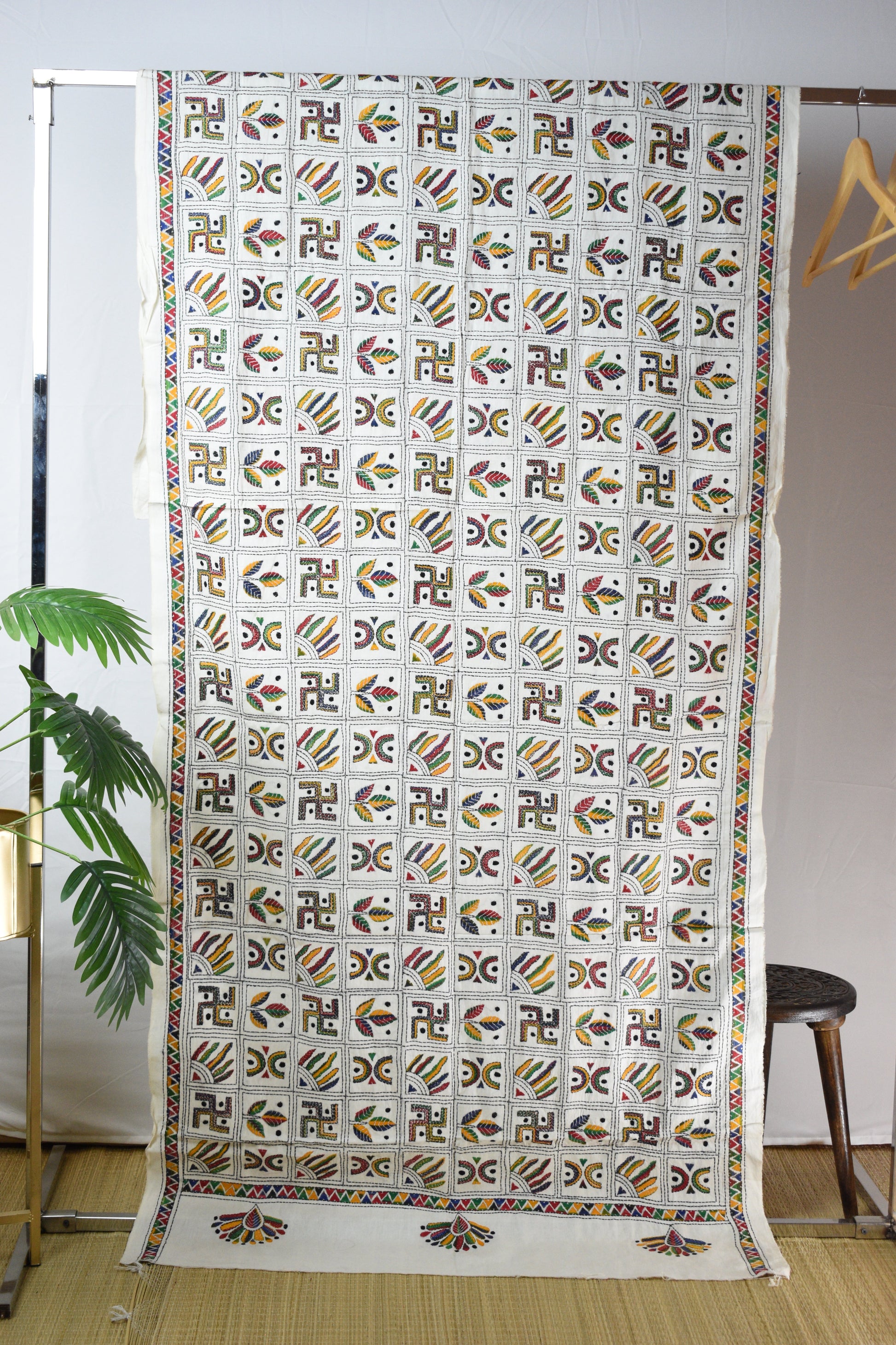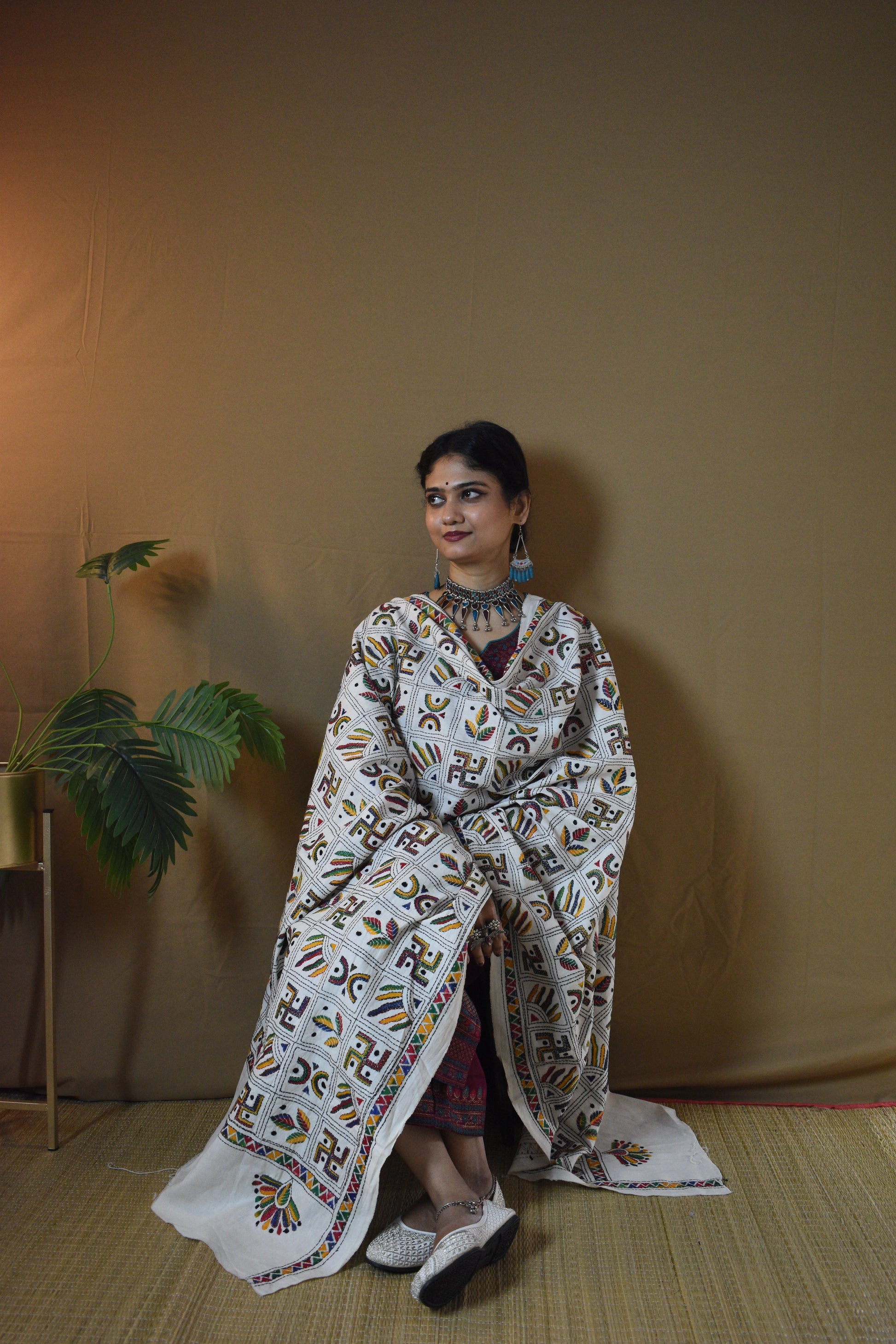 Experience the timeless charm of Bengal’s Kantha artistry with our Off White Swastik Pure Cotton Hand Embroidered Kantha Dupatta. Hand-embroidered by skilled women artisans, each dupatta is a celebration of patience and heritage, with running stitches that bring alive traditional motifs. The Pure Cotton fabric feels soft, airy, and light on the skin. The Off White base, accented with Multi-color threadwork, gives a graceful charm that blends effortlessly with traditional as well as contemporary looks. A Dupatta not just to wear, but to treasure, as art, as memory, as legacy.
