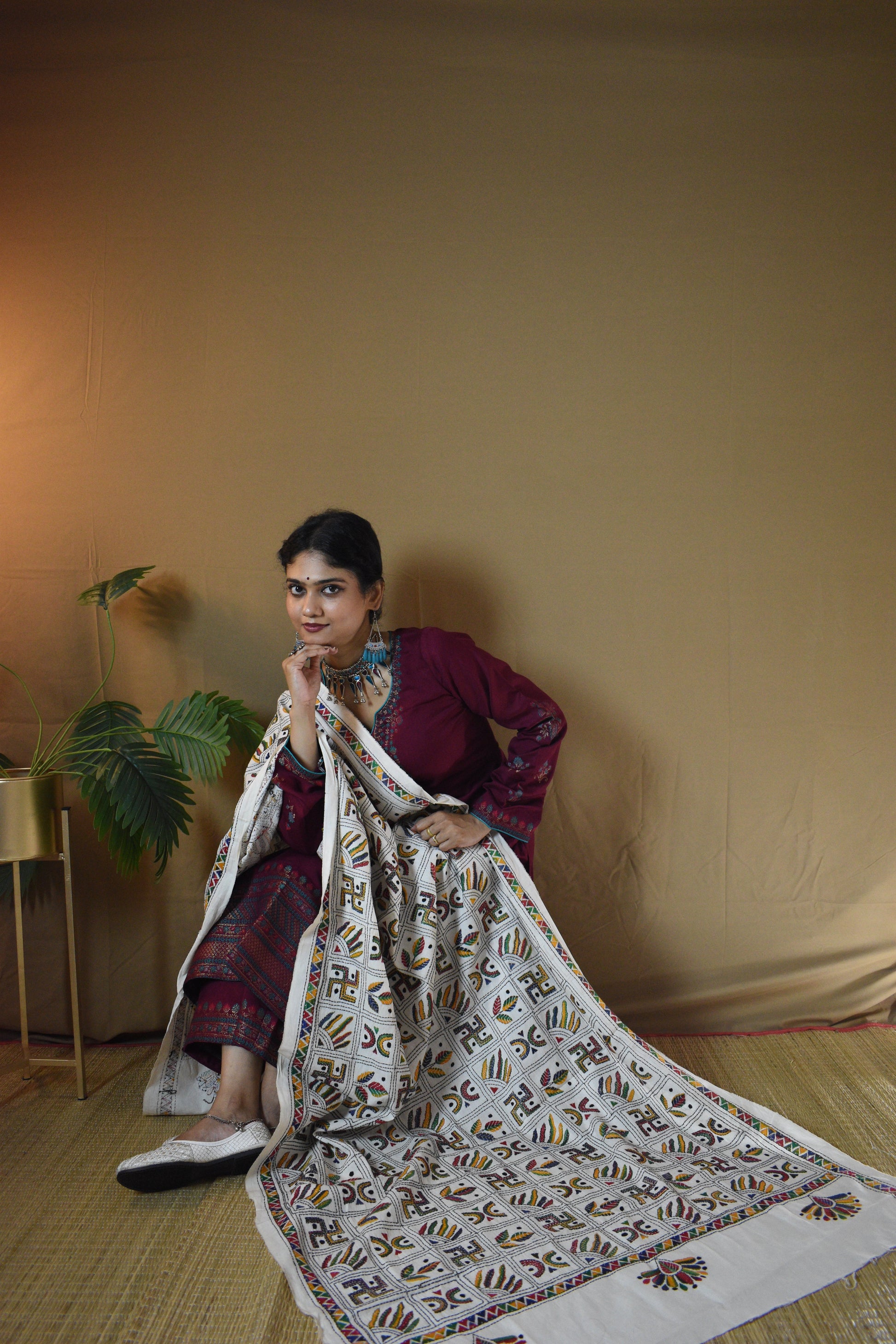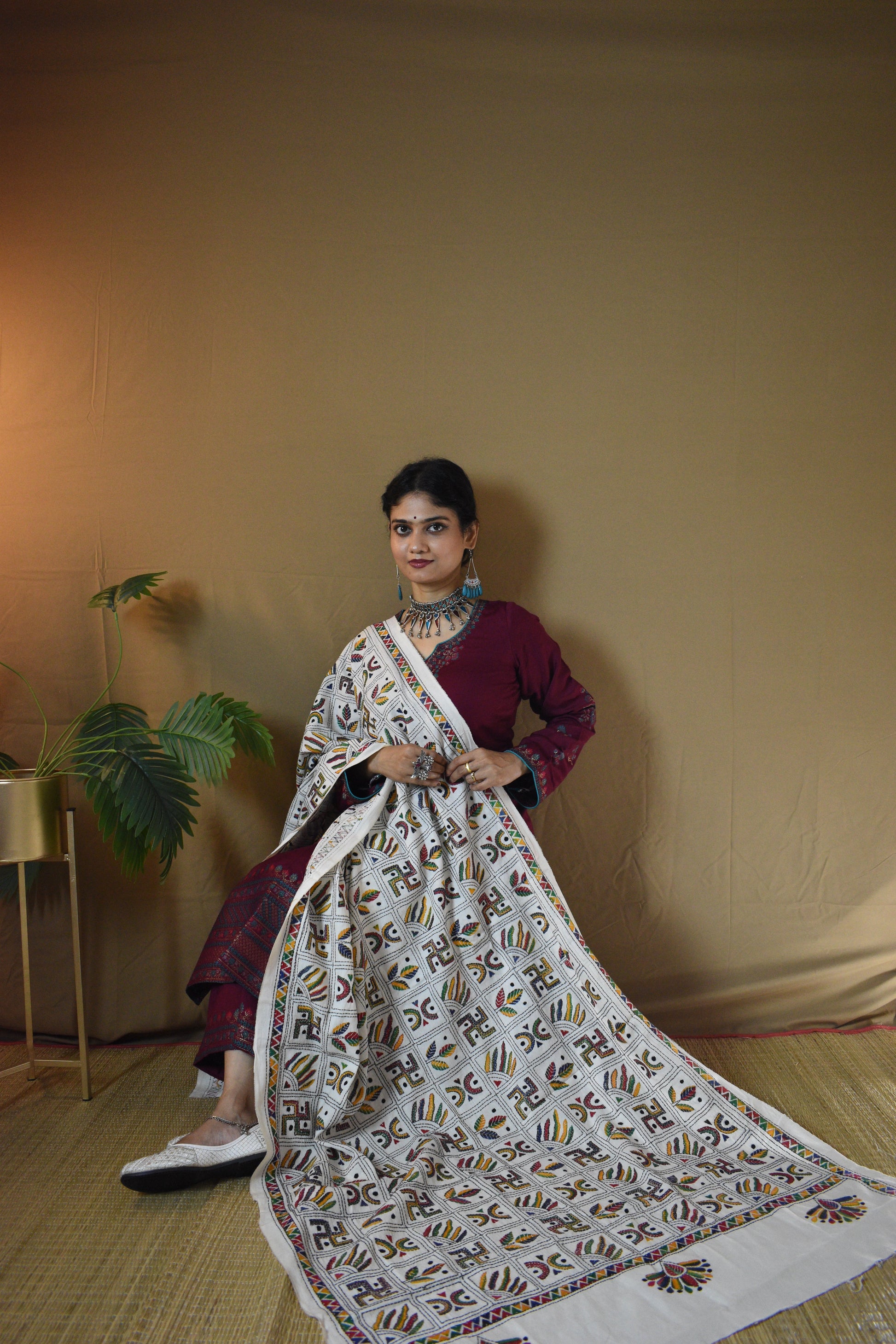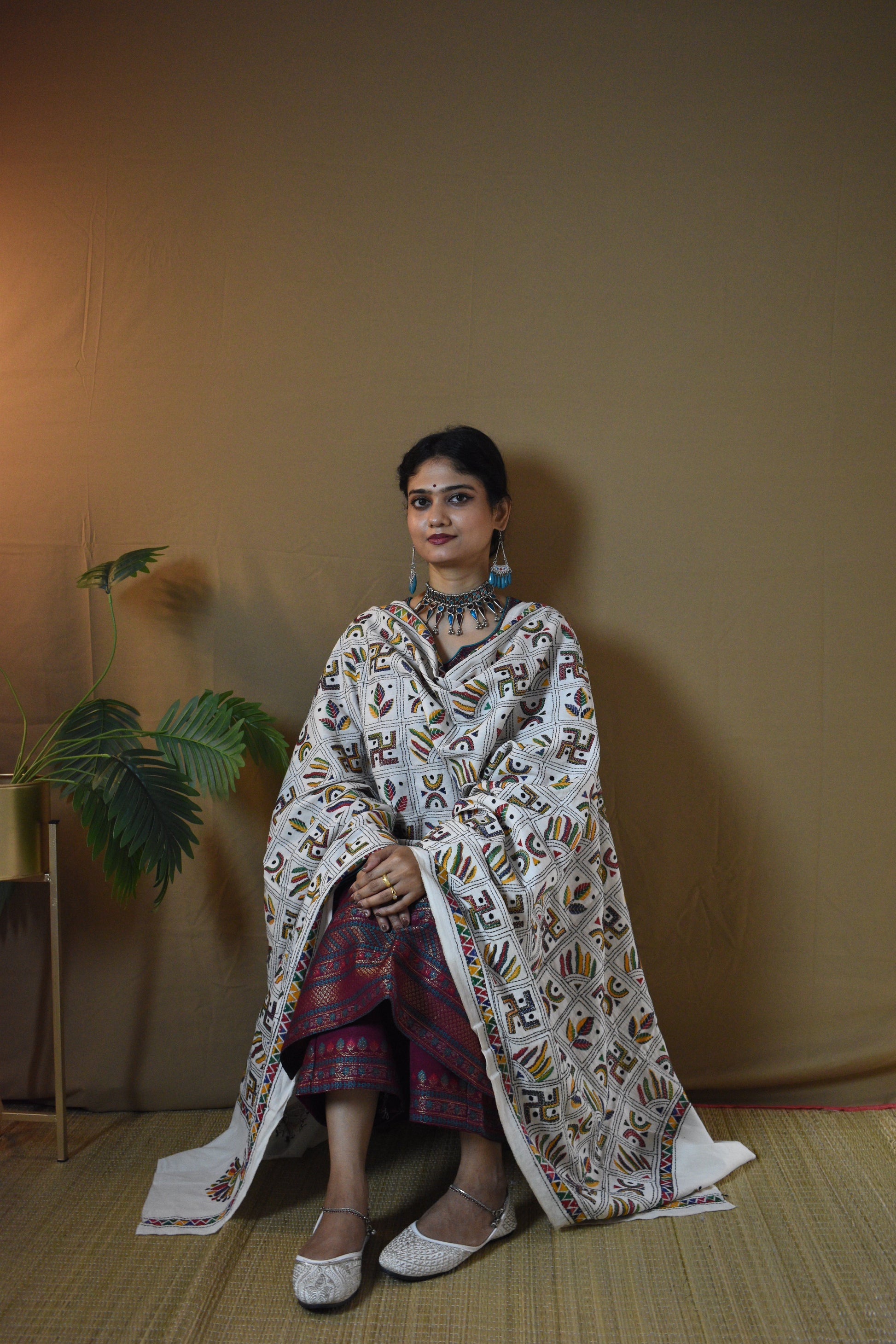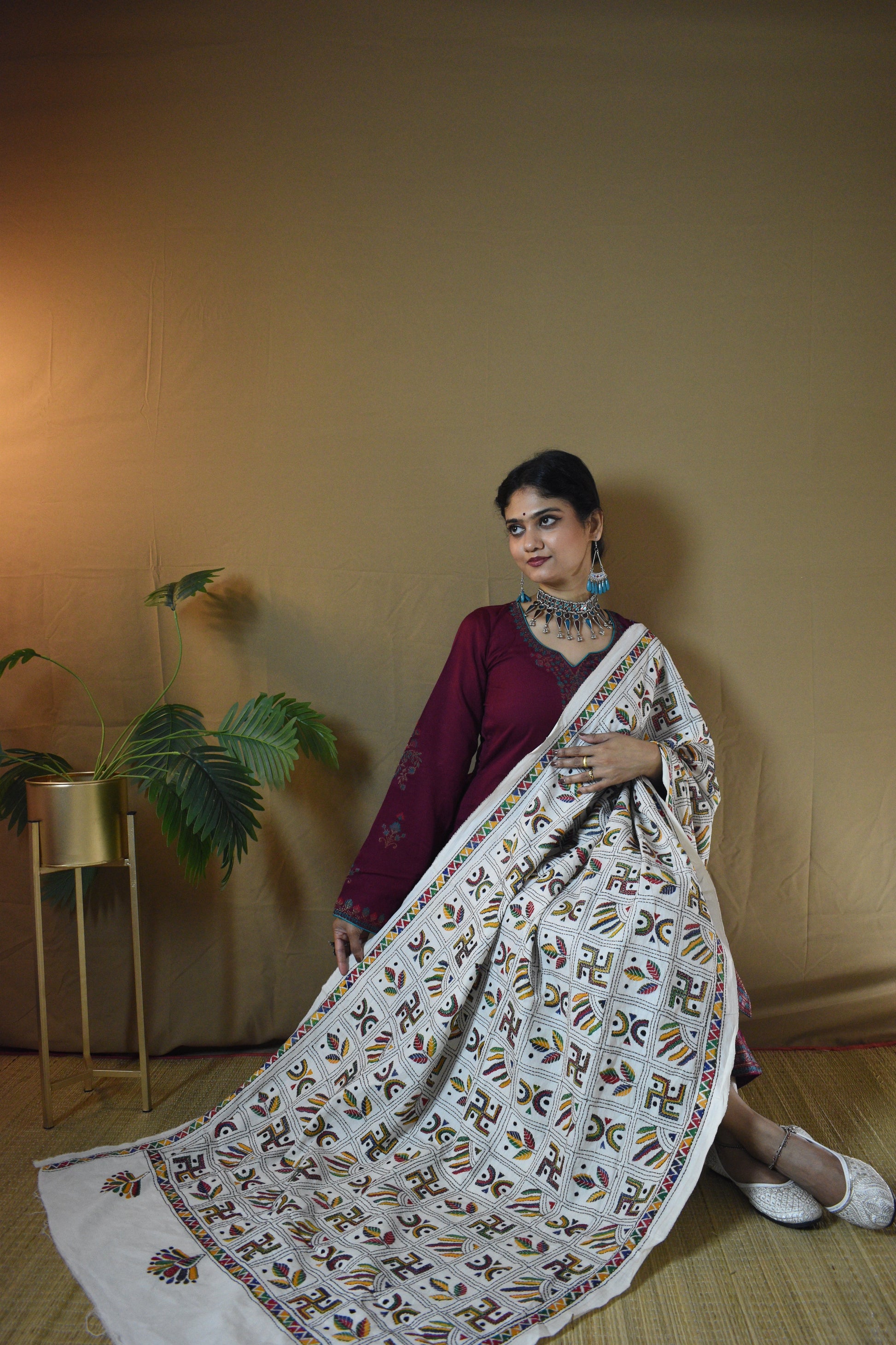 Experience the timeless charm of Bengal’s Kantha artistry with our Off White Swastik Pure Cotton Hand Embroidered Kantha Dupatta. Hand-embroidered by skilled women artisans, each dupatta is a celebration of patience and heritage, with running stitches that bring alive traditional motifs. The Pure Cotton fabric feels soft, airy, and light on the skin. The Off White base, accented with Multi-color threadwork, gives a graceful charm that blends effortlessly with traditional as well as contemporary looks. A Dupatta not just to wear, but to treasure, as art, as memory, as legacy.