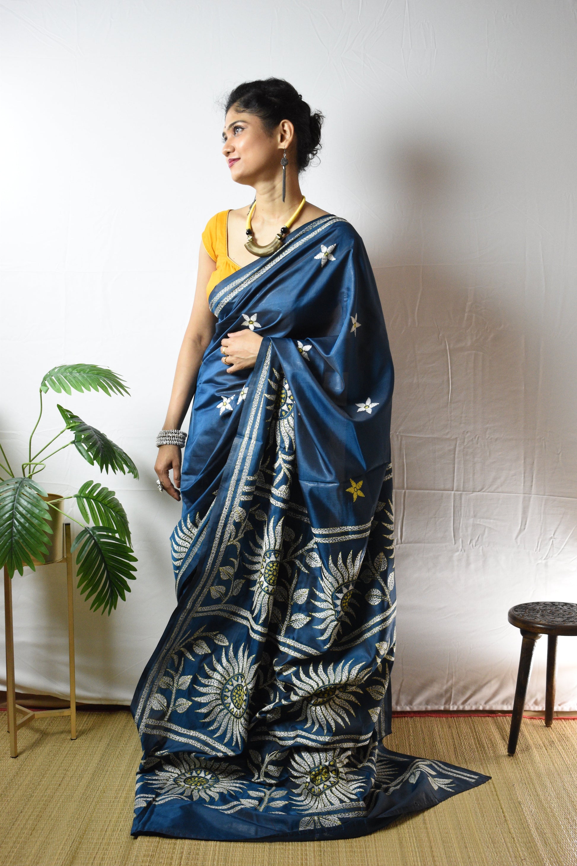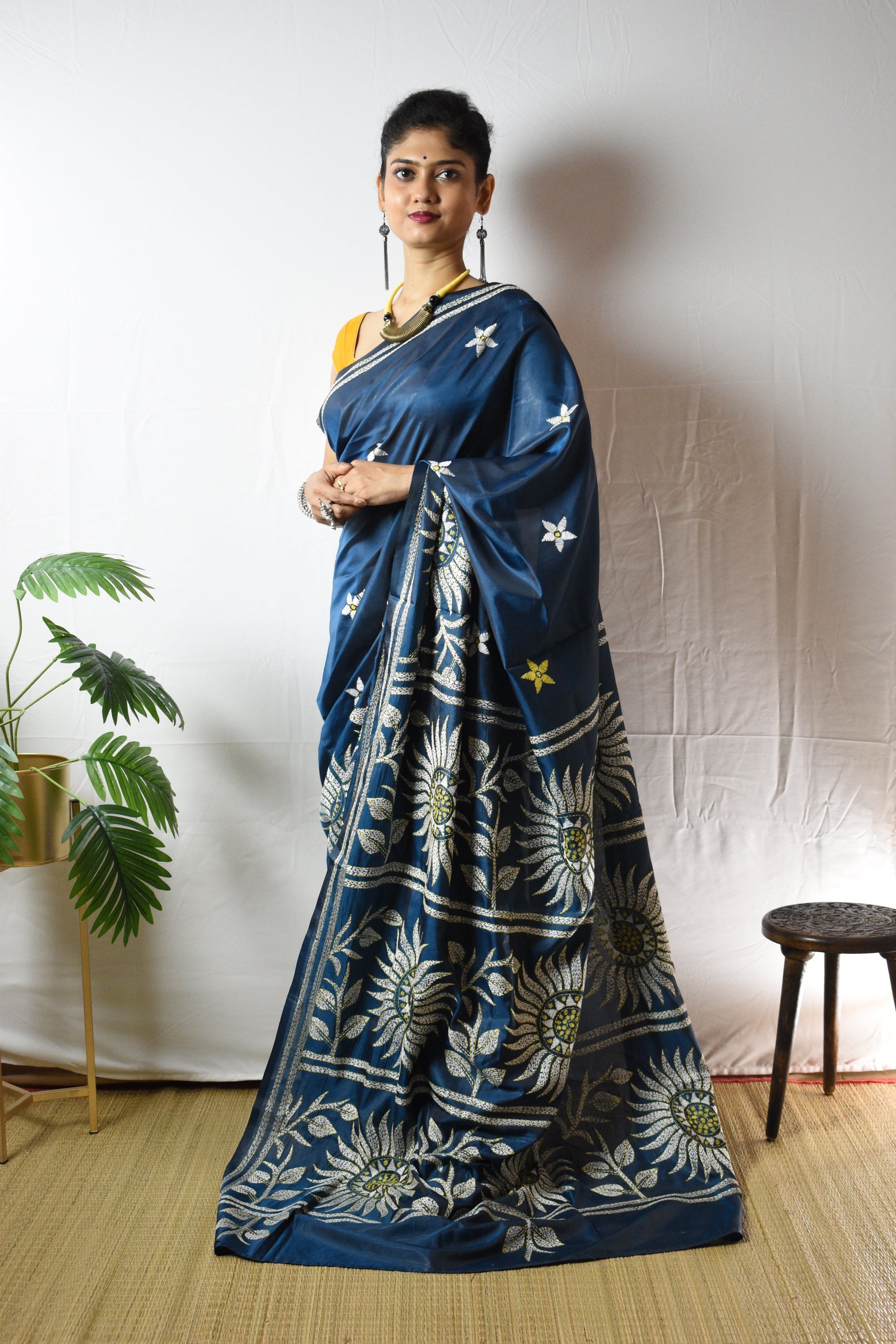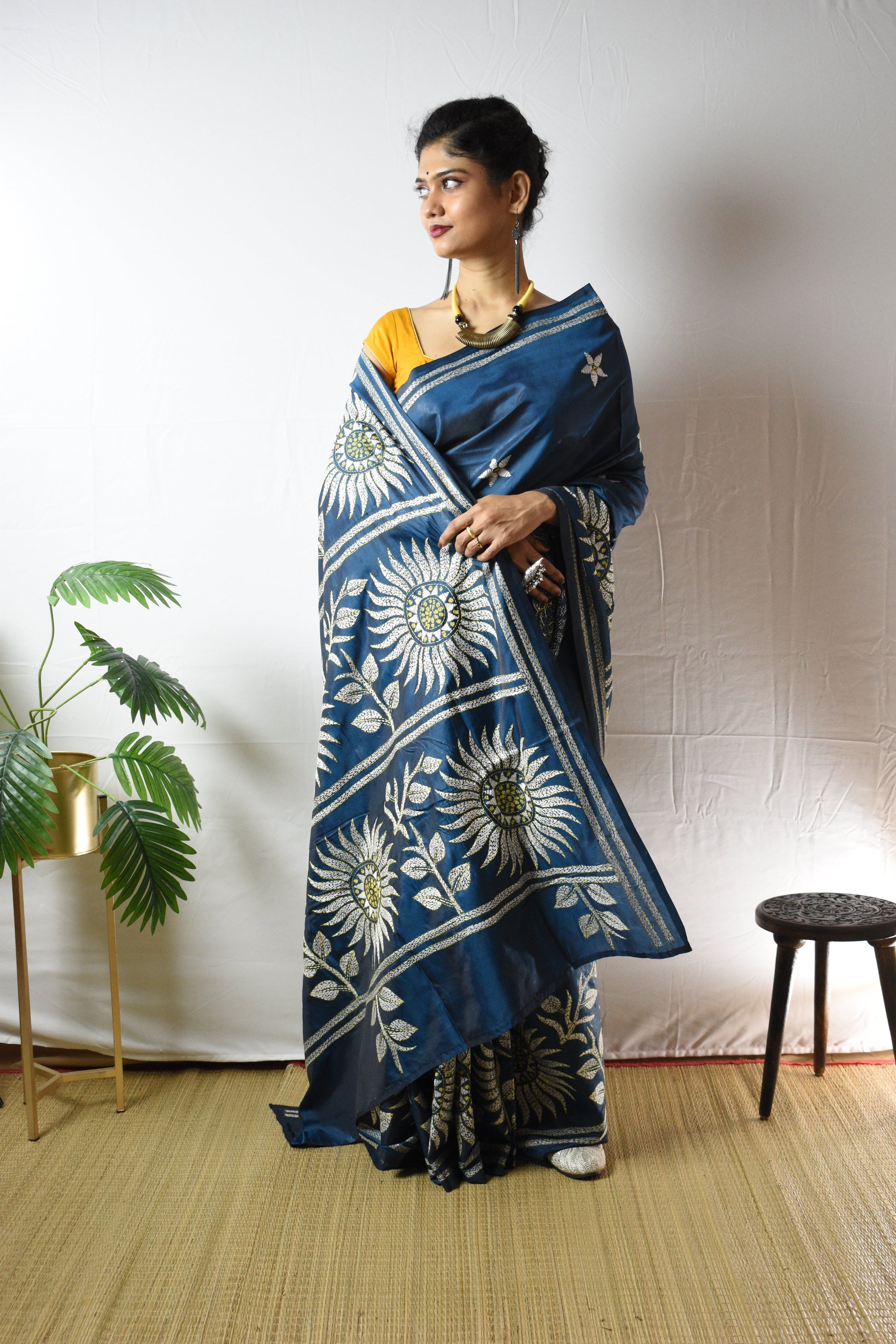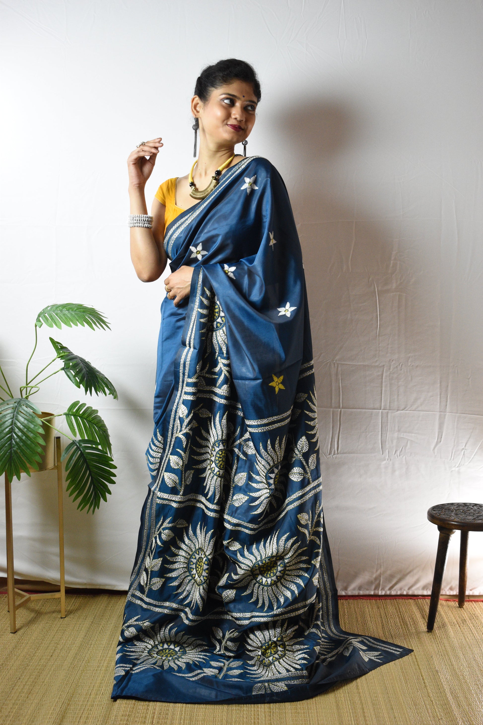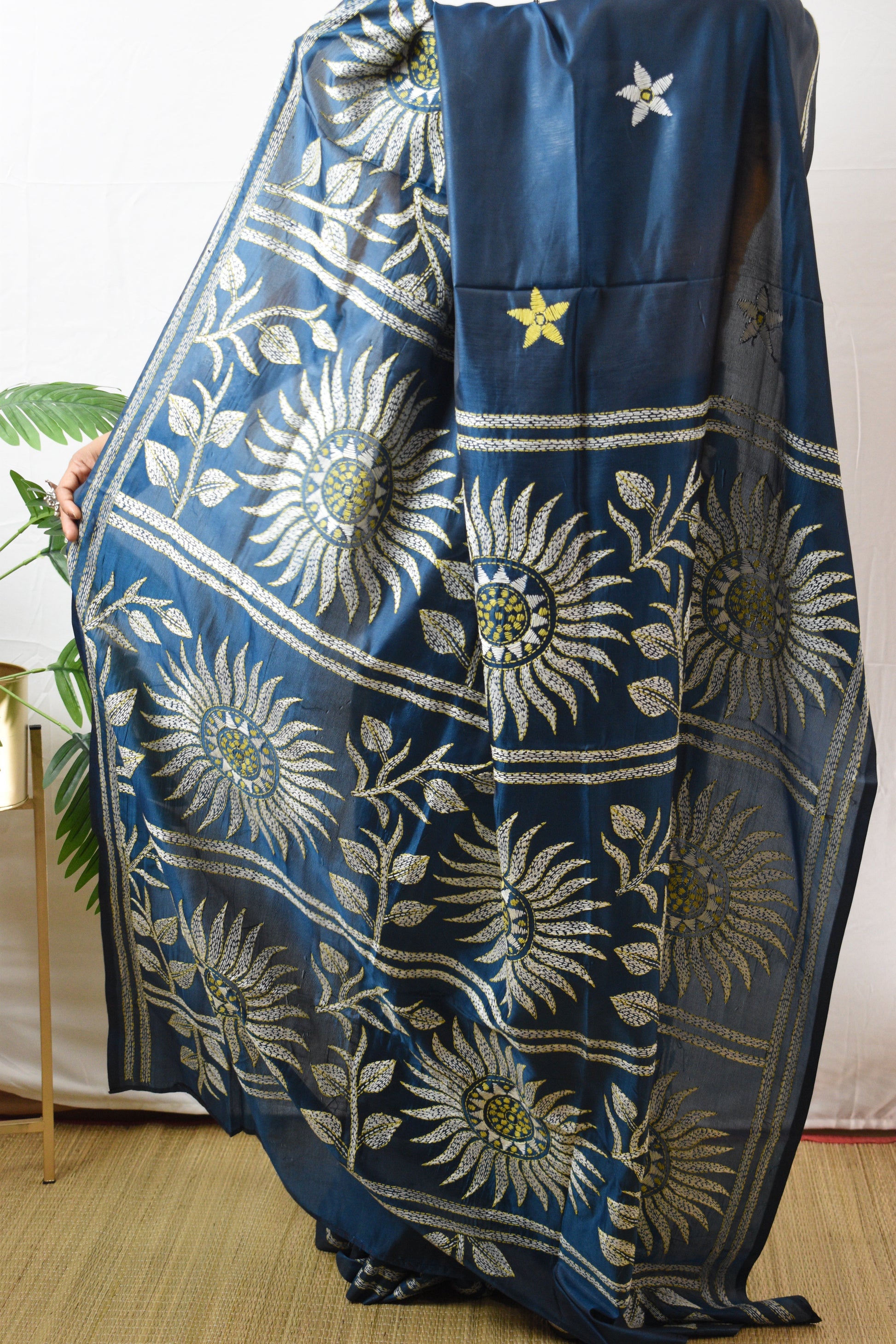 Discover the intricate beauty of our hand-embroidered Navy Blue Floral Hand Embroidered Kantha Silk Saree. Each piece is individually crafted by our talented women artisans using traditional kantha stitching and delicate kantha embroidery, turning fine silk into a one-of-a-kind artwork. The Navy Blue palette is lifted with White & Yellow threadwork along the border and pallu, elegant, timeless, and unmistakably handmade. A saree not just to wear, but to treasure, as art, as memory, as legacy.