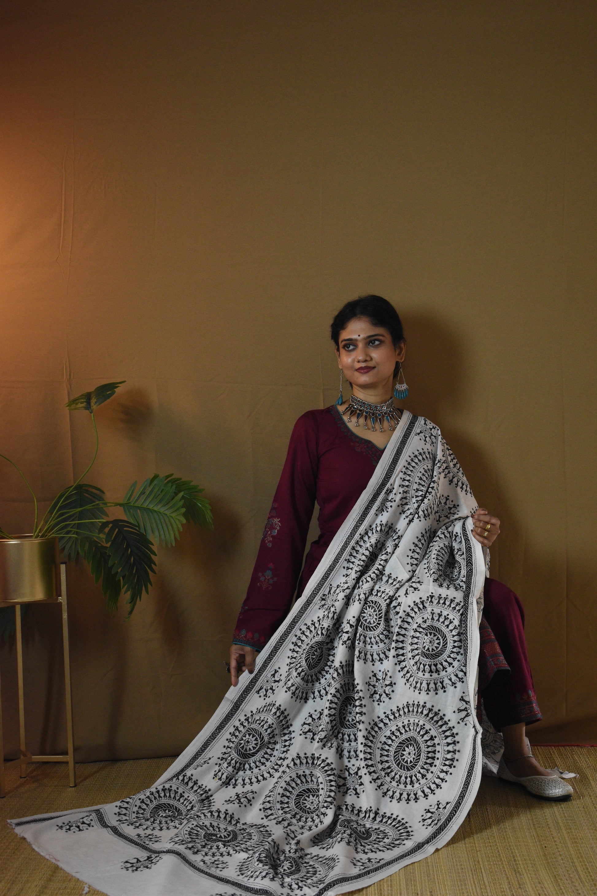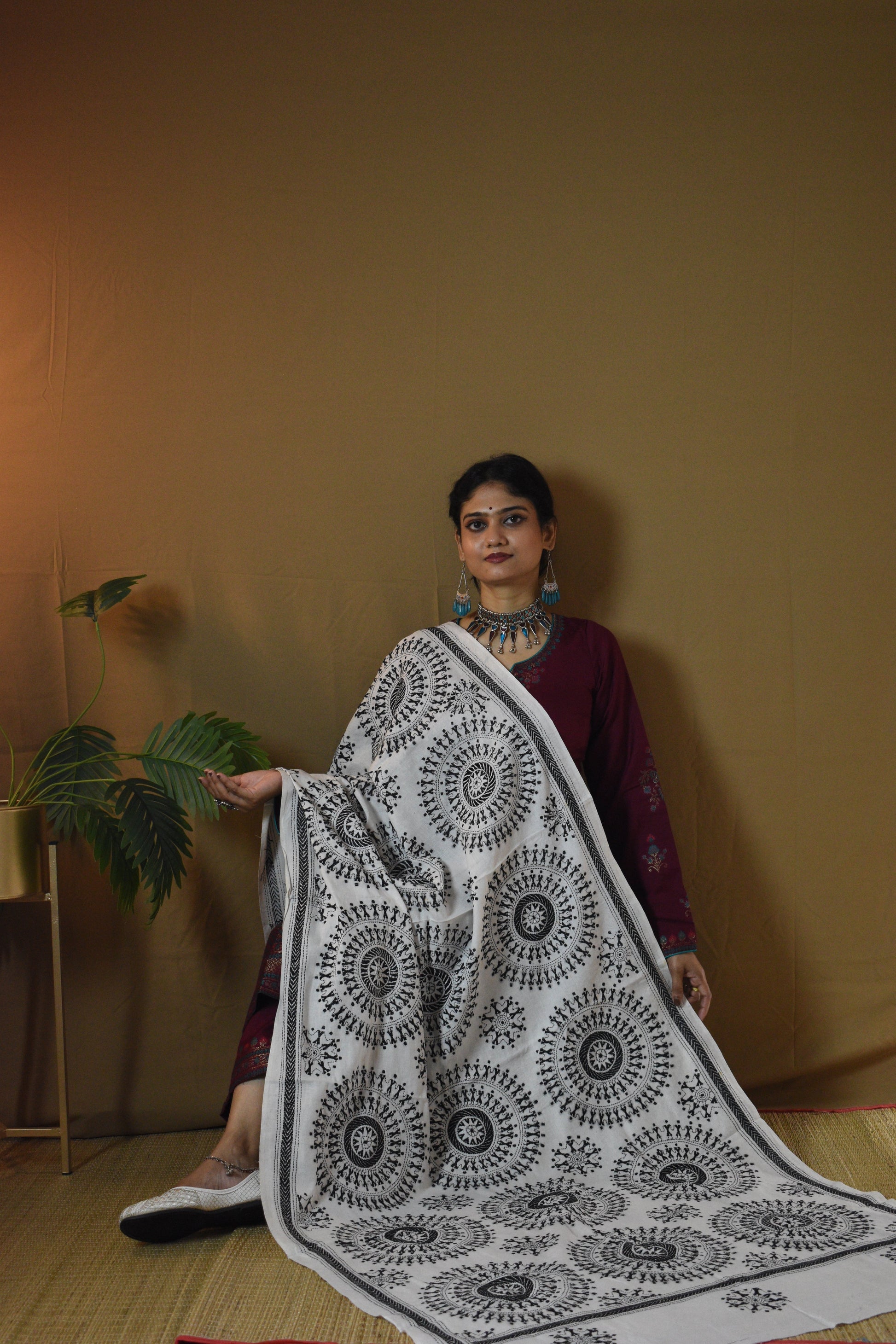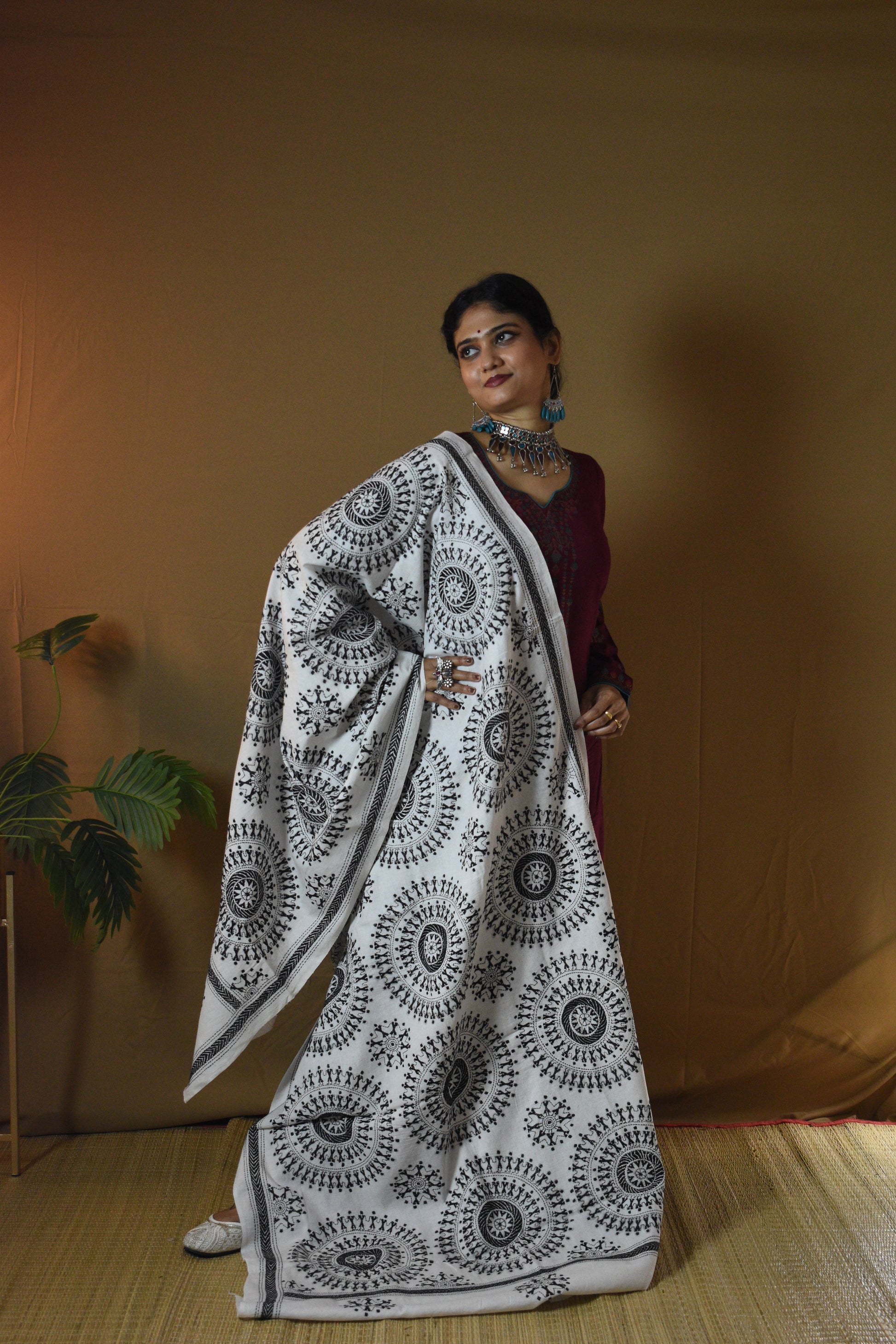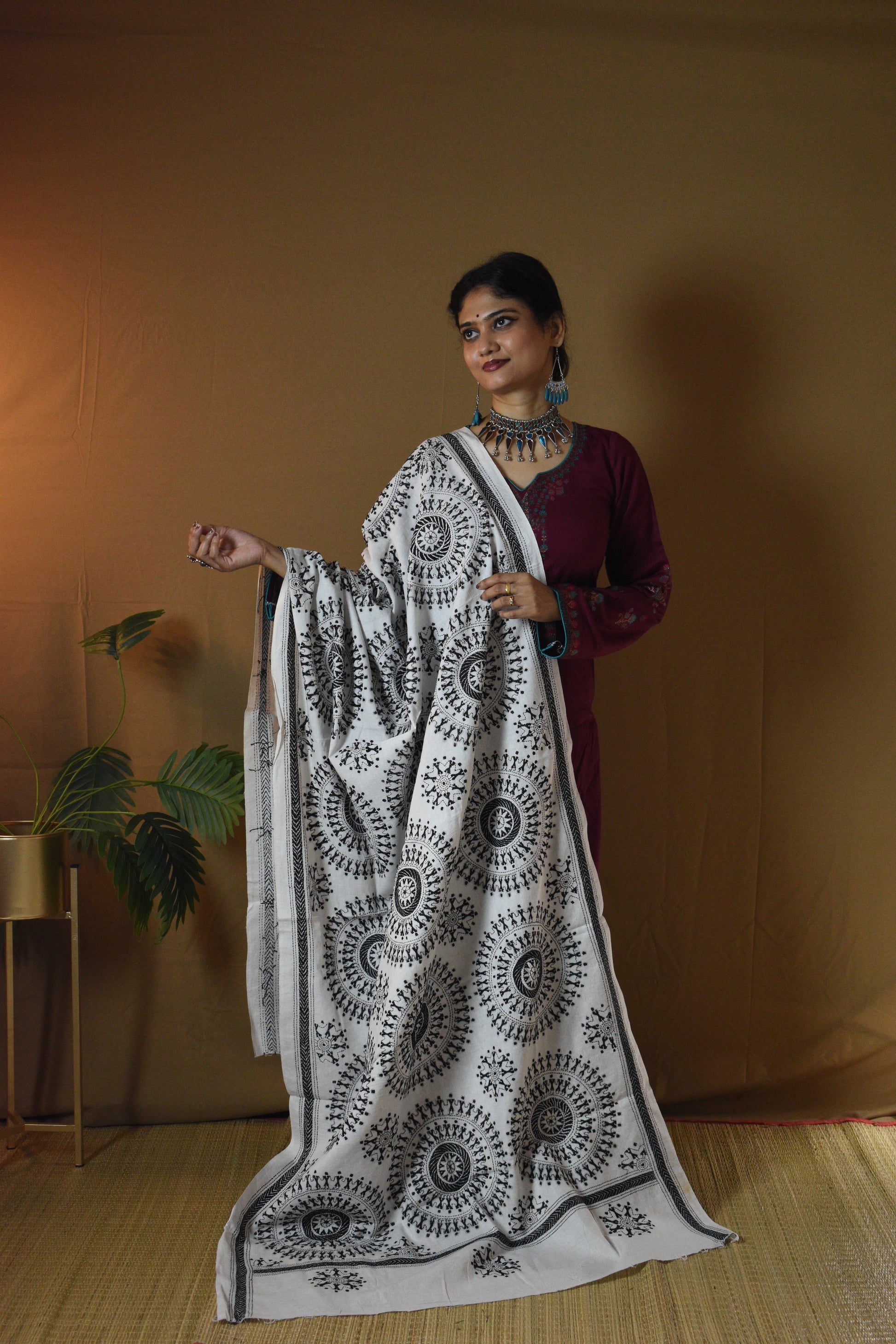 Experience the timeless charm of Bengal’s Kantha artistry with our White Warli Pure Cotton Hand Embroidered Kantha Dupatta. Hand-embroidered by skilled women artisans, each dupatta is a celebration of patience and heritage, with running stitches that bring alive traditional motifs. The Pure Cotton fabric feels soft, airy, and light on the skin. The White base, accented with Black color threadwork, gives a graceful charm that blends effortlessly with traditional as well as contemporary looks. A Dupatta not just to wear, but to treasure, as art, as memory, as legacy.