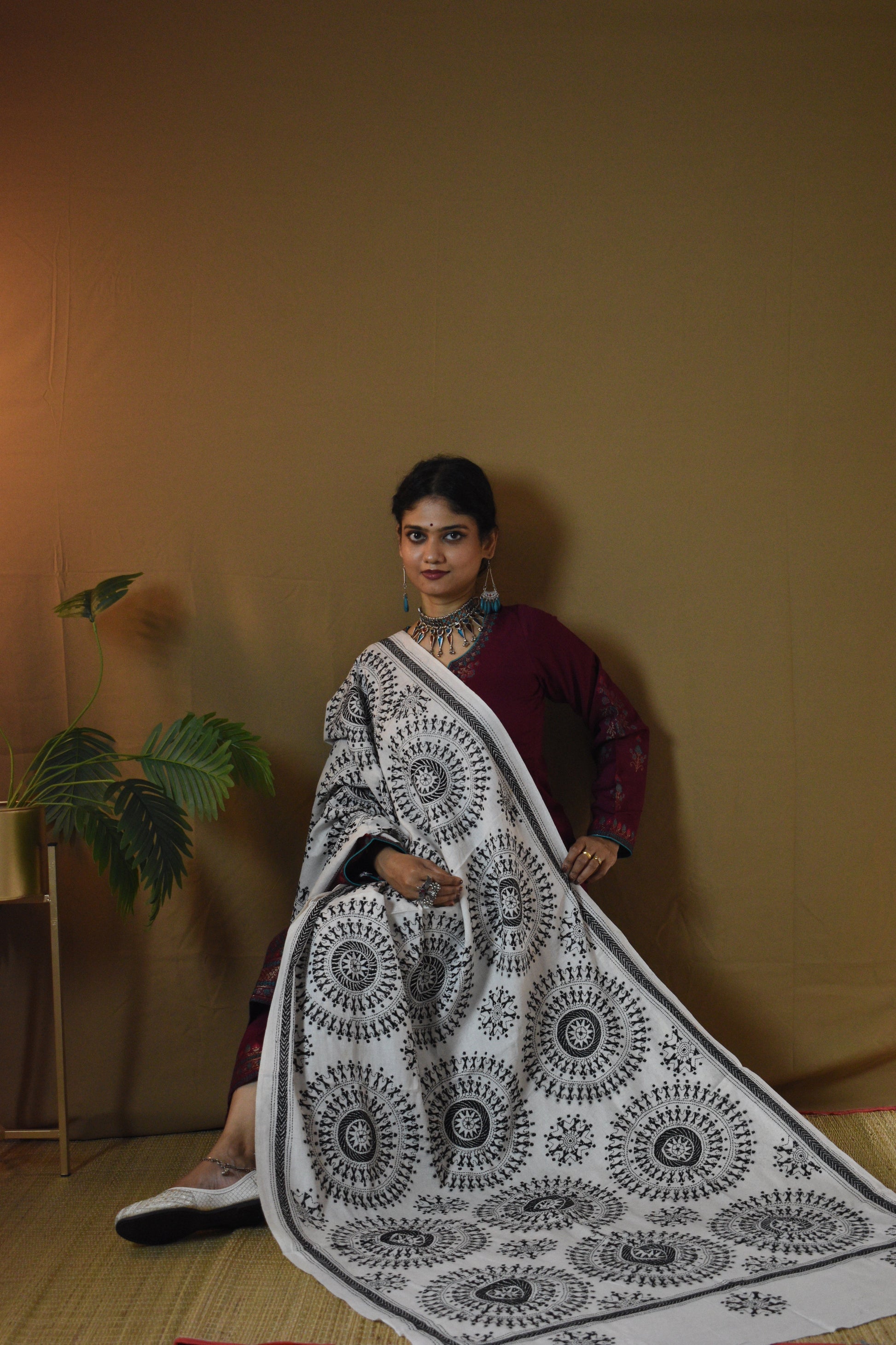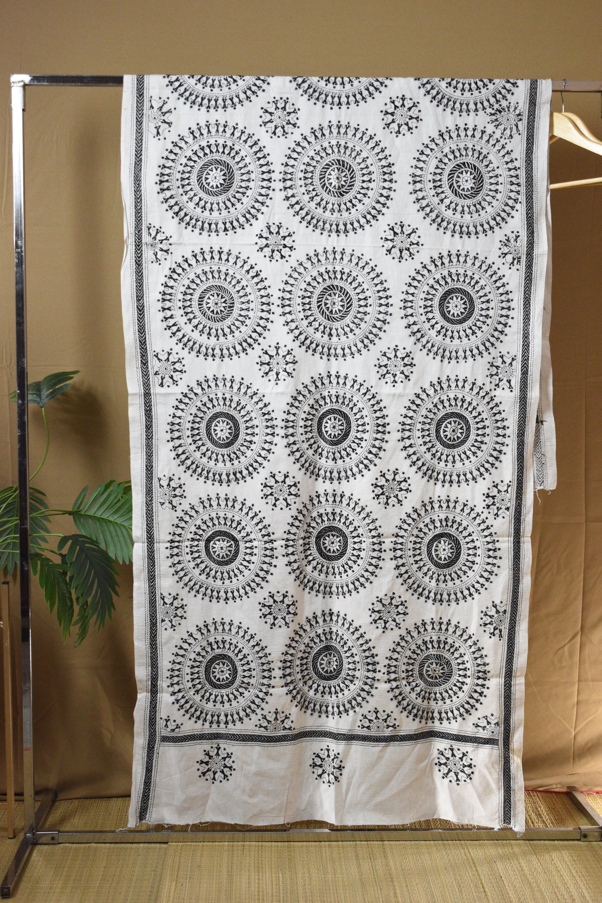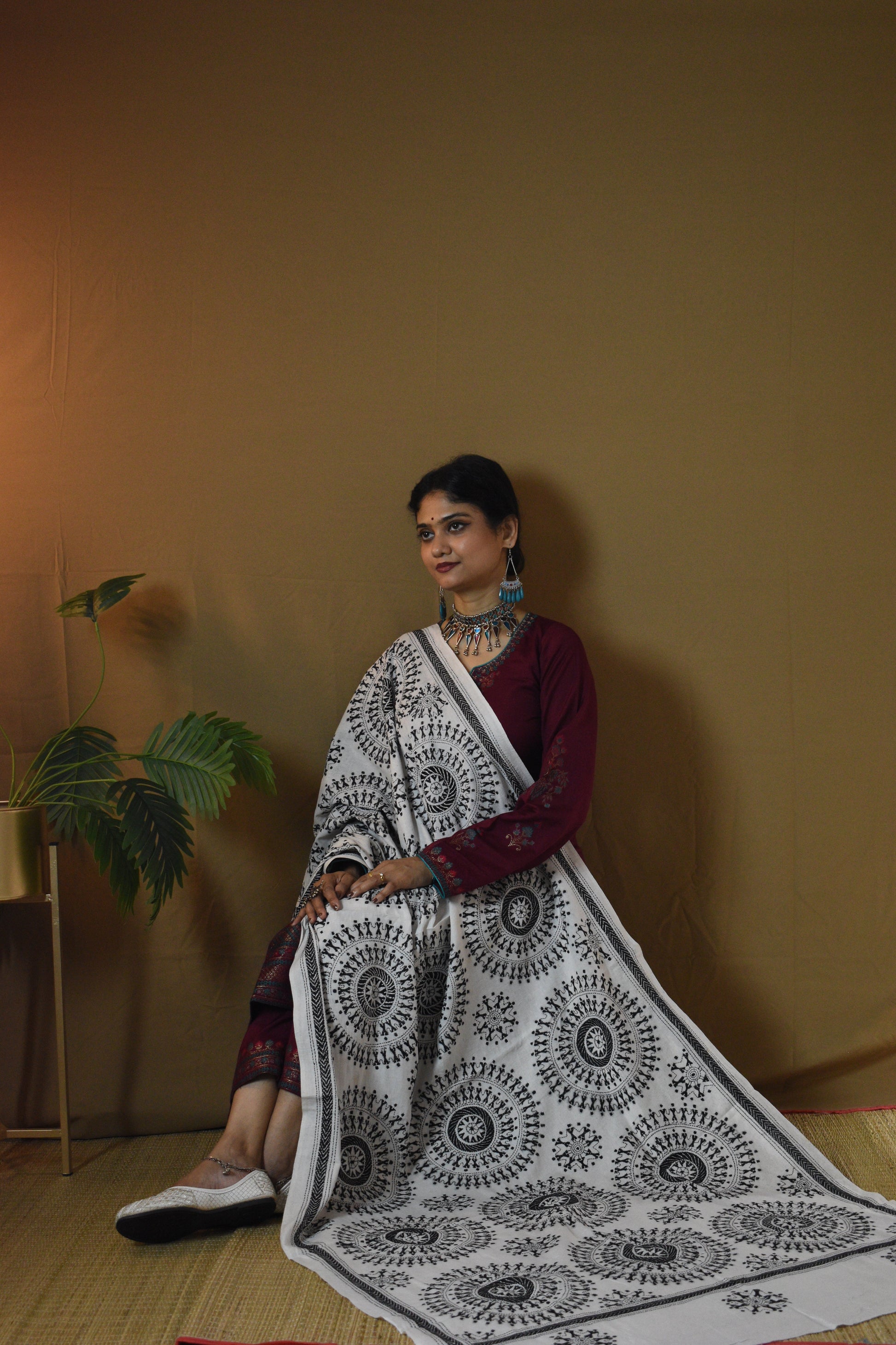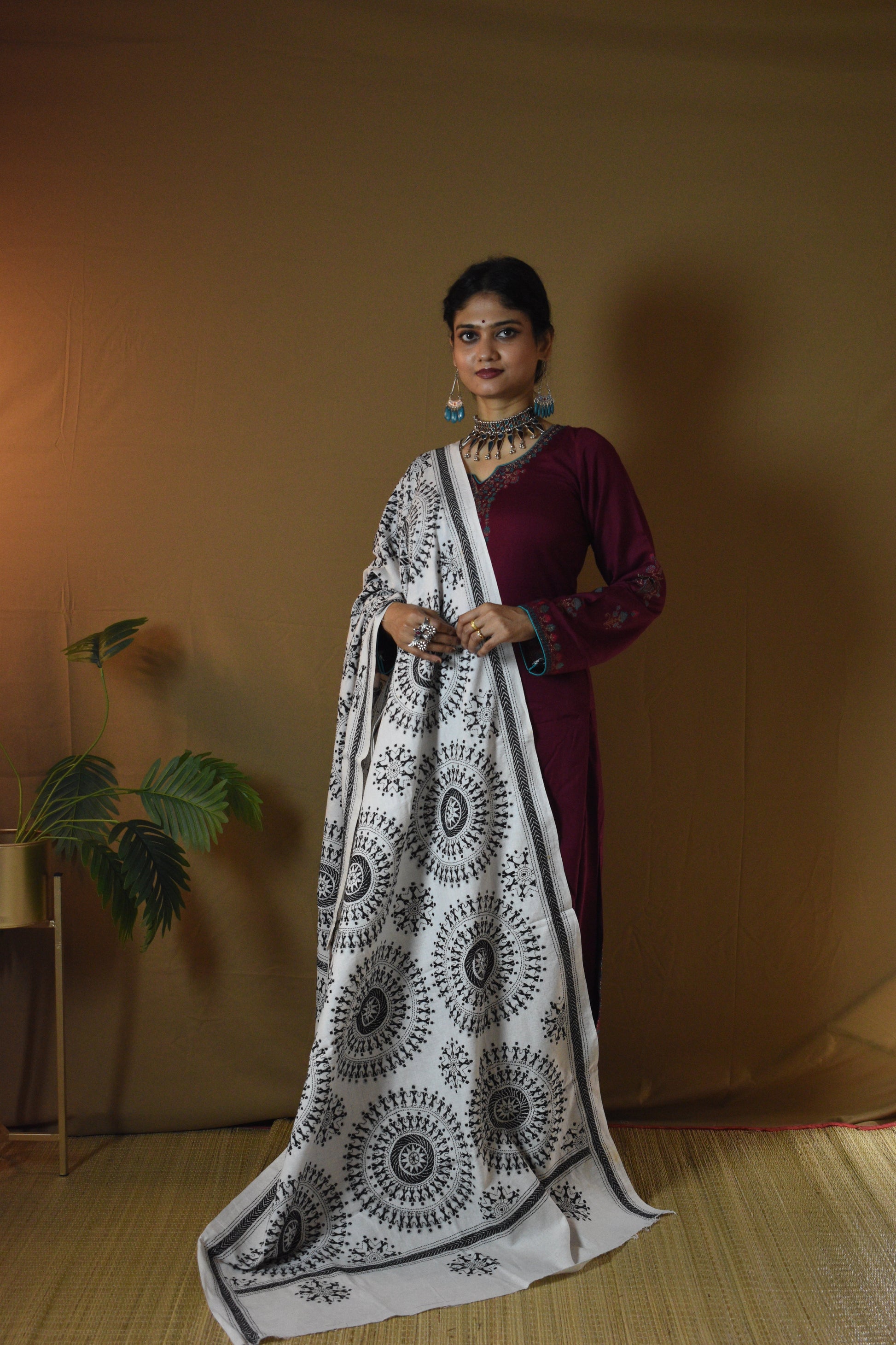 Experience the timeless charm of Bengal’s Kantha artistry with our White Warli Pure Cotton Hand Embroidered Kantha Dupatta. Hand-embroidered by skilled women artisans, each dupatta is a celebration of patience and heritage, with running stitches that bring alive traditional motifs. The Pure Cotton fabric feels soft, airy, and light on the skin. The White base, accented with Black color threadwork, gives a graceful charm that blends effortlessly with traditional as well as contemporary looks. A Dupatta not just to wear, but to treasure, as art, as memory, as legacy.